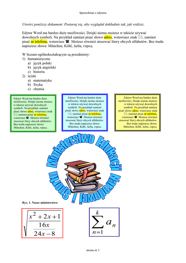 Sprawdzian z edytora Utwórz poniższy dokument. Postaraj się, aby wyglądał dokładnie tak, jak widzisz. Edytor Word ma bardzo duże możliwości. Dzięki niemu możesz w tekście używać dowolnych symboli. Na przykład zamiast pisać słowo adres, wstawiasz znak ; zamiast pisać nr telefonu, wstawiasz . Możesz również stosować litery obcych alfabetów. Bez trudu napiszesz słowa: München, Köhl, Δelta, город. W liceum ogólnokształcącym są przedmioty: 1) humanistyczne a) język polski b) język angielski c) historia 2) ścisłe a) matematyka b) fizyka c) chemia Edytor Word ma bardzo duże możliwości. Dzięki niemu możesz w tekście używać dowolnych symboli. Na przykład, zamiast pisać słowo adres, wstawiasz znak ; zamiast pisać nr telefonu, wstawiasz . Możesz również stosować litery obcych alfabetów. Bez trudu napiszesz słowa: München, Köhl, Δelta, город. Edytor Word ma bardzo duże możliwości. Dzięki niemu możesz w tekście używać dowolnych symboli. Na przykład zamiast pisać słowo adres, wstawiasz znak ; zamiast pisać nr telefonu, wstawiasz . Możesz również stosować litery obcych alfabetów. Bez trudu napiszesz słowa: München, Köhl, Δelta, город. Edytor Word ma bardzo duże możliwości. Dzięki niemu możesz w tekście używać dowolnych symboli. Na przykład zamiast pisać słowo adres, wstawiasz znak ; zamiast pisać nr telefonu, wstawiasz . Możesz również stosować litery obcych alfabetów. Bez trudu napiszesz słowa: München, Köhl, Δelta, город. Rys. 1. Nasze ministerstwo x2 2x 1 16 x 24 x 8 k an n 1 strona nr 1