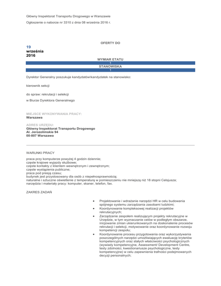 Główny Inspektorat Transportu Drogowego w Warszawie Ogłoszenie o naborze nr 3310 z dnia 08 września 2016 r. OFERTY DO 19 września 2016 WYMIAR ETATU 1 STANOWISKA 1 Dyrektor Generalny poszukuje kandydatów\kandydatek na stanowisko: kierownik sekcji do spraw: rekrutacji i selekcji w Biurze Dyrektora Generalnego MIEJSCE WYKONYWANIA PRACY: Warszawa ADRES URZĘDU: Główny Inspektorat Transportu Drogowego Al. Jerozolimskie 94 00-807 Warszawa WARUNKI PRACY praca przy komputerze powyżej 4 godzin dziennie; częste krajowe wyjazdy służbowe; częste kontakty z klientem wewnętrznym i zewnętrznym; częste wystąpienia publiczne; praca pod presją czasu; budynek jest przystosowany dla osób z niepełnosprawnością; naturalne i sztuczne oświetlenie z temperaturą w pomieszczeniu nie mniejszą niż 18 stopni Celsjusza; narzędzia i materiały pracy: komputer, skaner, telefon, fax. ZAKRES ZADAŃ Projektowanie i wdrażanie narzędzi HR w celu budowania spójnego systemu zarządzania zasobami ludzkimi; Koordynowanie kompleksowej realizacji projektów rekrutacyjnych; Zarządzanie zespołem realizującym projekty rekrutacyjne w Urzędzie, w tym wyznaczanie celów w podległym obszarze, inicjowanie zmian ukierunkowanych na doskonalenie procesów rekrutacji i selekcji, motywowanie oraz koordynowanie rozwoju kompetencji zespołu; Koordynowanie procesu przygotowania oraz wykorzystywania poszczególnych narzędzi umożliwiających ewaluację kryteriów kompetencyjnych oraz stałych właściwości psychologicznych (wywiady kompetencyjne, Assessment/ Development Centre, testy zdolności, kwestionariusze psychologiczne, testy kompetencyjne) w celu zapewnienia trafności podejmowanych decyzji personalnych; Prowadzenie i monitorowanie oceny kompetencji kandydatów na wyższe stanowiska w Inspektoracie oraz kandydatów na inne kluczowe stanowiska w celu zapewnienia realizacji zadań Urzędu przez osoby o pożądanych kompetencjach i predyspozycjach; Nadzorowanie i organizacja zadań związanych z odbywaniem praktyk i staży w Urzędzie, w tym współpraca z urzędami pracy oraz uczelniami wyższymi; Koordynowanie i udział w projektach z obszaru zarządzania zasobami ludzkimi m.in. związanych z procesem adaptacji nowozatrudnionych pracowników oraz budowaniem wizerunku Urzędu jako pracodawcy z wyboru w celu zwiększenia trafności działań rekrutacyjnych. WYMAGANIA NIEZBĘDNE Wykształcenie: wyższe na kierunku psychologia doświadczenie zawodowe: 2 lata doświadczenia w komórce personalnej Znajomość przepisów: ustawy o służbie cywilnej wraz z aktami wykonawczymi, ustawy o pracownikach urzędów państwowych wraz z aktami wykonawczymi, ustawy – Kodeks Pracy, ustawy o promocji zatrudnienia i instytucjach rynku pracy, ustawy o ochronie danych osobowych, ustawy o wdrożeniu przepisów Unii Europejskiej w zakresie równego traktowania; Znajomość struktury organizacyjnej Głównego Inspektoratu Transportu Drogowego; Znajomość rozwiązań z obszaru ZZL, w tym w szczególności narzędzi rekrutacji i selekcji, employer branding’u oraz onboarding’u; Orientacja na klienta; Dzielenie się wiedzą i doświadczeniem; Motywowanie; Delegowanie; Kierowanie; Ocena i rozwój pracowników; Rozwiązywanie konfliktów; Podejmowanie decyzji; Myślenie analityczne; Zarządzanie projektami. Posiadanie obywatelstwa polskiego Korzystanie z pełni praw publicznych Nieskazanie prawomocnym wyrokiem za umyślne przestępstwo lub umyśle przestępstwo skarbowe WYMAGANIA DODATKOWE doświadczenie zawodowe: 2 lata doświadczenia w obszarze rekrutacji i selekcji pracowników Studia podyplomowe z zakresu zarządzania zasobami ludzkimi; Język angielski – co najmniej na poziomie B2; Znajomość przepisów ustawy prawo zamówień publicznych. DOKUMENTY I OŚWIADCZENIA NIEZBĘDNE Życiorys/CV i list motywacyjny Kopie dokumentów potwierdzających spełnienie wymagania niezbędnego w zakresie wykształcenia Kopie dokumentów potwierdzających spełnienie wymagania niezbędnego w zakresie doświadczenia zawodowego / stażu pracy Oświadczenie o posiadaniu obywatelstwa polskiego albo kopia dokumentu potwierdzającego posiadanie polskiego obywatelstwa Oświadczenie o wyrażeniu zgody na przetwarzanie danych osobowych do celów naboru Oświadczenie o korzystaniu z pełni praw publicznych Oświadczenie o nieskazaniu prawomocnym wyrokiem za umyślne przestępstwo lub umyślne przestępstwo skarbowe DOKUMENTY I OŚWIADCZENIA DODATKOWE kopia dokumentu potwierdzającego niepełnosprawność - w przypadku kandydatek/kandydatów, zamierzających skorzystać z pierwszeństwa w zatrudnieniu w przypadku, gdy znajdą się w gronie najlepszych kandydatek/kandydatów Kopie dokumentów potwierdzających spełnienie wymagania dodatkowego w zakresie doświadczenia zawodowego / stażu pracy kopie dokumentów potwierdzających spełnienie wymagań dodatkowych; TERMINY I MIEJSCE SKŁADANIA DOKUMENTÓW Dokumenty należy złożyć do: 19 września 2016 r. Decyduje data: stempla pocztowego / osobistego dostarczenia oferty do urzędu Miejsce składania dokumentów: Główny Inspektorat Transportu Drogowego Biuro Dyrektora Generalnego Al. Jerozolimskie 94 00-807 Warszawa z dopiskiem na kopercie i w liście motywacyjny: BDG.110.54.2016.0308. INNE INFORMACJE: W miesiącu poprzedzającym datę upublicznienia ogłoszenia wskaźnik zatrudnienia osób niepełnosprawnych w urzędzie, w rozumieniu przepisów o rehabilitacji zawodowej i społecznej oraz zatrudnianiu osób niepełnosprawnych, nie wynosi co najmniej 6%.Prosimy o napisanie w liście motywacyjnym, jakiego ogłoszenia dotyczy oferta–numer podany w „miejscu składania dokumentów”. Kandydaci zakwalifikowani zostaną powiadomieni o terminie postępowania rekrutacyjnego. Oferty przesłane drogą elektroniczną nie opatrzone bezpiecznym podpisem elektronicznym lub faksem lub otrzymane po terminie lub nie spełniające wymagań określonych w ogłoszeniu nie będą rozpatrywane. Oferty odrzucone zo