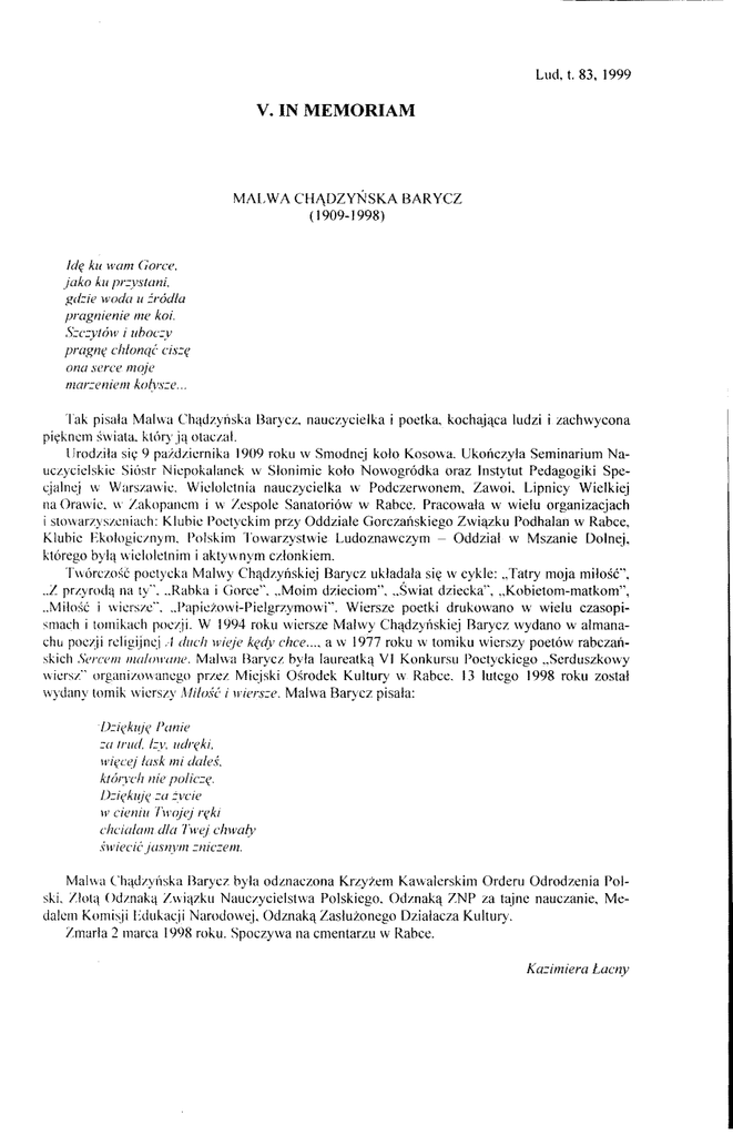 Twórczość poetycka Malwy Chądzyńskiej Barycz układała się w cykle: .,Tatry moja miłość",