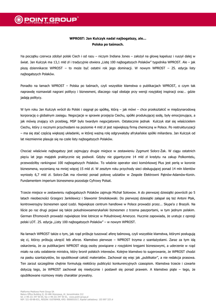 WPROST: Jan Kulczyk nadal najbogatszy, ale… Polska po taśmach. Na początku czerwca zdobył polski Ciech i od razu – niczym Indiana Jones – założył na głowę kapelusz i ruszył dalej w świat. Jan Kulczyk ma 13,1 mld zł i tradycyjnie otwiera „Listę 100 najbogatszych Polaków” tygodnika WPROST. Ale – jak piszą dziennikarze WPROST – to może być ostatni rok jego dominacji. W nowym WPROST – 25. edycja listy najbogatszych Polaków. Ponadto na łamach WPROST – Polska po taśmach, czyli wszystkie kłamstwa o publikacjach WPROST, o czym tak naprawdę rozmawiali nagrani politycy i biznesmeni, dlaczego rząd obstaje przy wersji rosyjskiej inspiracji oraz… gdzie jadają politycy. W tym roku Jan Kulczyk wrócił do Polski i sięgnął po spółkę, którą – jak mówi – chce przekształcić w międzynarodową korporację o globalnym zasięgu. Negocjacje w sprawie przejęcia Ciechu, spółki produkującej sodę, były emocjonujące, a jak mówią znający ich przebieg, MSP było twardym negocjatorem. Ostatecznie jednak Kulczyk stał się właścicielem Ciechu, który z rocznymi przychodami na poziomie 4 mld zł jest największą firmą chemiczną w Polsce. Po restrukturyzacji – ma się stać częścią większej układanki, w której ważną rolę odgrywałyby afrykańskie spółki miliardera. Jan Kulczyk od lat niezmiennie plasuje się na czele listy najbogatszych Polaków. Chociaż właściwie najbogatszy jest zajmujący drugie miejsce w zestawieniu Zygmunt Solorz-Żak. W ciągu ostatnich pięciu lat jego majątek praktycznie się podwoił. Gdyby nie gigantyczne 14 mld zł kredytu na zakup Polkomtelu, przewodziłby rankingowi 100 najbogatszych Polaków. To właśnie operator sieci komórkowej Plus jest perłą w koronie biznesmena, wycenianą na mniej więcej 15 mld zł. W zeszłym roku przychody sieci obsługującej ponad 14 mln klientów wyniosły 6,7 mld zł. Solorz-Żak ma również ponad połowę udziałów w Zespole Elektrowni Pątnów-Adamów-Konin. Fundamentem imperium biznesmena pozostaje Cyfrowy Polsat. Trzecie miejsce w zestawieniu najbogatszych Polaków zajmuje Michał Sołowow. A do pierwszej dziesiątki powrócili po 5 latach nieobecności Grzegorz Jankilewicz i Sławomir Smołokowski. Do pierwszej dziesiątki załapał się też Antoni Ptak, kontrowersyjny biznesmen spod Łodzi. Największe centrum handlowe w Polsce prowadzi przez... Skype'a z Brazylii. Na liście po raz drugi pojawi się także południowoamerykański biznesmen z trzema paszportami, w tym jednym polskim. German Efromovich prowadzi największe linie lotnicze w Południowej Ameryce. Hucznie zapowiada, że uratuje z opresji polski LOT. 25. edycja „Listy 100 najbogatszych Polaków” – w nowym WPROST. Na łamach WPROST także o tym, jak rząd próbuje tuszować aferę taśmową, czyli wszystkie kłamstwa, którymi posługują się ci, którzy próbują ukręcić łeb aferze. Kłamstwo pierwsze – WPROST trzyma z szantażystami. Zaraz za tym idą oskarżenia, że za publikacjami WPROST stoją osoby powiązane z rosyjskimi kręgami biznesowymi, a uderzenie w rząd miało na celu osłabienie ministra, który bronił polskich interesów. Kolejne kłamstwo to sugerowanie, że WPROST chodzi na pasku szantażystów, bo opublikował całość materiałów. Zachował się więc jak „publikator”, a nie redakcja prasowa. Ten zarzut szczególnie chętnie formułują niektórzy publicyści konkurencyjnych czasopism. Kłamstwa trzecie i czwarte dotyczą tego, że WPROST zachował się nieetycznie i postawił się ponad prawem. A kłamstwo piąte – tego, że opublikowane rozmowy miały charakter prywatny. Platforma Mediowa Point Group SA Batory Office Building II, 02-486 Warszawa, Al. Jerozolimskie 212 tel. (+48 22) 347 50 00, fax (+48 22) 347 50 01, www.point-group.pl NIP: 521-00-88-831, REGON: 010768408, KRS: 0000051017, Kapitał zakładowy: 103 897 325 zł Prawda jest inna: opublikowaliśmy taśmy, bo zawierają one informacje o wielu patologii, jakie mają miejsce w obozie władzy. Wulgaryzmy i plotki wzbudzają dużo emocji, ale nie są najważniejsze. Nie mogą przysłonić tego, że szef dyplomacji omawia z niedawnym ministrem finansów plan niszczenia opozycji i (tu cytat) „zrobienia jej dwuletniego cyrku”. Nie powinny przyćmić ujawnionych dyskusji o tym, jak rządzący przed wyborami mieli usiłować obniżyć ceny benzyny, jak kupowali poparcie, jak utrudniali funkcjonowanie ważnego biznesmena czy chociażby o tym, jak ambasady sprowadzały pocztą dyplomatyczną cygara dla premiera – pisze w imieniu redakcji redaktor naczelny Sylwester Latkowski. A Agnieszka Burzyńska i Michał Majewski przypominają – tym razem bez wulgaryzmów – o czym tak naprawdę rozmawiali bohaterowie opublikowanych nagrań. W sześciu rozmowach, których nagrania posiada WPROST, jest kilkadziesiąt wątków istotnych dla opinii publicznej. Wiele z nich to tematy, którymi powinny się zająć prokuratura lub komisje sejmowe. Spójrzmy na wątki, które pojawiają się na taśmach. W tych sprawach opinia publiczna powinna otrzymać wyjaśnienia – piszą Burzyńska i Majewski. A wśród wymienianych wątków m.in. fakt, że prezes NBP ujawnia ministrowi spraw wewnętrznych, że na kilka miesięcy przed upadkiem Amber Gold ostrzegał premiera, że to piramida finansowa, że minister Sienkiewicz zdradza, iż państwo pod stołem dotuje tanie linie lotnicze, prezes NBP i szef MSW dyskutują o rozwiązaniu, w którym formalnie niezależny bank centralny wspomaga rząd i partię władzy, by ta wygrała wybory, były minister finansów zastanawia się, jak osłabić PiS, a szef dyplomacji stwierdza, że polityka prowadzona przez rząd jest błędem. Co naprawdę kryją taśmy – w nowym WPROST. Na łamach WPROST aferę komentuje także były premier, Leszek Miller. Sugestie premiera o międzynarodowej grupie przestępczej nazywa próbą ratowania wizerunku. Zdecydowanie lepiej wygląda zamach st