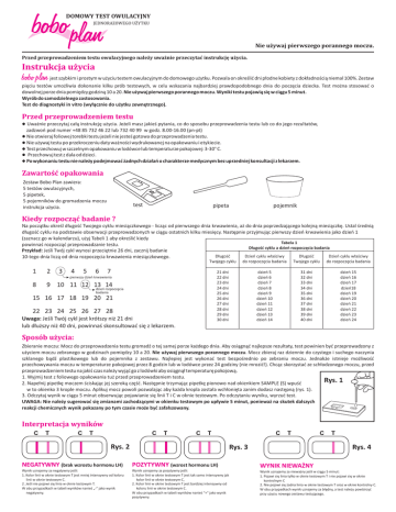 DOMOWY TEST OWULACYJNY JEDNORAZOWEGO U¯YTKU Nie u¿ywaj pierwszego porannego moczu. Przed przeprowadzeniem testu owulacyjnego nale¿y uwa¿nie przeczytaæ instrukcjê u¿ycia. Instrukcja u¿ycia b o b o p l a n jest szybkim i prostym w u¿yciu testem owulacyjnym do domowego u¿ytku. Pozwala on okreœliæ dni p³odne kobiety z dok³adnoœci¹ niemal 100%. Zestaw piêciu testów umo¿liwia dokonanie kilku prób testowych, w celu wskazania najbardziej prawdopodobnego dnia do poczêcia dziecka. Test mo¿na stosowaæ o dowolnej porze dnia pomiêdzy godzin¹ 10 a 20. Nie u¿ywaj pierwszego porannego moczu. Wyniki testu pojawi¹ siê w ci¹gu 5 minut. Wyrób do samodzielnego zastosowania. Test do diagnostyki in vitro (wy³¹cznie do u¿ytku zewnêtrznego). Przed przeprowadzeniem testu Uwa¿nie przeczytaj ca³¹ instrukcjê u¿ycia. Je¿eli masz jakieœ pytania, co do sposobu przeprowadzenia testu lub co do jego rezultatów, l zadzwoñ pod numer +48 85 732 46 22 lub 732 40 99 w godz. 8.00-16.00 (pn-pt) l Nie otwieraj foliowej torebki testu je¿eli nie jesteœ gotowa do przeprowadzenia testu. l Nie u¿ywaj testu po przekroczeniu daty wa¿noœci wydrukowanej na opakowaniu i etykiecie. l Test przechowuj w szczelnym opakowaniu w lodówce lub temperaturze pokojowej: 3-30° C. l Przechowuj test z dala od dzieci. l Po wykonaniu testu nie nale¿y podejmowaæ ¿adnych dzia³añ o charakterze medycznym bez uprzedniej konsultacji z lekarzem. Zawartoœæ opakowania Zestaw Bobo Plan zawiera: 5 testów owulacyjnych, 5 pipetek, 5 pojemników do gromadzenia moczu instrukcja u¿ycia. test pipeta pojemnik Kiedy rozpocz¹æ badanie ? Na pocz¹tku okreœl d³ugoœæ Twojego cyklu miesi¹czkowego - licz¹c od pierwszego dnia krwawienia, a¿ do dnia poprzedzaj¹cego kolejn¹ miesi¹czkê. Ustal œredni¹ d³ugoœæ cyklu na podstawie obserwacji przeprowadzonych w ci¹gu ostatnich kilku miesiêcy. Nastêpnie przyjmuj¹c pierwszy dzieñ krwawienia jako dzieñ 1 (zaznacz go w kalendarzu), u¿yj Tabeli 1 aby okreœliæ kiedy Tabela 1 powinnaœ rozpocz¹æ przeprowadzanie testu. D³ugoœæ cyklu a dzieñ rozpoczêcia badania Przyk³ad: Jeœli Twój cykl wynosi przeciêtnie 26 dni, zacznij badanie D³ugoœæ Dzieñ cyklu w³aœciwy D³ugoœæ Dzieñ cyklu w³aœciwy 10-tego dnia licz¹ od dnia rozpoczêcia krwawienia miesi¹czkowego. 1 2 3 4 5 6 Twojego cyklu do rozpoczêcia badania Twojego cyklu do rozpoczêcia badania 21 dni 22 dni 23 dni 24 dni 25 dni 26 dni 27 dni 28 dni 29 dni 30 dni dzieñ 5 dzieñ 6 dzieñ 7 dzieñ 8 dzieñ 9 dzieñ 10 dzieñ 11 dzieñ 12 dzieñ 13 dzieñ 14 31 dni 32 dni 33 dni 34 dni 35 dni 36 dni 37 dni 38 dni 39 dni 40 dni dzieñ 15 dzieñ 16 dzieñ 17 dzieñ18 dzieñ 19 dzieñ 20 dzieñ 21 dzieñ 22 dzieñ 23 dzieñ 24 7 pierwszy dzieñ krwawienia 8 9 10 11 12 13 14 dzieñ rozpoczêcia badania 15 16 17 18 19 20 21 22 23 24 25 26 27 28 Uwaga: Jeœli Twój cykl jest krótszy ni¿ 21 dni lub d³u¿szy ni¿ 40 dni, powinnaœ skonsultowaæ siê z lekarzem. Sposób u¿ycia: Zbieranie moczu: Mocz do przeprowadzenia testu gromadŸ o tej samej porze ka¿dego dnia. Aby osi¹gn¹æ najlepsze rezultaty, test powinien byæ przeprowadzony z u¿yciem moczu zebranego w godzinach pomiêdzy 10 a 20. Nie u¿ywaj pierwszego porannego moczu. Mocz zbieraj raz dziennie do czystego i suchego naczynia szklanego b¹dŸ plastikowego lub do pojemnika z zestawu. Najlepiej jest wykonaæ test bezpoœrednio po zebraniu moczu. Jednak¿e istnieje mo¿liwoœæ przechowywania moczu w temperaturze pokojowej przez 8 godzin lub w lodówce przez 24 godziny (nie mroziæ!). Chc¹c skorzystaæ ze sch³odzonego moczu, przed przeprowadzeniem testu na jakiœ czas nale¿y wyj¹æ go z lodówki aby osi¹gn¹³ temperaturê pokojow¹. 1. Wyjmij test z foliowego opakowania tu¿ przed przeprowadzeniem testu. Rys. 1 2. Nape³nij pipetkê moczem œciskaj¹c jej szerok¹ czêœæ. Nastêpnie trzymaj¹c pipetkê pionowo nad okienkiem SAMPLE (S) wpuœæ w to okienko 3 krople moczu. Aplikuj mocz powoli pozwalaj¹c aby ka¿da kropla zosta³a wch³oniêta zanim dodasz nastêpn¹ (rys. 1). 3. Odczytaj wynik w ci¹gu 5 minut obserwuj¹c pojawianie siê linii T i C w oknie testowym. Po odczytaniu wyniku, wyrzuæ test. UWAGA: Nie nale¿y sugerowaæ siê zmianami zachodz¹cymi w okienku testowym po up³ywie 5 minut, poniewa¿ na skutek dalszych reakcji chemicznych wynik pokazany po tym czasie mo¿e byæ zafa³szowany. Interpretacja wyników C T C T C T C T Rys. 2 C T Rys. 3 NEGATYWNY (brak wzrostu hormonu LH) POZYTYWNY (wzrost hormonu LH) Wynik uznajemy za negatywny jeœli: 1. Kolor linii w oknie testowym T jest mniej intensywny od koloru linii w oknie testowym C. 2. Jeœli nie pojawi siê linia w oknie testowym T. W obu przypadkach w tabeli wyników nanieœ „-” jako wynik negatywny. Wynik uznajemy za pozytywny jeœli: 1. Kolor linii w oknie testowym T jest tak samo intensywny jak kolor linii w oknie testowym C, 2. Kolor linii w oknie testowym T jest bardziej intensywny od koloru linii w oknie testowym C. W obu przypadkach w tabeli wyników nanieœ "+" jako wynik pozytywny. C T Rys. 4 WYNIK NIEWA¯NY Wynik uznajemy za niewa¿ny jeœli w ci¹gu 5 minut: 1. Pojawi siê linia tylko w oknie testowym T i nie pojawi siê w oknie kontrolnym C 2. Nie pojawi siê ¿adna linia w oknie testowym T oraz w oknie kontrolny C. W obu przypadkach wynik uznajemy za b³êdny, a test nale¿y powtórzyæ przy u¿yciu nowego zestawu testuj¹cego. Tabela wyników Test Dzieñ Twojego cyklu Data wykonania badania Godzina zebrania moczu Wynik 1 2 3 4 5 Co oznaczaj¹ wyniki przeprowadzonego testu ? Po ka¿dym teœcie zapisz w tabeli wyników rezultat przeprowadzonego badania. Je¿eli wynik jest pozytywny, najprawdopodobniej nast¹pi³ wzrost poziomu hormonu LH. Od tego momentu, w ci¹gu 24-36 godzin wiêkszoœæ kobiet ma owulacjê. Wczeœniejsze okreœlenie dnia owulacji jest wa¿ne dla zajœcia w ci¹¿ê poniewa¿ komórka jajowa mo¿e byæ zap³odniona w ci¹gu 6-24 godzin po