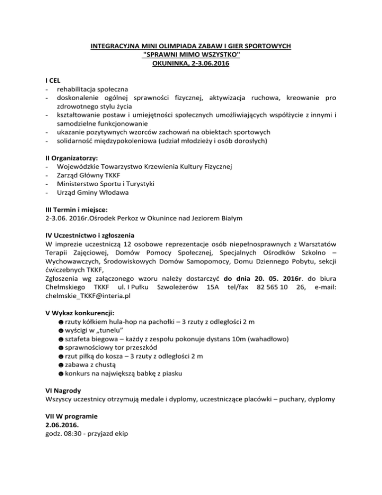 INTEGRACYJNA MINI OLIMPIADA ZABAW I GIER SPORTOWYCH "SPRAWNI MIMO WSZYSTKO" OKUNINKA, 2-3.06.2016 I CEL - rehabilitacja społeczna - doskonalenie ogólnej sprawności fizycznej, aktywizacja ruchowa, kreowanie pro zdrowotnego stylu życia - kształtowanie postaw i umiejętności społecznych umożliwiających współżycie z innymi i samodzielne funkcjonowanie - ukazanie pozytywnych wzorców zachowań na obiektach sportowych - solidarność międzypokoleniowa (udział młodzieży i osób dorosłych) II Organizatorzy: - Wojewódzkie Towarzystwo Krzewienia Kultury Fizycznej - Zarząd Główny TKKF - Ministerstwo Sportu i Turystyki - Urząd Gminy Włodawa III Termin i miejsce: 2-3.06. 2016r.Ośrodek Perkoz w Okunince nad Jeziorem Białym IV Uczestnictwo i zgłoszenia W imprezie uczestniczą 12 osobowe reprezentacje osób niepełnosprawnych z Warsztatów Terapii Zajęciowej, Domów Pomocy Społecznej, Specjalnych Ośrodków Szkolno – Wychowawczych, Środowiskowych Domów Samopomocy, Domu Dziennego Pobytu, sekcji ćwiczebnych TKKF, Zgłoszenia wg załączonego wzoru należy dostarczyć do dnia 20. 05. 2016r. do biura Chełmskiego TKKF ul. I Pułku Szwoleżerów 15A tel/fax 82 565 10 26, e-mail: [email protected] V Wykaz konkurencji: ☻rzuty kółkiem hula-hop na pachołki – 3 rzuty z odległości 2 m ☻wyścigi w „tunelu” ☻sztafeta biegowa – każdy z zespołu pokonuje dystans 10m (wahadłowo) ☻sprawnościowy tor przeszkód ☻rzut piłką do kosza – 3 rzuty z odległości 2 m ☻zabawa z chustą ☻konkurs na największą babkę z piasku VI Nagrody Wszyscy uczestnicy otrzymują medale i dyplomy, uczestniczące placówki – puchary, dyplomy VII W programie 2.06.2016. godz. 08:30 - przyjazd ekip godz. 09:00 - zapoznanie z terenem, marsz pieszy Nordic Walking wokół jeziora pod okiem instruktorów godz. 11:00 - uroczyste otwarcie Olimpiady – prezentacja wizualna i słowna ekip godz. 11:30 - blok imprez sportowych z elementami współzawodnictwa (krykiet, kometka, boccia, przesuwanka, kości, wybijanka, tunel, rzut podkową, kręgle) godz. 14:00 - posiłek godz. 15:00 - konkurs na największą babkę z piasku godz. 16:00 - blok sportowy c. d. godz. 18:00 - ognisko z pieczeniem kiełbasek, wspólne piosenki i wiersze, 3.06.2016. godz. 8:00 toaleta poranna – gimnastyka godz. 9:00 śniadanie godz. 10:00 – 12:00 zabawy ruchowe: - zabawy orientacyjno – manualne - zabawy rzutne (rzutki) - zabawy biegowe (sprawnościowy tor przeszkód, zabawowe formy ćwiczeń równoważnych) godz. 14:00 obiad godz. 16:00 plener malarski – wspomnienie z pobytu godz. 17:00 uroczyste podsumowanie współzawodnictwa rekreacyjnego, zgadywanki terenowej, pleneru malarskiego, wręczenie pucharów, medali, dyplomów i upominków godz. 18:00 wyjazd VIII Postanowienia końcowe: - organizatorzy zabezpieczają medale, puchary, poczęstunek, nocleg, obsługę sędziowską, techniczną, instruktorską, transport - wszyscy zawodnicy są ubezpieczeni przez Chełmskie TKKF, - prosimy o dotrzymanie terminu zgłoszenia, - interpretacja regulaminu imprezy należy do Organizatora. Wzór zgłoszenia: Lp. Nazwisko i imię Data urodzenia Rodzaj niepełnosprawności/ Nr orzeczenia 1. 2. 3. 4. Opiekunowie: ............................................................ /podpis kierownika placówki/