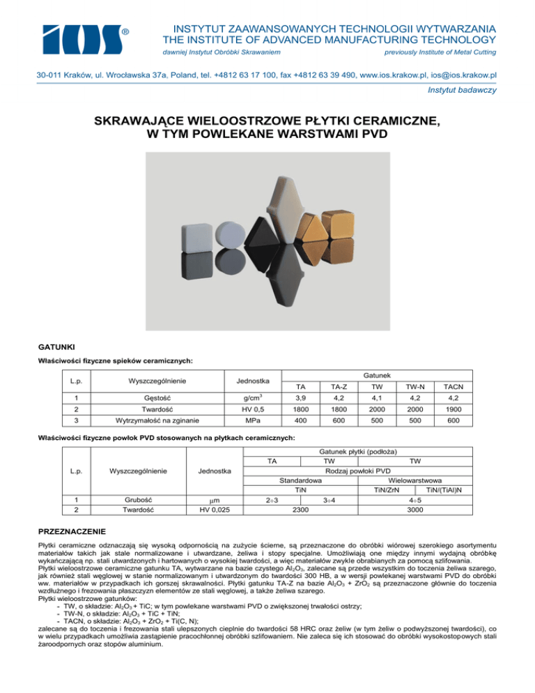 SKRAWAJĄCE WIELOOSTRZOWE PŁYTKI CERAMICZNE, W TYM POWLEKANE WARSTWAMI PVD GATUNKI Właściwości fizyczne spieków ceramicznych: Gatunek L.p. Wyszczególnienie Jednostka TA TA-Z TW TW-N TACN 1 Gęstość g/cm3 3,9 4,2 4,1 4,2 4,2 2 Twardość HV 0,5 1800 1800 2000 2000 1900 3 Wytrzymałość na zginanie MPa 400 600 500 500 600 Właściwości fizyczne powłok PVD stosowanych na płytkach ceramicznych: TA L.p. Wyszczególnienie Jednostka 1 Grubość 2 Twardość m HV 0,025 Gatunek płytki (podłoża) TW TW Rodzaj powłoki PVD Standardowa Wielowarstwowa TiN TiN/ZrN TiN/(TiAl)N 2 3 3 4 2300 4 5 3000 PRZEZNACZENIE Płytki ceramiczne odznaczają się wysoką odpornością na zużycie ścierne, są przeznaczone do obróbki wiórowej szerokiego asortymentu materiałów takich jak stale normalizowane i utwardzane, żeliwa i stopy specjalne. Umożliwiają one między innymi wydajną obróbkę wykańczającą np. stali utwardzonych i hartowanych o wysokiej twardości, a więc materiałów zwykle obrabianych za pomocą szlifowania. Płytki wieloostrzowe ceramiczne gatunku TA, wytwarzane na bazie czystego Al 2O3, zalecane są przede wszystkim do toczenia żeliwa szarego, jak również stali węglowej w stanie normalizowanym i utwardzonym do twardości 300 HB, a w wersji powlekanej warstwami PVD do obróbki ww. materiałów w przypadkach ich gorszej skrawalności. Płytki gatunku TA-Z na bazie Al2O3 + ZrO2 są przeznaczone głównie do toczenia wzdłużnego i frezowania płaszczyzn elementów ze stali węglowej, a także żeliwa szarego. Płytki wieloostrzowe gatunków: - TW, o składzie: Al2O3 + TiC; w tym powlekane warstwami PVD o zwiększonej trwałości ostrzy; - TW-N, o składzie: Al2O3 + TiC + TiN; - TACN, o składzie: Al2O3 + ZrO2 + Ti(C, N); zalecane są do toczenia i frezowania stali ulepszonych cieplnie do twardości 58 HRC oraz żeliw (w tym żeliw o podwyższonej twardości), co w wielu przypadkach umożliwia zastąpienie pracochłonnej obróbki szlifowaniem. Nie zaleca się ich stosować do obróbki wysokostopowych stali żaroodpornych oraz stopów aluminium. KSZTAŁTY I WYMIARY Oznaczenia w symbolu i wymiary płytki Symbol SNGN SNUN TNGN TNUN RNGN RNUN Długość boku lub średnica Grubość 12; 12,7 mm 04; 4,76 mm 07; 7,94 mm 16; 16,5 mm 04; 4,76 mm 07; 7,94 mm 12; 12,7 mm 04; 4,76 mm Promień naroża 08; 0,8 mm 12; 1,2 mm 16; 1,6 mm 20; 2,0 mm 24; 2,4 mm 08; 0,8 mm 12; 1,2 mm 16; 1,6 mm Szerokość x kąt fazy T02020; 0,20 mm T01020; 0,10 mm 20 20 00 MOCOWANIE PŁYTEK Do mocowania płytek o grubości 4,76 (04) i 7,94 (07) mm służą następujące standardowe typy noży składanych (produkowanych m.in. przez Pabianicką Fabrykę Narzędzi PAFANA): - CSRNR/L - 2020 - 12 lub 3225 - 12, - CSSNR/L - 2525 - 12 lub 3225 - 12, - CTGNR/L - 2525 - 16 lub 3225 - 16, - CTFNR/L - 2525 - 16 lub 3225 - 16, - CSKNR/L - 2020 K12L, - CSRNR/L - 2525 M12L, - CTFNR/L - 2525 K16L, - CTJNR/L - 2020 K16L. WARUNKI UŻYTKOWANIA Płytki wieloostrzowe ceramiczne zaleca się stosować na tokarkach i frezarkach o dobrej dokładności geometrycznej i dużej sztywności dynamicznej. Zalecane parametry skrawania przy toczeniu: Materiał obrabiany Żeliwo Stal węglowa normalizowana, stal węglowa utwardzona do twardości 300 HB Stal stopowa i narzędziowa ulepszona cieplnie do twardości 58 HRC Rodzaj obróbki Średniodokładna i wykończeniowa Średniodokładna Wykończeniowa Średniodokładna i wykończeniowa TA, TA/TiN vc [m/min] f [mm/obr] ap [mm] Gatunki płytek TAZ Parametry skrawania vc f ap [m/min] [mm/obr] [mm] vc [m/min] 350 600 0,3 3,0 150 200 0,3 3,0 350 600 0,3 3,0 350 600 0,3 3,0 350 400 0,3 3,0 250 400 0,3 3,0 TW, TW-N, TACN, TW/PVD 250 300 - - - - - - f [mm/obr] 0,05 0,15 80 100 0,2 ap [mm] 0,3 1,0 vc – prędkość skrawania, f – posuw, ap – głębokość skrawania Zalecane parametry w szczególnych przypadkach stosowania płytek gatunku TW do frezowania płaszczyzn: - obróbka kształtująca (płytki kwadratowe bądź trójkątne): vc = 300 400 m/min; fz= 0,08 0,25 mm/ostrze; ap = 0,5 1,5 mm; - obróbka wykończeniowa (płytki okrągłe): vc = 350 500 m/min; fz = 0,05 0,20 mm/ostrze; ap = 0,2 0,8 mm. Przykłady zastosowania: - toczenie żeliwa EN GJL 250 o twardości 180 HB za pomocą płytek gatunku TA, przy vc = 600 m/min, f = 0,25 mm/obr i ap = 2,5 mm, - toczenie stali C45 za pomocą płytek gatunku TAZ, przy vc = 380 m/min, f = 0,25 mm/obr i ap = 2,5 mm, - toczenie stali gatunku 41Cr4 ulepszonej cieplnie do twardości 50 2 HRC za pomocą płytek gatunku TACN, przy vc = 150 m/min, f = 0,15 mm/obr i ap = 0,5 mm, - toczenie stali gatunku 145Cr6 o twardości 57 2 HRC za pomocą płytek gatunku TW/PVD, przy vc = 100 m/min, f = 0,10 mm/obr, ap = 0,3 mm. EFEKTY STOSOWANIA PŁYTEK CERAMICZNYCH Do najistotniejszych zalet wykonywanych w Instytucie płytek ceramicznych należą: - możliwość wydajnej obróbki z wysokimi prędkościami skrawania, - uzyskanie powierzchni o bardzo małej chropowatości oraz wyeliminowanie w wielu przypadkach operacji szlifowania, - umożliwienie obróbki za pomocą toczenia materiałów ulepszonych cieplnie do twardości 58 HRC, - prowadzenie obróbki ekologicznej, nie wymagającej stosowania cieczy obróbkowych (obróbka na sucho), - konkurencyjne ceny, szybkie dostawy i doradztwo techniczne. INFORMACJE DODATKOWE Kontakt: tel. +48 12 63 17 250.