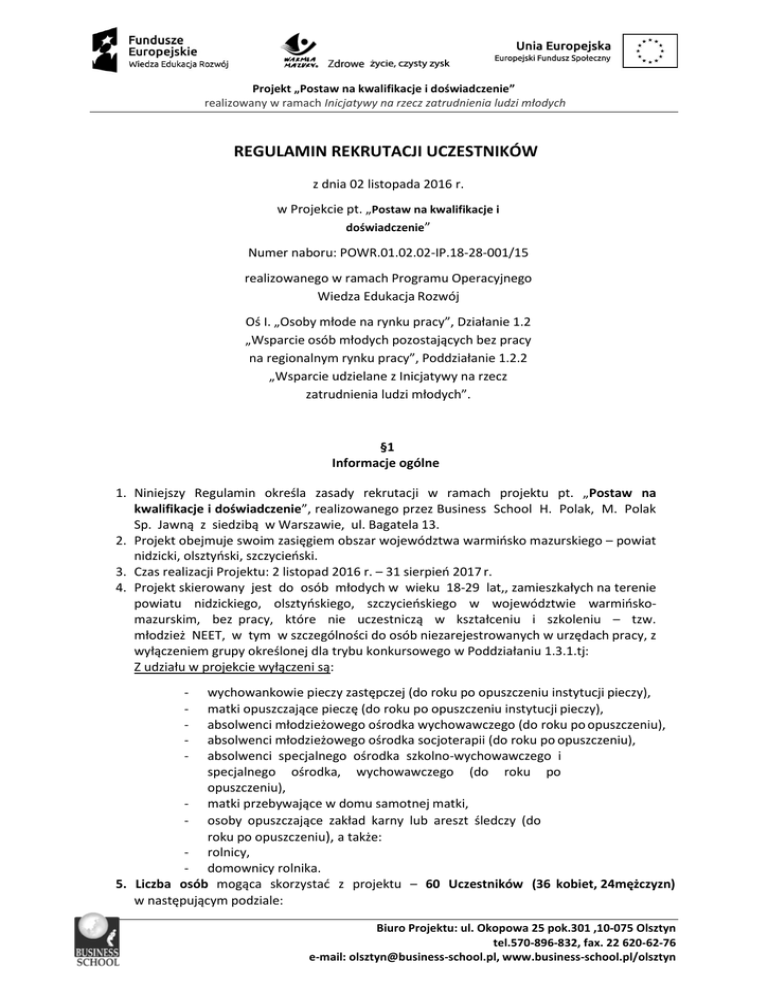 Projekt „Postaw na kwalifikacje i doświadczenie” realizowany w ramach Inicjatywy na rzecz zatrudnienia ludzi młodych REGULAMIN REKRUTACJI UCZESTNIKÓW z dnia 02 listopada 2016 r. w Projekcie pt. „Postaw na kwalifikacje i doświadczenie” Numer naboru: POWR.01.02.02-IP.18-28-001/15 realizowanego w ramach Programu Operacyjnego Wiedza Edukacja Rozwój Oś I. „Osoby młode na rynku pracy”, Działanie 1.2 „Wsparcie osób młodych pozostających bez pracy na regionalnym rynku pracy”, Poddziałanie 1.2.2 „Wsparcie udzielane z Inicjatywy na rzecz zatrudnienia ludzi młodych”. §1 Informacje ogólne 1. Niniejszy Regulamin określa zasady rekrutacji w ramach projektu pt. „Postaw na kwalifikacje i doświadczenie”, realizowanego przez Business School H. Polak, M. Polak Sp. Jawną z siedzibą w Warszawie, ul. Bagatela 13. 2. Projekt obejmuje swoim zasięgiem obszar województwa warmińsko mazurskiego – powiat nidzicki, olsztyński, szczycieński. 3. Czas realizacji Projektu: 2 listopad 2016 r. – 31 sierpień 2017 r. 4. Projekt skierowany jest do osób młodych w wieku 18-29 lat,, zamieszkałych na terenie powiatu nidzickiego, olsztyńskiego, szczycieńskiego w województwie warmińskomazurskim, bez pracy, które nie uczestniczą w kształceniu i szkoleniu – tzw. młodzież NEET, w tym w szczególności do osób niezarejestrowanych w urzędach pracy, z wyłączeniem grupy określonej dla trybu konkursowego w Poddziałaniu 1.3.1.tj: Z udziału w projekcie wyłączeni są: - wychowankowie pieczy zastępczej (do roku po opuszczeniu instytucji pieczy), matki opuszczające pieczę (do roku po opuszczeniu instytucji pieczy), absolwenci młodzieżowego ośrodka wychowawczego (do roku po opuszczeniu), absolwenci młodzieżowego ośrodka socjoterapii (do roku po opuszczeniu), absolwenci specjalnego ośrodka szkolno-wychowawczego i specjalnego ośrodka, wychowawczego (do roku po opuszczeniu), - matki przebywające w domu samotnej matki, - osoby opuszczające zakład karny lub areszt śledczy (do roku po opuszczeniu), a także: - rolnicy, - domownicy rolnika. 5. Liczba osób mogąca skorzystać z projektu – 60 Uczestników (36 kobiet, 24mężczyzn) w następującym podziale: Biuro Projektu: ul. Okopowa 25 pok.301 ,10-075 Olsztyn tel.570-896-832, fax. 22 620-62-76 e-mail: [email protected], www.business-school.pl/olsztyn Projekt „Postaw na kwalifikacje i doświadczenie” realizowany w ramach Inicjatywy na rzecz zatrudnienia ludzi młodych - 50 osób biernych zawodowo (30k/20m), - 10 osób bezrobotnych (6k/4m) w tym 3 osoby długotrwale bezrobotne (2k/1m) , - Wśród w/w grupy uczestników - 29 osób będzie o niskich kwalifikacjach (17k,12m) 6. Projekt zakłada następujące etapy wsparcia Uczestników: - Identyfikacja potrzeb oraz diagnoza możliwości przez doradcę zawodowego (6h – 2 sp*3h), - warsztaty grupowe z zakresu poradnictwa zawodowego (32h-6gr po śr. 10 os), - pośrednictwo pracy (8h na os,śr.1-2 spotkania w miesiącu), - szkolenia komputerowe i/lub zawodowe wg rekomendacji IPD (liczba godzin zależna od wybranego szkolenia/kursu ), - 3-miesięczne staże zawodowe (dla 50 osób) 7. Udział w projekcie „Postaw na kwalifikacje i doświadczenie”, jest bezpłatny. 8. Biuro projektu znajduje się w Olsztynie przy ulicy Okopowej 25 pok.301 9. Każdy Kandydat/Kandydatka ma obowiązek zapoznać się z Regulaminem rekrutacji i Regulaminem uczestnictwa (Załącznik nr 8) w projekcie „Postaw na kwalifikacje i doświadczenie”, 10. Regulamin rekrutacji wraz z załącznikami podany jest do publicznej wiadomości na stronie internetowej www.business-school.pl/olsztyn , dostępny jest również w Biurze projektu. §2 Słownik pojęć Beneficjent – podmiot, który realizuje Projekt na podstawie Umowy o dofinansowanie Projektu w ramach PO WER 2014-2020. Instytucja Pośrednicząca (IP) PO WER – Wojewódzki Urząd Pracy w Olsztynie. IPD – Indywidualny Plan Działania, to indywidualny program działania przygotowany przy współpracy osoby bezrobotnej lub biernej zawodowo z doradcą zawodowym, zmierzający do uzyskania zatrudnienia. Kandydat – osoba fizyczna biorąca udział w procesie rekrutacyjnym. Osoba bezrobotna – (na potrzeby Poddziałania 1.2.2) zgodnie z Wytycznymi w zakresie realizacji przedsięwzięć z udziałem środków EFS w obszarze rynku pracy na lata 2014-2020 oznacza osobę: pozostającą bez pracy, gotową do podjęcia pracy i aktywnie poszukującą zatrudnienia. Definicja uwzględnia osoby zarejestrowane jako bezrobotne zgodnie z krajowymi przepisami, nawet jeżeli nie spełniają one wszystkich trzech kryteriów. Osobami bezrobotnymi są zarówno osoby bezrobotne w rozumieniu badania aktywności ekonomicznej ludności, jak i osoby zarejestrowane jako bezrobotne. Osoby kwalifikujące się do urlopu macierzyńskiego lub rodzicielskiego, które są bezrobotne w rozumieniu niniejszej definicji (nie pobierają świadczeń z tytułu urlopu), są również osobami bezrobotnymi. osoba bezrobotna zarejestrowana w ewidencji urzędów pracy - osoba pozostająca bez pracy, gotowa do podjęcia pracy i aktywnie poszukująca zatrudnienia, zarejestrowana w ewidencji urzędów pracy. osoba bezrobotna niezarejestrowana w ewidencji urzędów pracy - osoba pozostająca bez Biuro Projektu: ul. Okopowa 25 pok.301 ,10-075 Olsztyn tel.570-896-832, fax. 22 620-62-76 e-mail: [email protected], www.business-school.pl/olsztyn Projekt „Postaw na kwalifikacje i doświadczenie” realizowany w ramach Inicjatywy na rzecz zatrudnienia ludzi młodych pracy, gotowa do podjęcia pracy i aktywnie poszukująca zatrudnienia, niezarejestrowana w ewidencji urzędów pracy. Osoba długotrwale bezrobotna – zgodnie z Wytycznymi w zakresie realizacji przedsięwzięć z udziałem środków EFS w obszarze rynku pracy na lata 2014-2020 oznacza osobę: • w zależności od wieku: - młodzież (<25 lat) – osoby bezrobotne nieprzerwanie przez okres ponad 6 miesięcy (>6 miesięcy), - dor