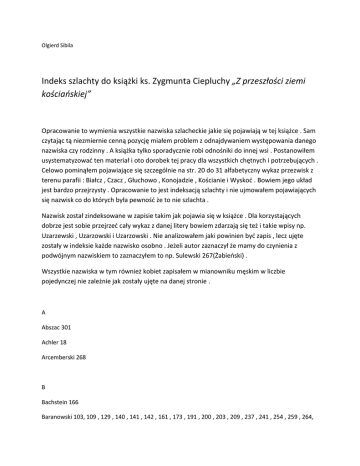 Olgierd Sibila Indeks szlachty do książki ks. Zygmunta Ciepluchy „Z przeszłości ziemi kościańskiej” Opracowanie to wymienia wszystkie nazwiska szlacheckie jakie się pojawiają w tej książce . Sam czytając tą niezmiernie cenną pozycję miałem problem z odnajdywaniem występowania danego nazwiska czy rodzinny . A książka tylko sporadycznie robi odnośniki do innej wsi . Postanowiłem usystematyzować ten materiał i oto dorobek tej pracy dla wszystkich chętnych i potrzebujących . Celowo pominąłem pojawiające się szczególnie na str. 20 do 31 alfabetyczny wykaz przezwisk z terenu parafii : Białcz , Czacz , Głuchowo , Konojadzie , Kościanie i Wyskoć . Bowiem jego układ jest bardzo przejrzysty . Opracowanie to jest indeksacją szlachty i nie ujmowałem pojawiających się nazwisk co do których była pewność że to nie szlachta . Nazwisk został zindeksowane w zapisie takim jak pojawia się w książce . Dla korzystających dobrze jest sobie przejrzeć cały wykaz z danej litery bowiem zdarzają się też i takie wpisy np. Uzarzewski , Uzarzowski i Uzarzowski . Nie analizowałem jaki powinien być zapis , lecz ujęte zostały w indeksie każde nazwisko osobno . Jeżeli autor zaznaczył że mamy do czynienia z podwójnym nazwiskiem to zaznaczyłem to np. Sulewski 267(Żabieński) . Wszystkie nazwiska w tym również kobiet zapisałem w mianowniku męskim w liczbie pojedynczej nie zależnie jak zostały ujęte na danej stronie . A Abszac 301 Achler 18 Arcemberski 268 B Bachstein 166 Baranowski 103, 109 , 129 , 140 , 141 , 142 , 161 , 173 , 191 , 200 , 203 , 209 , 237 , 241 , 254 , 259 , 264, 271 , 275 , 276 , 289 ,292 Bardzki 147 Bartoszewski 142 Baryczka 188 Będlewski 124 , 152 , 190 , 255 , 264 Białojezierski 118 ,120 Białośliwicki 212 Bieganowski 137, ,173 Biegański 262 , 263 Bieczyński 129 , 133 , 145 , 171 , 240 , 262 , 263 , 264 Bielawski 260 Bielewski 205 Bieliński 114, 129 , 128 ,130 ,170 , 171 , 174 , 265 , 299 Bieńkowski 146 , 166 Biliński 145 , 283 , 284 Bliński 267 Błociszewski 116 , 120 ,121 , 122 , 134 ,144 , 146 , 150 , 171 , 179 , 205 ,238 , 239 , 257 , 268 , 281 Błozejewski 144 Błocki 95 Bniński 123 , 125 , 126 , 127 , 132 , 138 , 151 , 152 , 156 , 160 , 168 , 171 , 200 , 211 , 230 , 234 , 238 , 241 , 242 , 247 ,252 , 266 , 268 , 274 , 277 Bogucki 16 , 145 , 239 , 277 Bogusławski 123 , 146 , 267 Bogwicki 264 Bojanowski 17,84 , 85 , 110 , 117 , 124 , 130 , 156 , 157 , 163 , 173 , 179 , 180 , 181 , 182 , 191 , 207 , 234 , 242 , 244 , 248 , 251 , 257 , 266 , 282 , 283 , 290 , 293 , 294 Bolec 118 ,148 Bolesz 276 Bonikowski 176 Borek 122, 123 , 151 , 153 , 158 , 175 , 177 , 188 , 246 , 264 Borkowski 208, 230 , 261 Borzęcki 46,173 , 217 , 276 Borzysławski 95 , 252 Bratuski 216 Bretsznajder 163 Brodnicki 64 , 95 , 96 , 103 , 110 , 126 , 127 , 130 , 140 , 179 , 259 , 267 , 288 Brodzki 18, 206 , 240 , 254 ,255 , 279 Broniewski 166 Bronikowski 124 , 131 , 166 , 201 , 216 , 237 , 246 , 248 , 261 , 264 , 266 , 267 , 294 , 295 Bronisz 90 , 114 , 248 , 249 , 267 , 286 Broński vel Brzyński 213 Brudzewski – Sobocki 151 Brzechwa 192 , 217 Brzeżański 217 Brzozogajski 133 Bukowiecki 288 , 296 Bułakowski 144 , 150 , 237 , 256 , 267 , 294 Burczek 275 Buszewski 246 Buy de 170 Bylęcki 17(Bylęcki-Karchowski) , 210 , 260 ,262 C Cerekwicki 17 , 85 , 187 , 188 , 241 , 244 Cielecki 118 , 126 , 154 , 157 , 166 , 248 , 257 , 258 , 265 , 274 , 276 , 281 , 298 , 290 Cieśliński 112 Ciołek 104 , 105 , 133 , 134 , 284 Ciświcki 87 , 110 , 169 , 170 , 185 , 210 , 210 , 233 , 272 , 274 , 300 Chaławski 128 , 148 , 206 , 272 , 289 Charłupski 105 Chełmski 179 , 209 , 292 Chlebowski 148 , 209 , 263 , 290 Chłapowski 16 , 61 , 91 , 111 , 123 , 127 , 140 , 142 , 143 , 149 , 164 , 171 , 174 , 192 , 206 , 207 , 210 , 244 , 253 , 257 , 272 , 275 , 279 , 280 , 281 , 283 Chobienicki 240 Chociszewski 230 , 286 Choiński 135 , 249 , 269 Chojenski 95 , 142 Chojnicki 236 Choryński 83 , 129 , 159 , 161 , 245 , 250 Chraplewski 270 , 299 , 300 Chroscicki 235 Chrzanowski 196 Chrząstowski 207 Chrzątowski 16 Chorzyński 129 , 256 Chrzypski 88 , 275 , 288 Chudziynski 114 , 288 Chwałkowski 104 , 133 Chyliński 187 , 201 , 262 Chyrzynski 101 Cykowski 15 , 262 , 271 Czacki 18 , 101 , 103 , 105 , 118 , 127 , 132 , 133 , 134 , 140 , 141 , 143 , 144 , 157 , 188 , 210 , 240 , 271 , 283 , 290 , 294 Czapski 252 , 253 , 299 Czapla 249 Czarnecki 115 , 172 Czarnkowski 15 , 124 , 153 , 154 , 156 , 162 , 233 , 274 Czartoryski 234 Czeszewski 260 Czochron 240 Ćmachowski 240 D Dalabuski 209 Daleszynski 84 , 142 , 144 , 183 , 201 , 206 , 266 , 287 Dąbrowski 116 , 121 , 148 , 149 , 180 , 240 Dąbski 252 , 287 Deręgowski 17 Dębowski 266 Dęgórski 100 , 120 Dłuski 15 , 145 , 169 , 169(Siedlnicki) , 264 , 294 Dłużyński 161 , 230 , 277 , 278 Dobczynski 161 , 240 , 244 , 281 Dobieszewski 296 Dobrosławski 18 , 249 Dobrzycki 289 , 293 Dokowski 17 , 123 , 137 , 209 , 269 , 271 Doliwa-Milan 268 Domaradzki 291 Domasławski 201 Domiechowski 144 , 147 , 181 , 258 Donin 296 Doręgowski 68 Draminski 115 , 210 , 239 Droszewski 142 , 146 Drozdowski 188 , 239 Drwęski 130 Drzewiecki 238 , 267 , 268 , 282 , 293 , 122 , 173 Dworzyński 224 Dziauski 189 Działyński 16 , 130 , 140 , 150 , 249 , 263 Dziekszynski 268 Dziembowski 173 , 249 Dzierzanowski 91 Dzierzawski 44 Dzierzgowski 270 G Gajewski 16 , 46 , 60 , 115 , 118 , 119 , 121 , 126 , 127 , 133 , 134 , 135 , 140 , 144 , 149 , 179 , 180 , 181 , 188 , 202 , 206 , 215 , 222 , 234 , 236 , 241 , 248 , 249 , 254 , 268 , 270 , 274 , 289 Gałęski 238 , 267 , 268 Garczynski 150 , 183 Gawroński 104 , 147 , 251 , 264 , 282 , 289 , 290 , 294 Gądkowski 201 , 294 Gębicki 16 , 18 , 234 Glinski 133 Gliszczyński 128 , 146 , 173 , 207 , 238 , 246 , 301 Głażewski – Słomowski 292 Głoskowski 183 Głowacki 99 Głuchowski 181 Gninski 85 , 95 , 163 , 189 , 220 , 243 , 253 , 262 , 299 Goczałkowski 157 , 217 , 262 , 290 Golcz 124 , 237 Golina 83 Golinski 1