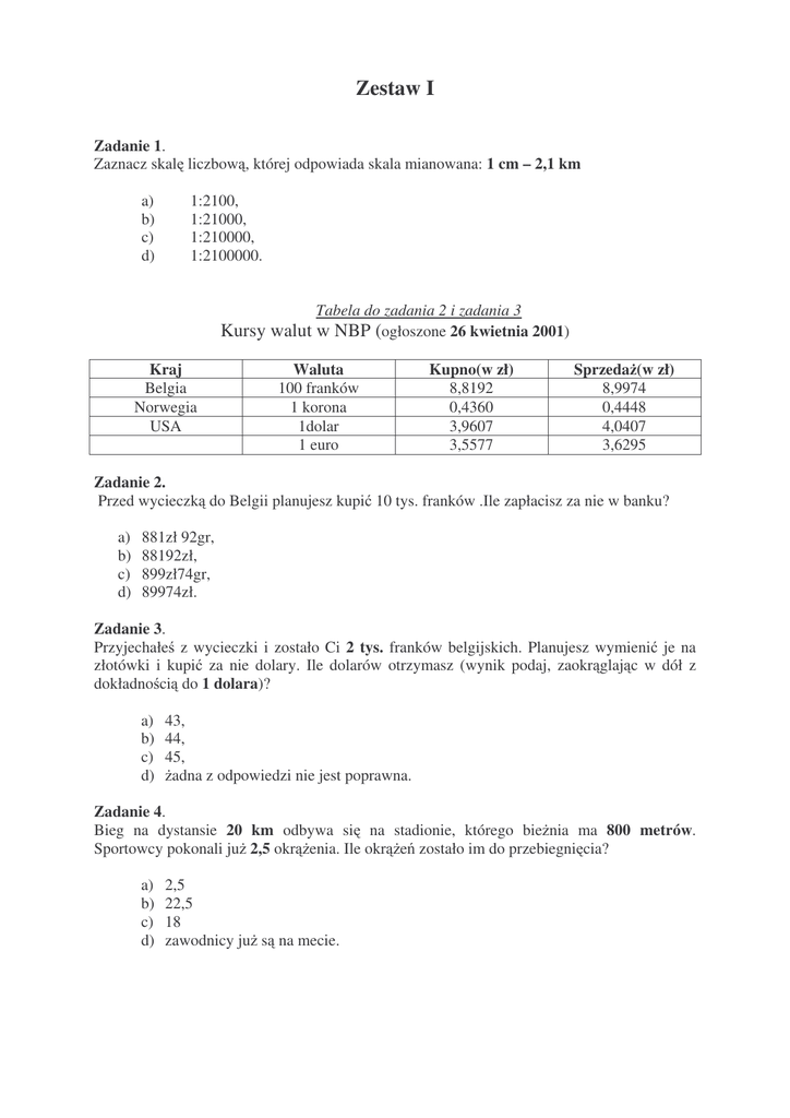 Zestaw I Zadanie 1. Zaznacz skal liczbow , której odpowiada skala mianowana: 1 cm – 2,1 km a) b) c) d) 1:2100, 1:21000, 1:210000, 1:2100000. Tabela do zadania 2 i zadania 3 Kursy walut w NBP (ogłoszone 26 kwietnia 2001) Kraj Belgia Norwegia USA Waluta 100 franków 1 korona 1dolar 1 euro Kupno(w zł) 8,8192 0,4360 3,9607 3,5577 Sprzeda (w zł) 8,9974 0,4448 4,0407 3,6295 Zadanie 2. Przed wycieczk do Belgii planujesz kupi 10 tys. franków .Ile zapłacisz za nie w banku? a) b) c) d) 881zł 92gr, 88192zł, 899zł74gr, 89974zł. Zadanie 3. Przyjechałe z wycieczki i zostało Ci 2 tys. franków belgijskich. Planujesz wymieni je na złotówki i kupi za nie dolary. Ile dolarów otrzymasz (wynik podaj, zaokr glaj c w dół z dokładno ci do 1 dolara)? a) 43, b) 44, c) 45, d) adna z odpowiedzi nie jest poprawna. Zadanie 4. Bieg na dystansie 20 km odbywa si na stadionie, którego bie nia ma 800 metrów. Sportowcy pokonali ju 2,5 okr enia. Ile okr e zostało im do przebiegni cia? a) b) c) d) 2,5 22,5 18 zawodnicy ju s na mecie. Zadanie 5. Do zabudowy kuchni potrzebny jest blat o wymiarach 5a 2b 3 i 2a 4b10 . Jak powierzchni b dzie miała płyta niezb dna do wykonania tego blatu? a) b) c) d) 10a 8b 30 10a 6b13 7a 6b13 10a 2b 3 + 4a 4b10 Zadanie 6. Pan Wi niewski zgubił list zakupów, któr dostał od ony. Pami tał tylko, e cukru miał kupi dwa raz tyle, co soli, kaszy dwa razy tyle, co cukru, ry u o 3 kg mniej ni kaszy, a m ki dwa razy tyle, co ry u i jeszcze 9 kg. M ka wa yła wi cej ni pozostałe zakupy razem wzi te. Wiedz c, e wszystkie produkty pakowane s w kilogramowe torebki, odtwórz list zakupów Zadanie 7. Proszek do prania mo na kupi w dwóch opakowaniach. Które opakowanie jest bardziej opłacalne i ile mo na w ten sposób zaoszcz dzi na jednym kilogramie proszku? Cena 27 zł Cena 3,75 zł PROSZEK DO PRANIA PROSZEK DO PRANIA 560 g 5,4 kg Zadanie 8. Uzupełnij tabel : Kwota netto Stawka VAT Kwota VAT Abonament telefoniczny 19,50 22% ……..... ………. Abonament za usługi dodatkowe 2,50 ………. 0,28 Poł czenia telefoniczne ………. 22% Razem ………. Usługa - 2,20 Kwota brutto ………. ………. ………. ………. Zadanie 9. W piwnicy zamkowej stało 21 jednakowych beczek na wino: 7 pełnych,7 napełnionych do połowy i 7 pustych. Trzej ksi ta postanowili podzieli je mi dzy sob tak, aby ka demu przypadło tyle samo wina, ale i tyle samo beczek. Zaproponuj sposób podziału. Zadanie 10. W wyborach do samorz du szkolnego wzi ło udział 440 uczniów. Na Arka oddano 176 głosów, na Natalk 132 głosy, 110 głosów otrzymał Przemek. Pozostali uczniowie głosowali na innych kandydatów. Przedstaw wyniki wyborów na kołowym diagramie procentowym. Zadanie 11. Płetwal bł kitny, najwi ksze zwierz na wiecie, osi ga wag® 190 ton. Najwi ksze zwierz l dowe, sło , mo e wa y do 5 ton. Jakim procentem wagi płetwala Bł kitnego jest waga słonia? Podaj wynik z dokładno ci do 1 procenta. Zadanie 12. Wo nemu zatrudnionemu na cały etat, przysługuje jeden fartuch na 18 miesi cy. Wo ny pracuje na pół etatu i otrzymuje nowy fartuch co 36 miesi cy. Zatrudniono wo nego na ¾ etatu. Co jaki okres czasu powinien dostawa nowy fartuch.