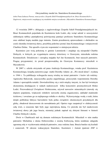 Otrzymaliśmy medal im. Stanisława Kostaneckiego (tekst Pana Łukasza Parusa, nauczyciela z Zespołu Szkół Ponadgimnazjalnych im. Braci Kostaneckich w Zagórowie, miejscowości znajdującej się niedaleko miejsca urodzenia (Myszaków) Stanisława Kostaneckiego) 12 września 2009 r. delegacja z zagórowskiego Zespołu Szkół Ponadgimnazjalnych im. Braci Kostaneckich pojechała do Kazimierza koło Łodzi, aby wziąć udział w uroczystości odsłonięcia tablicy pamiątkowej poświęconej pamięci profesora Stanisława Kostaneckiego oraz odebrać kopię medalu jego imienia. Zanim przedstawię sprawozdanie z obchodów na cześć chemika światowej sławy, przybliżę pokrótce postać Jana Kostaneckiego i miejscowość Charbice Dolne. Nie sposób o tym nie wspomnieć w niniejszym tekście. Kazimierz jest wsią położoną w gminie Lutomiersk i znajduje się nieopodal Charbic Dolnych, w których, po wygaśnięciu umowy dzierżawy w Ozorzynie, mieszkała rodzina Kostaneckich. Dziedzicem i zarządcą majątku był Jan Kostanecki, brat naszych patronów. Pragnę przypomnieć, że przed przeprowadzką do Ozorzyna Kostaneccy mieszkali w Myszakowie. W 2007 r. szkoła otrzymała od pana Andrzeja Kostaneckiego, wnuka prof. Kazimierza Kostaneckiego, książkę autorstwa jego matki Dorothy Adams pt. „We stood alone”, wydaną w 1944 r. Ta publikacja wzbogaciła naszą wiedzę na temat patronów i losów ich rodziny. Agnieszka Balcerzak, nauczycielka języka angielskiego, przeczytała wspomnienia Dorothy Adams i sporządziła notatki. Dowiedzieliśmy się z nich między innymi, że Jan był świetnym ekonomistą działającym w radach nadzorczych kilku koncernów przemysłowych blisko Łodzi. Przewodniczył Związkowi Rolniczemu, używał nawozów mineralnych (stawały się dopiero popularne, większość rolników nawoziła ziemię organicznie), zakładał studzienki ściekowe, i uważano go za najlepszego rolnika w okolicy. Wykorzystując wodę z rzeki, która dzięki pobliskiej fabryce barwników była pełna związków chemicznych przydatnych dla gleby, zbudował deszczownie do nawadniania pól. Oprócz tego zaopatrzył w elektryczność całą wieś, a osuszone łąki były jego największą dumą. Co prawda nie był naukowcem światowej sławy jak jego bracia, niemniej jednak zapisał się złotymi literami w historii Charbic Dolnych i okolic. Dwór w Charbicach stał się domem rodzinnym Kostaneckich. Mieszkali w nim matka patronów Michalina z domu Dobrowolska z siostrą Eufrezyną, która notabene odegrała ogromną rolę w wychowaniu młodych patronów, oraz rodzina Jana. Bracia bardzo się kochali i szanowali. W okresie wakacyjnym Stanisław, Kazimierz i Antoni (patroni ZSP w Zagórowie) przyjeżdżali do podłódzkiej wsi, aby odpocząć i odwiedzić bliskich. Świadczą o tym zachowane zdjęcia. Ich kopie niebawem szkoła otrzyma od pani Marii Bald, wnuczki Jana Kostaneckiego. Stanisław Kostanecki zmarł w 1910 r. w Bernie. O jego śmierci rodzina dowiedziała się po czasie z "Kuriera Warszawskiego". To był dla niej ogromny cios. Jan postanowił pojechać do Szwajcarii i przywieźć ciało brata do Polski. Zostało złożone w grobowcu rodziny Kostaneckich w Kaziemierzu koło Łodzi. Z okazji zbliżającej się 100. rocznicy śmierci Stanisława Kostaneckiego, Polskie Towarzystwo Chemiczne (PTCH), obchodzące w tym roku także 90-lecie swojego istnienia, postanowiło oddać hołd wybitnemu chemikowi, fundując i odsłaniając na jego cześć tablicę pamiątkową. Prof. Kostanecki jest patronem medalu PTCH, przyznawanego corocznie za wybitne osiągnięcia w dziedzinie chemii organicznej. Zatem 52. Zjazd Polskiego Towarzystwa Chemicznego i Stowarzyszenia Inżynierów i Techników Przemysłu Chemicznego (SITPChem) miał charakter jubileuszowy. Uroczystość w Kazimierzu odbyła się w dniu poprzedzającym oficjalne otwarcie Zjazdu. Nie mogło na niej zabraknąć szkoły, która nosi imię Braci Kostaneckich. 16 lutego bieżącego roku dyrekcja została powiadomiona przez prof. Piotra Bałczewskiego o wrześniowym 52. Zjeździe PTCh i SITPChem oraz uroczystym odsłonięciu tablicy pamiątkowej ku czci Stanisława Kostaneckiego. Prof. Bałczewski jednocześnie w imieniu Komitetu Organizacyjnego Zjazdu zaprosił delegację z naszej szkoły na powyższe obchody. Byliśmy mile zaskoczeni i zadowoleni, że środowiska naukowe pamiętają o zagórowskiej szkole ponadgimnazjalnej. Oficjalne zaproszenie otrzymaliśmy 29 lipca. Nasza radość była jeszcze większa, gdy dowiedzieliśmy się, że otrzymamy z rąk prezesa PTCH prof. Pawła Kafarskiego pamiątkową kopię medalu im. Stanisława Kostaneckiego. Początek uroczystości odbył się o godz. 11.00 na cmentarzu w Kazimierzu. Prof. Bałczewski, inicjator i organizator odsłonięcia tablicy, powitał wszystkich zgromadzonych i zaproszonych gości. Następnie głos zabrał miejscowy proboszcz, serdecznie dziękując władzom PTCH za pamięć o wybitnym chemiku, członku rodziny Kostaneckich związanych z ziemią łódzką. Prof. Paweł Kafarski, prezes PTCH, fundator tablicy, powiedział o wielkim wkładzie pracy naukowej prof. Kostaneckiego w rozwój dziedziny chemii. W dalszej części uroczystości tablicę ku czci wybitnego naukowca odsłoniła przedstawicielka rodziny pani Maria Bald. Na tablicy wyryto motto "Pracujmy w dwójnasób", będące wezwaniem samego uczonego. Pani Bald podziękowała władzom PTCH oraz wszystkim, którzy włożyli trud w przygotowanie uroczystości. Nastąpił moment złożenia kwiatów przez przedstawicieli instytucji, rodzinę i gości. Później reprezentant Szwajcarskiego Towarzystwa Chemicznego prof. Heinz Heimgartner, przyjaciel Uniwersytetu Łódzkiego, wygłosił laudację na cześć Stanisława Kostaneckiego. Przypomniał fakty biograficzne oraz nadmienił, że prof. Kostanecki był niestrudzonym naukowcem, ogromnie lubianym przez środowisko akademickie i dość wcześnie, bo w wieku 30 lat, zost