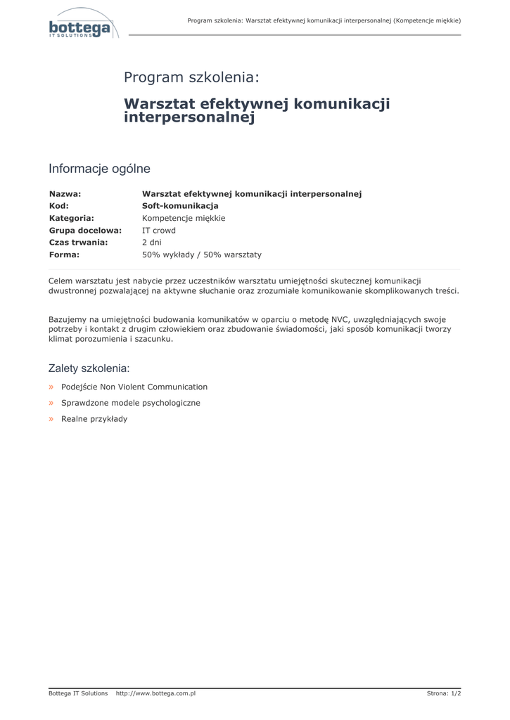 Program szkolenia: Warsztat efektywnej komunikacji interpersonalnej (Kompetencje miękkie) Program szkolenia: Warsztat efektywnej komunikacji interpersonalnej Informacje ogólne Nazwa: Warsztat efektywnej komunikacji interpersonalnej Kod: Soft-komunikacja Kategoria: Kompetencje miękkie Grupa docelowa: IT crowd Czas trwania: 2 dni Forma: 50% wykłady / 50% warsztaty Celem warsztatu jest nabycie przez uczestników warsztatu umiejętności skutecznej komunikacji dwustronnej pozwalającej na aktywne słuchanie oraz zrozumiałe komunikowanie skomplikowanych treści. Bazujemy na umiejętności budowania komunikatów w oparciu o metodę NVC, uwzględniających swoje potrzeby i kontakt z drugim człowiekiem oraz zbudowanie świadomości, jaki sposób komunikacji tworzy klimat porozumienia i szacunku. Zalety szkolenia: Podejście Non Violent Communication Sprawdzone modele psychologiczne Realne przykłady Bottega IT Solutions http://www.bottega.com.pl Strona: 1/2 Program szkolenia: Warsztat efektywnej komunikacji interpersonalnej (Kompetencje miękkie) Program szkolenia: 1. Części składowe komunikacji 1.1. Diagnoza systemów reprezentacji uczestników 1.2. Wykorzystanie systemów reprezentacji w komunikacji 2. Komunikacja werbalna i niewerbalna 2.1. Dopasowanie 2.2. Mowa ciała 2.3. Aktywne słuchanie 3. Sztuka zadawania pytań 4. Szumy i filtry komunikacyjne 5. Piramida potrzeb Maslowa w kontekście budowania relacji 6. Piramida Diltsa w kontekście budowania relacji 7. Słowa jako bariery komunikacyjne 8. 4 kroki budowania komunikatu wg Non Violent Communication 8.1. Wpływ ocen i interpretacji na reakcje drugiej osoby 8.2. Wykorzystanie uczuć, jako informacji o swoich potrzebach 8.3. Identyfikacja potrzeb własnych i innych - dotarcie do potrzeby, jako kluczowy element budowania kontaktu z drugą osobą 8.4. Waga rozróżniania strategii od potrzeb – podstawa znajdowania wspólnych celów 8.5. Formułowanie skutecznych i konkretnych próśb Bottega IT Solutions http://www.bottega.com.pl Strona: 2/2