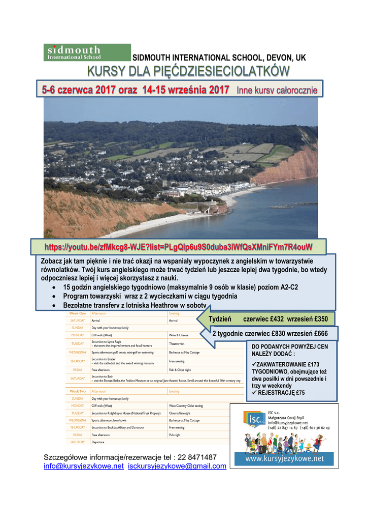 SIDMOUTH INTERNATIONAL SCHOOL, DEVON, UK Zobacz jak tam pięknie i nie trać okazji na wspaniały wypoczynek z angielskim w towarzystwie równolatków. Twój kurs angielskiego może trwać tydzień lub jeszcze lepiej dwa tygodnie, bo wtedy odpoczniesz lepiej i więcej skorzystasz z nauki. 15 godzin angielskiego tygodniowo (maksymalnie 9 osób w klasie) poziom A2-C2 Program towarzyski wraz z 2 wycieczkami w ciągu tygodnia Bezpłatne transfery z lotniska Heathrow w soboty Tydzień czerwiec £432 wrzesień £350 2 tygodnie czerwiec £830 wrzesień £666 DO PODANYCH POWYŻEJ CEN NALEŻY DODAĆ : ZAKWATEROWANIE £173 TYGODNIOWO, obejmujące też dwa posiłki w dni powszednie i trzy w weekendy REJESTRACJĘ £75 Szczegółowe informacje/rezerwacje tel : 22 8471487 [email protected] [email protected]