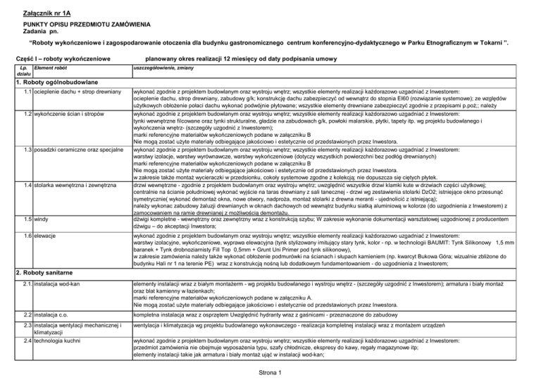 Załącznik nr 1A PUNKTY OPISU PRZEDMIOTU ZAMÓWIENIA Zadania pn. “Roboty wykończeniowe i zagospodarowanie otoczenia dla budynku gastronomicznego centrum konferencyjno-dydaktycznego w Parku Etnograficznym w Tokarni ”. Część I – roboty wykończeniowe Lp. Element robót działu planowany okres realizacji 12 miesięcy od daty podpisania umowy uszczegółowienie, zmiany 1. Roboty ogólnobudowlane 1.1 ocieplenie dachu + strop drewniany 1.2 wykończenie ścian i stropów 1.3 posadzki ceramiczne oraz specjalne 1.4 stolarka wewnętrzna i zewnętrzna 1.5 windy 1.6 elewacje wykonać zgodnie z projektem budowlanym oraz wystroju wnętrz; wszystkie elementy realizacji każdorazowo uzgadniać z Inwestorem: ocieplenie dachu, strop drewniany, zabudowy g/k; konstrukcję dachu zabezpieczyć od wewnątrz do stopnia EI60 (rozwiązanie systemowe); ze względów użytkowych obłożenie połaci dachu wykonać podwójnie płytowane; wszystkie elementy drewniane zabezpieczyć zgodnie z przepisami p.poż;; należy zamkną pomiedzy stropem podwieszanym a częścią poddaszarealizacji zabudową systemowąuzgadniać z okładzinami g/k wraz z dociepleniem gr. min. wykonaćprzestrzeń zgodnie z projektem budowlanym oraz wystroju wnętrz;techniczną wszystkie elementy każdorazowo z Inwestorem: tynki wewnętrzne filcowane oraz tynki strukturalne, gładzie na zabudowach g/k, powłoki malarskie, płytki, tapety itp. wg projektu budowlanego i wykończenia wnętrz- (szczegóły uzgodnić z Inwestorem); marki referencyjne materiałów wykończeniowych podane w załączniku B Nie mogą zostać użyte materiały odbiegające jakościowo i estetycznie od przedstawionych przez Inwestora. wykonać zgodnie z projektem budowlanym oraz wystroju wnętrz; wszystkie elementy realizacji każdorazowo uzgadniać z Inwestorem: warstwy izolacje, warstwy wyrównawcze, warstwy wykończeniowe (dotyczy wszystkich powierzchni bez podłóg drewnianych) marki referencyjne materiałów wykończeniowych podane w załączniku B Nie mogą zostać użyte materiały odbiegające jakościowo i estetycznie od przedstawionych przez Inwestora. w zakresie także montaż wycieraczki w przedsionku, cokoły systemowe zgodne z kolekcją; nie dopuszcza się ciętych płytek. drzwi wewnętrzne - zgodnie z projektem budowlanym oraz wystroju wnętrz; uwzględnić wszystkie drzwi klamki kute w drzwiach części użytkowej; centralnie na ścianie południowej wykonać wyjście na taras drewniany z sali tanecznej - drzwi wg zestawienia stolarki DzO2; istniejące okno przesunąć symetrycznie( wykonać demontaż okna, nowe otwory, nadproża, montaż stolarki z drewna meranti - ujednolicić z istniejącą); należy wykonac zabudowy żaluzji drewnianych w oknach dachowych od wewnątrz budynku siatką aluminiową w kolorze (do uzgodnienia z Inwestorem) z zamocowaniem na ramie drewnianej z możliwością demontażu. dźwigi kompletne - wewnętrzny oraz zewnętrzny wraz z konstrukcją szybu; W zakresie wykonanie dokumentacji warsztatowej uzgodnionej z producentem dźwigu – do akceptacji Inwestora; wykonać zgodnie z projektem budowlanym oraz wystroju wnętrz; wszystkie elementy realizacji każdorazowo uzgadniać z Inwestorem: warstwy izolacyjne, wykończeniowe, wyprawa elewacyjna (tynk stylizowany imitujący stary tynk, kolor - np. w technologii BAUMIT: Tynk Silikonowy 1,5 mm baranek + Tynk drobnoziarnisty Fill Top 0,5mm + Grunt Uni Primer pod tynk silikonowy), w zakresie zamówienia należy także wykonać obłożenie podmurówki na ścianach i słupach kamieniem (np. kwarcyt Bukowa Góra; wizualnie zbliżone do budynku Hali nr 1 na terenie PE) wraz z konstrukcją nośną lub dodatkowym fundamentowaniem - do uzgodnienia z Inwestorem; 2. Roboty sanitarne 2.1. instalacja wod-kan elementy instalacji wraz z białym montażerm - wg projektu budowlanego i wystroju wnętrz - (szczegóły uzgodnić z Inwestorem); armatura i biały montaż oraz blat kamienny w łazienkach; marki referencyjne materiałów wykończeniowych podane w załączniku A. Nie mogą zostać użyte materiały odbiegające jakościowo i estetycznie od przedstawionych przez Inwestora. 2.2 instalacja c.o. kompletna instalacja wraz z osprzętem Uwzględnić hydranty wraz z gaśnicami - przeznaczone do zabudowy 2.3 instalacja wentylacji mechanicznej i klimatyzacji wentylacja i klimatyzacja wg projektu budowlanego wykonawczego - realizacja kompletnej instalacji wraz z montażem urządzeń 2.4 technologia kuchni wykonać zgodnie z projektem budowlanym oraz wystroju wnętrz; wszystkie elementy realizacji każdorazowo uzgadniać z Inwestorem: przedmiot zamówienia nie obejmuje wyposażenia typu, szafy chłodnicze, ekspresy do kawy, regały magazynowe itp; elementy instalacji takie jak armatura i biały montaż ująć w instalacji wod-kan; Strona 1 3. Roboty elektryczne 3.1 Instalacje elektryczne wraz z oświetleniem stałym Instalacje elektryczne wraz z oświetleniem stałym i wyposażeniem - wg. projektu wykonawczego branża elektryczna oraz projektu wykończenia wnętrz: tablice elektryczne, osprzęt instalacyjny, oprawy oświetleniowe, trasy kablowe, okablowanie, instalacje odgromowe i uziemiajace(uzupełnienie), instalacje teleinformatyczna - TV, instalacja sygnalizacji pożarowej, instalacja audio, oddymianie, sygnalizacja włamania, komplet pomiarów zgodnie z obowiązujacymi przepisami; przedmiot zamówienia nie obejmuje lampek przenośnych, urządzeń audio-wideo itp. 4. Zagospodarowanie terenu 4.1 oświetlenie niskie dostawa i montaż na podstawie zaakceptowanej przez Inwestora aranżacji bezpośredniego otoczenie oczka wodnego oraz budynku - wg wskazań i koncepcji z projektu Zieleń i zagospodarowanie terenu. 4.2 chodniki, opaski Wykonanie placy oraz chodników zgodnie z projektem chodniki i place. Ukształtować teren w obrębie zgodnym z załącznikiem E. oraz projektem dróg i chodników. Ostateczne wykończenie nawierzchni (kolor, fakturę) do ustalenia z Inwestorem. Oczko wchodzi w zakres cz