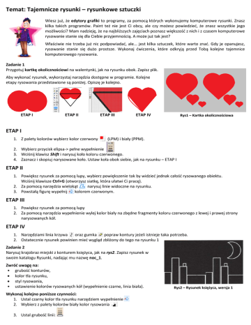 Temat: Tajemnicze rysunki – rysunkowe sztuczki Wiesz już, że edytory grafiki to programy, za pomocą których wykonujemy komputerowe rysunki. Znasz kilka takich programów. Paint też nie jest Ci obcy, ale czy możesz powiedzieć, że znasz wszystkie jego możliwości? Mam nadzieję, że na najbliższych zajęciach poznasz większość z nich i z czasem komputerowe rysowanie stanie się dla Ciebie przyjemnością. A może już tak jest? Właściwie nie trzeba już nic podpowiadać, ale... jest kilka sztuczek, które warto znać. Gdy je opanujesz, rysowanie stanie się dużo prostsze. Wykonaj ćwiczenia, które odkryją przed Tobą kolejne tajemnice komputerowego rysowania. Zadanie 1 Przygotuj kartkę okolicznościowi na walentynki, jak na rysunku obok. Zapisz plik. Aby wykonać rysunek, wykorzystaj narzędzia dostępne w programie. Kolejne etapy rysowania przedstawione są poniżej. Opiszę je kolejno. ETAP I ETAP II ETAP III ETAP IV Rys1 – Kartka okolicznościowa ETAP I 1. Z palety kolorów wybierz kolor czerwony (LPM) i biały (PPM). 2. Wybierz przycisk elipsa-> pełne wypełnienie 3. Wciśnij klawisz Shift i narysuj koło koloru czerwonego. 4. Zaznacz i skopiuj narysowane koło. Ustaw koła obok siebie, jak na rysunku – ETAP I ETAP II 1. Powiększ rysunek za pomocą lupy, wybierz powiększenie tak by widzieć jednak całość rysowanego obiektu. Wciśnij klawisze Ctrl+G (otworzysz siatkę, która ułatwi Ci pracę). 2. Za pomocą narzędzia wielokąt narysuj linie widoczne na rysunku. 3. Powstałą figurę wypełnij kolorem czerwonym. ETAP III 1. Powiększ rysunek za pomocą lupy 2. Za pomocą narzędzia wypełnienie wylej kolor biały na zbędne fragmenty koloru czerwonego z lewej i prawej strony narysowanych kół. ETAP IV 1. Narzędziami linia krzywa oraz gumka popraw kontury jeżeli istnieje taka potrzeba. 2. Ostatecznie rysunek powinien mieć wygląd zbliżony do tego na rysunku 1 Zadanie 2 Narysuj krajobraz miejski z konturem księżyca, jak na rys2. Zapisz rysunek w swoim katalogu Rysunki, nadając mu nazwę noc_1. Zwróć uwagę na: • grubość konturów, kolor tła rysunku, styl rysowania, • ustawienie kolorów rysowanych kół (wypełnienie czarne, linia biała). Wykonaj kolejno poniższe czynności: 1. Ustal czarny kolor tła rysunku narzędziem wypełnienie 2. Wybierz z palety kolorów biały kolor rysowania 3. Ustal grubość linii: Rys2 – Rysunek księżyca, wersja 1 4. Za pomocą narzędzia elipsa – kontur narysuj dwa zachodzące na siebie koła (pamiętaj o wciśnięciu klawisza Shift). Możesz skopiować pierwsze z narysowanych kół i wkleić, jak pokazuje rysunek obok. Zwróć uwagę na 2 elementy oznaczone strzałkami 5. Zmaż nadmiarowe kreski w miejscu przecięcia kół. Zobaczysz je dokładniej, jeśli ustawisz powiększenie za pomocą narzędzia lupa (6x lub 8x) i wciśniesz kombinację klawiszy Ctrl+G. Zadanie najlepiej wykonać ołówkiem. 6. Wypełnij kolorem czarnym odcięty fragment linii 7. Zapisz plik GOTOWE Zadanie 3 Zastanów się, jak wykonać rysunek przedstawiony obok — tęczowe koło. Nie jest to łatwe zadanie. Przedyskutuj swój pomysł zkolega lub koleżanką zklasy. Czy Wasze pomysły się różnią? Zadanie 4 Wtym ćwiczeniu również zastosowana została pewna sztuczka, aby koło ratunkowe wyglądało na prawdziwe. Zaprezentuj klasie swój pomysł na jego wykonanie. Zadanie 5 Wykonaj rysunek sympatycznej buźki ze znanej, bardzo starej gry Pac-man Zapisz plik Zadanie 5 Narysuj biedronkę Praca domowa • Wjaki sposób narysować idealne koło? • Wymień cztery narzędzia programu Paint użyte podczas pracy nad rysunkami i opisz je. Co robią, jak zmienić ich właściwości, co można za ich pomocą wykonać. • Wykonaj jedną z propozycji i wyślij emailem (załącznik) do nauczyciela informatyki. Nie zapomnij się podpisać 1. Wykonaj krajobraz górski w tym zadaniu została zastosowana pewna sztuczka – jaka? 2. W programie Paint narysuj ważkę 3. Wykonaj rysunek przedstawiający faz księżyca
