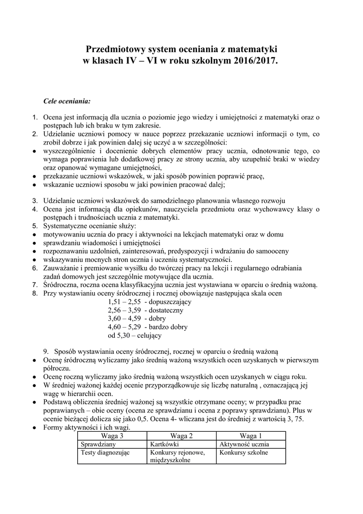 Przedmiotowy system oceniania z matematyki w klasach IV – VI w roku szkolnym 2016/2017. Cele oceniania: 1. Ocena jest informacją dla ucznia o poziomie jego wiedzy i umiejętności z matematyki oraz o postępach lub ich braku w tym zakresie. 2. Udzielanie uczniowi pomocy w nauce poprzez przekazanie uczniowi informacji o tym, co zrobił dobrze i jak powinien dalej się uczyć a w szczególności: wyszczególnienie i docenienie dobrych elementów pracy ucznia, odnotowanie tego, co wymaga poprawienia lub dodatkowej pracy ze strony ucznia, aby uzupełnić braki w wiedzy oraz opanować wymagane umiejętności, ● przekazanie uczniowi wskazówek, w jaki sposób powinien poprawić pracę, ● wskazanie uczniowi sposobu w jaki powinien pracować dalej; ● 3. Udzielanie uczniowi wskazówek do samodzielnego planowania własnego rozwoju 4. Ocena jest informacją dla opiekunów, nauczyciela przedmiotu oraz wychowawcy klasy o postępach i trudnościach ucznia z matematyki. Systematyczne ocenianie służy: motywowaniu ucznia do pracy i aktywności na lekcjach matematyki oraz w domu sprawdzaniu wiadomości i umiejętności rozpoznawaniu uzdolnień, zainteresowań, predyspozycji i wdrażaniu do samooceny wskazywaniu mocnych stron ucznia i uczeniu systematyczności. Zauważanie i premiowanie wysiłku do twórczej pracy na lekcji i regularnego odrabiania zadań domowych jest szczególnie motywujące dla ucznia. 7. Śródroczna, roczna ocena klasyfikacyjna ucznia jest wystawiana w oparciu o średnią ważoną. 8. Przy wystawianiu oceny śródrocznej i rocznej obowiązuje następująca skala ocen 1,51 – 2,55 - dopuszczający 2,56 – 3,59 - dostateczny 3,60 – 4,59 - dobry 4,60 – 5,29 - bardzo dobry od 5,30 – celujący 5. ● ● ● ● 6. ● ● ● ● ● 9. Sposób wystawiania oceny śródrocznej, rocznej w oparciu o średnią ważoną Ocenę śródroczną wyliczamy jako średnią ważoną wszystkich ocen uzyskanych w pierwszym półroczu. Ocenę roczną wyliczamy jako średnią ważoną wszystkich ocen uzyskanych w ciągu roku. W średniej ważonej każdej ocenie przyporządkowuje się liczbę naturalną , oznaczającą jej wagę w hierarchii ocen. Podstawą obliczenia średniej ważonej są wszystkie otrzymane oceny; w przypadku prac poprawianych – obie oceny (ocena ze sprawdzianu i ocena z poprawy sprawdzianu). Plus w ocenie bieżącej dolicza się jako 0,5. Ocena 4- wliczana jest do średniej z wartością 3, 75. Formy aktywności i ich wagi. Waga 3 Waga 2 Waga 1 Sprawdziany Testy diagnozując Kartkówki Konkursy rejonowe, międzyszkolne Aktywność ucznia Konkursy szkolne Konkursy międzynarodowe, ogólnopolskie Inne testy diagnozujące Odpowiedzi ustne Prace w grupach Konkurs wojewódzki z matematyki Ćwiczenia praktyczne w tym projekty Zeszyt ćwiczeń, zadania domowe Zeszyt przedmiotowy 10. Liczbę i częstotliwość pomiarów osiągnięć edukacyjnych ucznia przedstawia tabela poniżej. Formy aktywności Prace klasowe Kartkówki Odpowiedzi ustne Zeszyty ćwiczeń/ zeszyt przedmiotowy Zadania domowe Aktywność na lekcji Prace długoterminowe/ projekty/ ćwiczenia praktyczne Zadania dodatkowe Udział w konkursach 1. 2. 3. 4. 5. 6. 7. Częstotliwość w każdym okresie. 2 lub więcej (po zakończeniu działu) co najmniej 4 co najmniej 1 co najmniej 1 co najmniej 1 na bieżąco co najmniej 1 na bieżąco na bieżąco Kontrakt Ocenie podlegają następujące formy aktywności ucznia: a)wypowiedź ustna, b)prace pisemne: ● prace klasowe - zakres całego działu – jednostka lekcyjna ● zadania domowe, ● kartkówki – zakres 2-3 ostatnich lekcji, niezapowiedziane – 10-15 min c)wykonywanie ćwiczeń praktycznych, d) projekty e)aktywność na lekcjach f)szczególne osiągnięcia w konkursach g)systematyczne, staranne prowadzenie zeszytu przedmiotowego Prace klasowe i kartkówki są obowiązkowe, uczniowie nieobecni powinni je napisać w terminie uzgodnionym z nauczycielem. Prace klasowe są zapowiadane tydzień wcześniej. Uczeń ma prawo poprawić ocenę bieżącą (oprócz celującej i bardzo dobrej) w ciągu dwóch tygodni (lub w terminie ustalonym z nauczycielem). Forma poprawy może być pisemna lub ustna. Ocena z poprawy jest wpisywana obok oceny poprawianej. Każda ocena niedostateczna powinna być poprawiona. Prace pisemne ocenia się punktowo. Dla ustalenia ocen cyfrowych stosowane są progi przeliczeniowe według następującej skali: -celujący 96% -100 % -bardzo dobry 91% -95 % -dobry 75% -90 % -dostateczny 51% -74 % -dopuszczający 31% - 50% -niedostateczny 0% - 3 0% Ocenę z „+” otrzymuje uczeń, którego punktacja znajduje się w górnej granicy procentowej. Ocenę z „-” otrzymuje uczeń, którego punktacja znajduje się w dolnej granicy procentowej. 8. Uczeń może otrzymać „+” za pracę na lekcji. Zdobycie 3 plusów jest równoznaczne z otrzymaniem oceny bardzo dobrej. 9. W trakcie każdego okresu uczeń uzyskuje przynajmniej 5 ocen. 10. Uczeń ma prawo dwa razy w okresie zgłosić nieprzygotowanie do lekcji (brak pracy domowej). Za trzecim razem otrzymuje ocenę niedostateczną. 11. O fakcie nieprzygotowania uczeń informuje nauczyciela przed rozpoczęciem lekcji. 12. Informacje o postępach i trudnościach ucznia w nauce są umieszczane w postaci komentarza do oceny w dzienniku elektronicznym, na pracy ucznia lub w formie ustnej. 13. Oceny są jawne dla ucznia, jego rodziców, opiekunów. 14. Prace pisemne są udostępnione rodzicom, prawnym opiekunom podczas konsultacji z nauczycielami lub do domu na okres nie dłuższy niż 5 dni roboczych. 15. Oceny z ustnych form sprawdzania wiedzy i umiejętności uzasadniane są przez nauczyciela w formie ustnej skierowanej do ucznia. Uzasadnienie zawiera informacje dotyczące dobrze opanowanej wiedzy i umiejętności, brakach i zaleceniach do realizacji. Procedura dodatkowego sprawdzania wiadomości i umiejętności ucznia W wyjątkowych przypadkach, określonych w Statucie Szkoły, nauczyciel może wyrazi