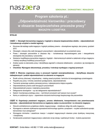 SZKOLENIA ∣ DORADZTWO ∣ REALIZACJE Program szkolenia pt.: „Odpowiedzialność kierownika i pracodawcy w obszarze bezpieczeństwa procesów pracy” MAGAZYN I LOGISTYKA WYKŁAD CZĘŚĆ I. Obowiązki kierownictwa magazynu i logistyki w obszarze bezpieczeństwa obiektu – odpowiedzialność i konsekwencje uchybień w świetle legislacji Kluczowe dla każdego szefa magazynu i logistyki podstawy prawne – obowiązkowe regulacje, stan prawny: grudzień 2015 Obowiązki z obszaru bhp osób kierujących pracownikami i odpowiedzialnych za przestrzeń pracy Prawa i obowiązki pracowników w obszarze bhp – konsekwencje nieprzestrzegania praw i niewypełniania obowiązków dla pracodawcy i pracownika Szkolenia i kwalifikacje pracowników magazynu i logistyki – lista koniecznych szkoleń w zależności od typu magazynu i metody weryfikacji kwalifikacji pracowniczych Analiza ryzyka na stanowisku pracy i identyfikacja zagrożeń́ w obszarze składowania – procedura i jej newralgiczne elementy Checklista: Wymagane dokumentacje, procedury i instrukcje wynikające z regulacji prawnych CZĘŚĆ II. Właściwa organizacja pracy w procesach logistyki wewnątrzzakładowej – identyfikacja obszarów niebezpiecznych i podział odpowiedzialności za zdarzenia na magazynie Środki ochrony zbiorowej i indywidualnej – katalog zasad przydziału i terminów do bezwzględnego przestrzegania Wypadki przy pracy i choroby zawodowe (postępowanie, odpowiedzialność) Tworzenie sprawnego systemu pierwszej pomocy i zabezpieczenia miejsca wypadku Odpowiedzialność prawna osób kierujących pracownikami Odpowiedzialność́ prawna i materialna pracowników Delegowanie obowiązków – czy też delegowanie odpowiedzialności? Nadzór i koordynacja przebiegu pracy – nad którymi procesami szef zawsze musi czuwać? Normy w codziennym użyciu – zapewnienie otoczenia technicznego bezpiecznego dla pracowników CZĘŚĆ III. Organizacja przestrzeni magazynu, procesu składowania, transportowania oraz przemieszczania ładunków – odpowiedzialność kierownictwa za negatywny wpływ na pracowników i na otoczenie magazynu Warunki architektoniczno-projektowe obiektu magazynowego – dodatkowe obligo dla szefa magazynu Wymagania w zakresie użytkowania wyposażenia technicznego zgodnie z przepisami – na jakie uszkodzenia sprzętu kierownictwo musi zareagować? Wymagania minimalne i zasadnicze maszyn i urządzeń magazynowych stawiane przez dyrektywy maszynową i narzędziową Oznakowanie przestrzeni magazynowej w zależności od jej rodzaju i spełnianych funkcji – kryteria poprawności KONTAKT: Emilia Melon +48 882 117 850 [email protected] SZKOLENIA ∣ DORADZTWO ∣ REALIZACJE Zabezpieczenie przestrzeni stwarzających szczególne zagrożenie (działanie substancji chemicznych, strefy zagrożone wybuchem, hałas i drgania itp.) – minimalizowanie wpływu na pracowników i na otoczenie magazynu, możliwe konsekwencje zaniechań Kreowanie kultury technicznej pracowników w zapewnieniu bezpieczeństwa na magazynie Wyposażenie technologiczne obiektu i jego wpływ na środowisko wewnątrz i na zewnątrz przedsiębiorstwa – bezpieczeństwo jako konieczne kryterium decyzji inwestycyjnych CZĘŚĆ IV. Kontrole organów państwowych – sankcje i najczęściej stwierdzane uchybienia, kary nakładane na kierownictwo Urząd Dozoru Technicznego i Państwowa Straż pożarna Państwowa Inspekcja Pracy Państwowa Inspekcja Sanitarna i Wojewódzki Inspektorat Ochrony Środowiska Nakazy i zakazy użytkowania w podziale na obszary podlegające kontroli Grzywny i zarzuty karne – najcięższe konsekwencje, jak ich unikać CZĘŚĆ V. Katalog typowych „słabości” magazynu – wybrane przykłady, omówienie w świetle zagrożenia bezpieczeństwa i konsekwencji dla osób zarządzających przestrzenią magazynową WARSZTAT PRAKTYCZNY CZĘŚĆ I. Drogi transportowe wewnątrzzakładowe – zastosowanie w praktyce normy PN-68/M-78010 Zaprojektowanie dróg transportowych oraz rozmieszczenie elementów mających wpływ na bezpieczeństwo obiektu, zgodnie z wytycznymi projektowymi, przepisami i normami, rodzajem składowanych materiałów i dostępnym wyposażeniem, przepisami i zasadami BHP oraz P.POŻ. Weryfikacja przygotowanych planów, konsultacje z trenerem CZĘŚĆ II. Regały magazynowe – eksploatacja, przeglądy, wymagania – zastosowanie w praktyce normy PN-EN 15635-2010 ćwiczenia na bazie wybranych realizacji, studia przypadku, w tym m.in. Zasady montażu Przeglądy okresowe Konieczność wycofania z użytkowania elementów konstrukcyjnych, osprzętu, palet KONTAKT: Emilia Melon +48 882 117 850 [email protected]