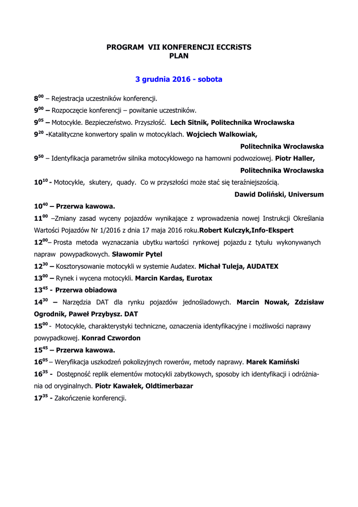 PROGRAM VII KONFERENCJI ECCRiSTS PLAN 3 grudnia 2016 - sobota 800 – Rejestracja uczestników konferencji. 900 – Rozpoczęcie konferencji – powitanie uczestników. 905 – Motocykle. Bezpieczeństwo. Przyszłość. Lech Sitnik, Politechnika Wrocławska 920 -Katalityczne konwertory spalin w motocyklach. Wojciech Walkowiak, Politechnika Wrocławska 950 – Identyfikacja parametrów silnika motocyklowego na hamowni podwoziowej. Piotr Haller, Politechnika Wrocławska 1010 - Motocykle, skutery, quady. Co w przyszłości może stać się teraźniejszością. Dawid Doliński, Universum 1040 – Przerwa kawowa. 1100 –Zmiany zasad wyceny pojazdów wynikające z wprowadzenia nowej Instrukcji Określania Wartości Pojazdów Nr 1/2016 z dnia 17 maja 2016 roku.Robert Kulczyk,Info-Ekspert 1200– Prosta metoda wyznaczania ubytku wartości rynkowej pojazdu z tytułu wykonywanych napraw powypadkowych. Sławomir Pytel 1230 – Kosztorysowanie motocykli w systemie Audatex. Michał Tuleja, AUDATEX 1300 – Rynek i wycena motocykli. Marcin Kardas, Eurotax 1345 - Przerwa obiadowa 1430 – Narzędzia DAT dla rynku pojazdów jednośladowych. Marcin Nowak, Zdzisław Ogrodnik, Paweł Przybysz. DAT 1500 - Motocykle, charakterystyki techniczne, oznaczenia identyfikacyjne i możliwości naprawy powypadkowej. Konrad Czwordon 1545 – Przerwa kawowa. 1605 – Weryfikacja uszkodzeń pokolizyjnych rowerów, metody naprawy. Marek Kamiński 1635 - Dostępność replik elementów motocykli zabytkowych, sposoby ich identyfikacji i odróżniania od oryginalnych. Piotr Kawałek, Oldtimerbazar 1735 - Zakończenie konferencji. Termin konferencji – 03.12.2016 Miejsce konferencji – Wrocław, Hotel Śląsk, ul. Oporowska 60, 53-434 Wrocław, Koszt konferencji – 450,00 złotych brutto Termin zgłoszenia i opłaty - do dnia 21.11.2016 roku (poniedziałek) Zgłoszenia proszę wysyłać mailem na adres: [email protected] Nr konta: TUVPOL Sp. z o.o. 53-332 Wrocław, ul. Powstańców Śląskich 5 Bank: BZ WBK S.A. 27 o/Wrocław 74 1090 2398 0000 0006 0802 4999 W ramach szkolenia zapewniamy: materiały konferencyjne wyżywienie Informacji udziela Zbigniew Kardas, tel. 664 984 862; 71 361 04 54