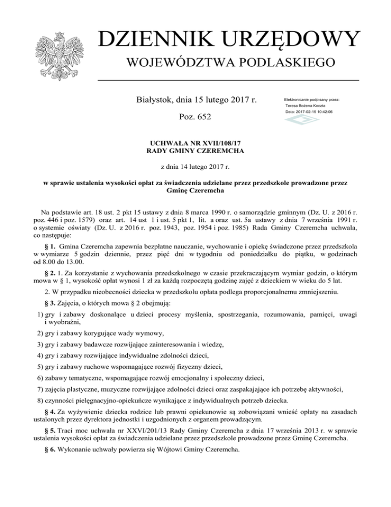 DZIENNIK URZĘDOWY WOJEWÓDZTWA PODLASKIEGO Białystok, dnia 15 lutego 2017 r. Elektronicznie podpisany przez: Teresa Bożena Koczta Poz. 652 Data: 2017-02-15 10:42:06 UCHWAŁA NR XVII/108/17 RADY GMINY CZEREMCHA z dnia 14 lutego 2017 r. w sprawie ustalenia wysokości opłat za świadczenia udzielane przez przedszkole prowadzone przez Gminę Czeremcha Na podstawie art. 18 ust. 2 pkt 15 ustawy z dnia 8 marca 1990 r. o samorządzie gminnym (Dz. U. z 2016 r. poz. 446 i poz. 1579) oraz art. 14 ust 1 i ust. 5 pkt 1, lit. a oraz ust. 5a ustawy z dnia 7 września 1991 r. o systemie oświaty (Dz. U. z 2016 r. poz. 1943, poz. 1954 i poz. 1985) Rada Gminy Czeremcha uchwala, co następuje: § 1. Gmina Czeremcha zapewnia bezpłatne nauczanie, wychowanie i opiekę świadczone przez przedszkola w wymiarze 5 godzin dziennie, przez pięć dni w tygodniu od poniedziałku do piątku, w godzinach od 8.00 do 13.00. § 2. 1. Za korzystanie z wychowania przedszkolnego w czasie przekraczającym wymiar godzin, o którym mowa w § 1, wysokość opłat wynosi 1 zł za każdą rozpoczętą godzinę zajęć z dzieckiem w wieku do 5 lat. 2. W przypadku nieobecności dziecka w przedszkolu opłata podlega proporcjonalnemu zmniejszeniu. § 3. Zajęcia, o których mowa § 2 obejmują: 1) gry i zabawy doskonalące u dzieci procesy myślenia, spostrzegania, rozumowania, pamięci, uwagi i wyobraźni, 2) gry i zabawy korygujące wady wymowy, 3) gry i zabawy badawcze rozwijające zainteresowania i wiedzę, 4) gry i zabawy rozwijające indywidualne zdolności dzieci, 5) gry i zabawy ruchowe wspomagające rozwój fizyczny dzieci, 6) zabawy tematyczne, wspomagające rozwój emocjonalny i społeczny dzieci, 7) zajęcia plastyczne, muzyczne rozwijające zdolności dzieci oraz zaspakajające ich potrzebę aktywności, 8) czynności pielęgnacyjno-opiekuńcze wynikające z indywidualnych potrzeb dziecka. § 4. Za wyżywienie dziecka rodzice lub prawni opiekunowie są zobowiązani wnieść opłaty na zasadach ustalonych przez dyrektora jednostki i uzgodnionych z organem prowadzącym. § 5. Traci moc uchwała nr XXVI/201/13 Rady Gminy Czeremcha z dnia 17 września 2013 r. w sprawie ustalenia wysokości opłat za świadczenia udzielane przez przedszkole prowadzone przez Gminę Czeremcha. § 6. Wykonanie uchwały powierza się Wójtowi Gminy Czeremcha. Dziennik Urzędowy Województwa Podlaskiego –2– Poz. 652 § 7. 1. Uchwała wchodzi w życie po upływie 14 dni od dnia ogłoszenia w Dzienniku Urzędowym Województwa Podlaskiego z mocą obowiązującą z dniem 01 stycznia 2017 r. Przewodniczący Rady Sergiusz Smyk Dziennik Urzędowy Województwa Podlaskiego –3– Poz. 652 Uzasadnienie Zmiana w ustawie o systemie oświaty, która weszła w życie 9 grudnia 2016 r. wymusza wydanie przez rady gminy nowych uchwał w sprawie wysokości opłat za korzystanie z wychowania przedszkolnego Konieczność podjęcia uchwały wynika ze zmiany z art. 2 pkt 1 ustawy z dnia 1 grudnia 2016 r. o zmianie ustawy o dochodach jednostek samorządu terytorialnego oraz niektórych innych ustaw (Dz. U. z 2016 poz. 1985). Na skutek nowelizacji art. 14 ust. 1 ustawy o systemie oświaty otrzymał brzmienie: Rada gminy określa wysokość opłat za korzystanie z wychowania przedszkolnego dzieci w wieku do 5 lat w prowadzonych przez gminę w placówkach. Zniesiono możliwość pobierania przez organ prowadzący opłat za pobyt dziecka w wieku 6 lat i powyżej w publicznej placówce wychowania przedszkolnego. Na tej podstawie zaktualizowano brzmienie § 3 ust. 1 niniejszej uchwały wprowadzając zapis, że opłaty za świadczenia udzielane przez przedszkola w czasie przekraczającym bezpłatny wymiar zajęć, pobiera się za zajęcia z dzieckiem w wieku do 5 lat. Wyłączenie dzieci 6-letnich z opłat za pobyt przedszkolu związane jest z ustaleniem dla gmin od 1 stycznia 2017 r. w części oświatowej subwencji ogólnej na każde dziecko 6-letnie korzystające z wychowania przedszkolnego. Przewidywana średnia kwota subwencji na 6-letnie dziecko w przedszkolu ma wynieść ok. 4.135 zł. Roczna kwota dotacji przedszkolnej z budżetu państwa w 2017 r. na dziecko do lat 5 będzie wynosić około 1338 zł.