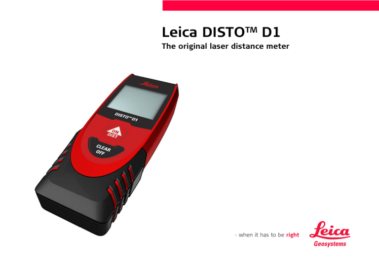 Leica DISTOTM D1 The original laser distance meter Przegląd 2 Dane techniczne 3 Konfiguracja urządzenia 5 Obsługa 11 Kody komunikatów 14 Pielęgnacja 15 Gwarancja 16 Wskazówki bezpieczeństwa 17 Leica DISTO™ D1 1 Przegląd Prz e g lą d Leica DISTO™ to dalmierz laserowy zawierający laser klasy 2. Patrz rozdział Dane techniczne w celu uzyskania informacji na temat zakresu zastosowania. 1 Wyświetlacz 2 Załączanie/pomiar 3 Kasowanie/wyłączanie Leica DISTO™ D1 2 Dane techniczne Da n e te c h n ic z n e Informacje ogólne Dokładność w warunkach korzystnych * 2 mm / 0,08 in *** Dokładność w warunkach niekorzystnych ** 3 mm / 1/8" *** Zasięg w warunkach korzystnych * 0,2 - 40 m / 0,6 - 120 ft *** Dokładność w warunkach niekorzystnych ** 0,2 - 30 m / 0,6 - 100 ft *** Najmniejsza wyświetlana jednostka 0,1 mm / 1/32 in Klasa lasera 2 Typ lasera 635 nm, < 1 mW ø punktu lasera | na odległościach 6 / 30 / 60 mm | 10 / 50 / 100 m Stopień ochrony IP54 (odporność na pył i rozpryskujące się krople wody) Automatyczne wyłączenie lasera po 90 s Automatyczne wyłączenie lasera po 180 s Bluetooth® Smart Bluetooth® v4.0 Zasięg Bluetooth® Smart <10m Żywotność baterii (2 x AAA) do 10000 pomiarów Wymiary (wys. x gł. x szer.) 115 x 43,5 x 23,5 mm | 4,53 x 1,71 x 0,93 cala Waga (z bateriami) 87 g / 3,07 oz Zakres temperatury przechowywania | pracy -25 do 70°C / -13 do 158°F | -0 do 40°C / 32 do 104°F * Warunki korzystne: białe obiekty powodujące odbicie rozproszone (ściana pomalowana na biało), niskie oświetlenie tła i umiarkowane temperatury. ** Warunki niekorzystne: obiekty o niskim lub wysokim współczynniku odbicia lub wysokie oświetlenie tła lub temperatury w określonym zakresie dolnym lub górnym. *** Zakres dotyczy przedziału od 0,05 m do 5 m na poziomie ufności 95%. W warunkach korzystnych zakres tolerancji może pogorszyć się o 0,10 mm/m dla odległości powyżej 5 m. W warunkach niekorzystnych zakres tolerancji może pogorszyć się o 0,15 mm/m dla odległości powyżej 5 m. Leica DISTO™ D1 3 Dane techniczne Funkcje Pomiar odległości tak Pomiar ciągły tak Sygnał dźwiękowy tak Podświetlany ekran tak Bluetooth® Smart tak Leica DISTO™ D1 4 Konfiguracja urządzenia Ko n fig u ra c ja u rz ą d z e n ia Wstęp Przed pierwszym użyciem produktu należy dokładnie przeczytać instrukcję obsługi ze szczególnym uwzględnieniem wskazówek bezpieczeństwa (patrz Wskazówki bezpieczeństwa). Osoba odpowiedzialna za produkt musi dopilnować, aby wszyscy użytkownicy zrozumieli treść instrukcji obsługi i przestrzegali zawartych w niej wskazówek. Leica DISTO™ D1 Użyte w instrukcji symbole mają następujące znaczenie: OSTRZEŻENIE i/lub doprowadzić do szkód materialnych, finansowych i środowiskowych. Ważne akapity, których należy przestrzegać, aby zapewnić prawidłowe i efektywne działanie produktu. Wskazuje na potencjalnie niebezpieczną sytuację lub nieprawidłowe zastosowanie, które może spowodować śmierć lub poważne obrażenia ciała. UWAGA Wskazuje na potencjalnie niebezpieczną sytuację lub nieprawidłowe zastosowanie, które może spowodować małe obrażenia 5 Konfiguracja urządzenia Wkładanie baterii Aby zapewnić prawidłowe działanie, zalecamy stosowanie wysokiej jakości baterii alkalicznych. Baterie należy wymienić, gdy zacznie migać symbol baterii. Leica DISTO™ D1 6 Konfiguracja urządzenia Załączanie/wyłączanie Urządzenie jest wyłączone. Leica DISTO™ D1 7 Konfiguracja urządzenia Kasowanie Cofnij poprzednią operację. Leica DISTO™ D1 Pozostaw aktualną funkcję i przejdź w domyślny tryb pracy. 8 Konfiguracja urządzenia Kody komunikatów Jeśli pojawi się symbol informacji „i” z liczbą, przeczytaj wskazówki w rozdziale Kody komunikatów. Przykład: Leica DISTO™ D1 9 Konfiguracja urządzenia Ustawienia Naciśnij oba przyciski równocześnie. Wybierz jedną z następujących jednostek: 0,000 m 0'00" 1/16 0,0000 m 0,000 cala 0,00 ft 0 cala 1/16 Leica DISTO™ D1 10 Obsługa Ob s łu g a Pomiar pojedynczej odległości Pomiary ciemnych powierzchni trwają dłużej. Naprowadź aktywną wiązkę lasera na cel. Leica DISTO™ D1 Powierzchnie docelowe: Mogą wystąpić błędy pomiarowe podczas celowania do bezbarwnych cieczy, szkła, styropianu, półprzeźroczystych lub lśniących powierzchni. 11 Obsługa Pomiar ciągły Ostatnia zmierzona wartość wyświetlana jest na pasku głównym. Leica DISTO™ D1 Zatrzymanie pomiarów ciągłych. 12 Obsługa Bluetooth® Smart DISTO™ sketch. Skorzystaj z aplikacji do transferu danych Bluetooth®. We włączonym urządzeniu funkcja Bluetooth® Smart jest zawsze aktywna. Utwórz połączenie między urządzeniem a smartfonem, tabletem lub laptopem. Wartość pomiarowe zostaną przesłane automatycznie po zakończeniu pomiaru. Efektywny i innowacyjny moduł Bluetooth® Smart (z nowym standardem Bluetooth® V4.0) jest Leica DISTO™ D1 kompatybilny ze wszystkimi urządzeniami Bluetooth® Smart Ready. Wszystkie pozostałe urządzenia Bluetooth® nie obsługują zintegrowanego, energooszczędnego modułu Bluetooth® Smart. Producent nie zapewnia gwarancji na darmowe oprogramowanie DISTO™ ani wsparcia technicznego. Producent nie ponosi żadnej odpowiedzialności za używanie darmowego oprogramowania i nie zobowiązuje się do udoskonalania go ani aktualizowania. Szeroki zakres oprogramowania komercyjnego dostępny jest na stronie internetowej. Aplikacje do systemu Android® lub iOS dostępne są w specjalistycznych sklepach internetowych. Szczegóły dostępne są na naszej stronie internetowej. 13 Kody komunikatów Ko d y k o mu n ik a tó w Nr Przyczyna Środki zaradcze 204 Błąd obliczeń Wykonaj ponownie pomiar. 220 Błąd sprzętu Skontaktuj się ze sprzedawcą 240 Błąd transferu danych Podłącz urządzenie i powtórz procedurę 252 Za wysoka temperatura Pozostaw urządzenie do schłodzenia. 253 Za niska temperatura Rozgrzej u