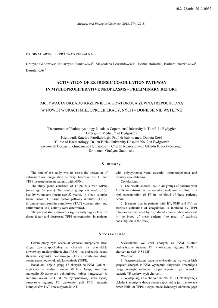 10.2478/mbs-2013-0032 Medical and Biological Sciences, 2013, 27/4, 27-31 ORIGINAL ARTICLE / PRACA ORYGINALNA Grażyna Gadomska2, Katarzyna Stankowska1, Magdalena Lewandowska1, Joanna Boinska1, Barbara Ruszkowska1, Danuta Rość1 ACTIVATION OF EXTRINSIC COAGULATION PATHWAY IN MYELOPROLIFERATIVE NEOPLASMS – PRELIMINARY REPORT AKTYWACJA UKŁADU KRZEPNIĘCIA KRWI DROGĄ ZEWNĄTRZPOCHODNĄ W NOWOTWORACH MIELOPROLIFERACYJNYCH – DONIESIENIE WSTĘPNE 1 Department of Pathophysiology Nicolaus Copernicus University in Toruń, L. Rydygier Collegium Medicum in Bydgoszcz Kierownik Katedry Patofizjologii: Prof. dr hab. n. med. Danuta Rość 2 Clinic of Haematology, Dr Jan Biziel University Hospital No. 2 in Bydgoszcz Kierownik Oddziału Klinicznego Hematologii i Chorób Rozrostowych Układu Krwiotwórczego: Dr n. med. Grażyna Gadomska Summary The aim of the study was to assess the activation of extrinsic blood coagulation pathway, based on the TF and TFPI measurements in patients with MPNs. The study group consisted of 17 patients with MPNs (mean age 59 years). The control group was made of 30 healthy volunteers (mean age 52 years). In blood samples tissue factor TF, tissue factor pathway inhibitor (TFPI), thrombin–antithrombin complexes (TAT) concentration and antithrombin (AT) activity were determined. The present study showed a significantly higher level of tissue factor and decreased TFPI concentration in patients with polycythemia vera, essential thrombocythemia and primary myelofibrosis. Conclusions: 1. The results showed that in all groups of patients with MPNs an extrinsic activation of coagulation, resulting in a high concentration of TF in the blood of these patients, occurs. 2. It seems that in patients with ET, PMF and PV, an extrinsic activation of coagulation is inhibited by TFPI inhibitor as evidenced by its reduced concentration observed in the blood of these patients (the result of extrinsic consumption in the track). Streszczenie Celem pracy była ocena aktywności krzepnięcia krwi drogą zewnątrzpochodną u chorych na przewlekłe nowotwory mieloproliferacyjne (PZM), na podstawie oceny stężenia czynnika tkankowego (TF) i inhibitora drogi zewnątrzpochodnej układu krzepnięcia (TFPI). Badaniami objęto grupę 17 chorych na PZM (kobiet i mężczyzn w średnim wieku 59 lat). Grupę kontrolną stanowiło 30 zdrowych ochotników, kobiet i mężczyzn w średnim wieku 52,4 lat. W cytrynianowej krwi żylnej oznaczono stężenie TF, całkowitej puli TFPI, stężenie kompleksów TAT oraz aktywności AT. Stwierdzono we krwi chorych na PZM istotnie podwyższone stężenie TF, a obniżone stężenie TFPI u chorych na CzP, NS i MF. Wnioski: 1. Przeprowadzone badania wykazały, że we wszystkich grupach chorych z PZM występuje aktywacja krzepnięcia drogą zewnątrzpochodną, czego wyrazem jest wysokie stężenie TF we krwi tych chorych. 2. Wydaje się, że u chorych na NS, MF i CzP aktywacja układu krzepnięcia drogą zewnątrzpochodną jest hamowana przez inhibitor TFPI, o czym może świadczyć obniżone jego 28 Grażyna Gadomska et al. stężenie obserwowane we krwi tych chorych (wynik zużycia w torze zewnątrzpochodnym). Key words: myeloproliferative neoplasms, tissue factor, tissue factor pathway inhibitor Słowa kluczowe: nowotwory mieloproliferacyjne, czynnik tkankowy, inhibitor zewnątrzpochodnej drogi krzepnięcia INTRODUCTION The first formal classification of myeloproliferative diseases was proposed in 1951 by William Dameshek. Dameshek’s concept assumed that these diseases result from the disturbances of mechanisms regulating normal hematopoiesis. Myeloproliferative neoplasms (MPNs) are clonal hematopoietic stem cell disorders, characterized by proliferation in the bone marrow of one or more of the myeloid (granulocytic, erythroid, mast cell and megakaryocytic) lineages [1]. MPNs are now classified into eight categories: 1) chronic myeloid leukemia (CML) 2) polycythemia vera (PV) 3) essential thrombocythemia (ET) 4) primary myelofibrosis (PMF) 5) systemic mastocytosis (SM) 6) chronic eosinophilic leukemia (CEL) not otherwise specified 7) chronic neutrophilic leukemia (CNL) 8) unclassifiable MPNs. MPN-unclassifiable is a group of MPN-like disorders that do not meet the diagnostic criteria for either the classic or non-classic MPNs. MPNs have a number of common features in the etiology, pathogenesis, clinical presentation, and treatment. In myeloproliferative neoplasms occurs clonal proliferation of all hemopoietic cell lines, of which the dominant one determines the type of disease. Clonal nature of hematopoiesis in MPNs was confirmed by the results of the studies concerning the isoenzymes of glucose-6-phosphate dehydrogenase (G6-PD). In heterozygous patients with myeloproliferative neoplasms in all somatic cells were observed two isoenzymes of G-6-PD (A and B), but in hematopoietic cells only one of them (type A or B). The loss of one isoenzyme started in multipotent stem cells, and then as a result of proliferation took up all the hematopoietic cells. Moreover, cytogenetic and molecular studies in chronic myeloid leukemia (CML) confirm the presence of the Ph chromosome and BCRABL fusion gene, which encodes a P 210 protein responsible for the malignant transformation [2]. Recent studies indicate the presence of a JAK2 mutation in patients with PV, ET and mutations in gene 10 (on chromosome X) as well as 11-13 in patients with PMF [3, 4]. In patients with MPNs are observed frequent hemostatic disturbances such as thrombotic disease and bleeding disorder. Recent reports indicate that the major and the most important pathway of coagulation is the extrinsic coagulation pathway, in which the key role plays a tissue factor (TF) and factor VII [5]. Data on the TF concentration in cancer are divergent, but there is single report, which indicates increased level of TF in patients with myeloproliferative diseases [6]. The major endogenous regulator of coagulation activation depen
