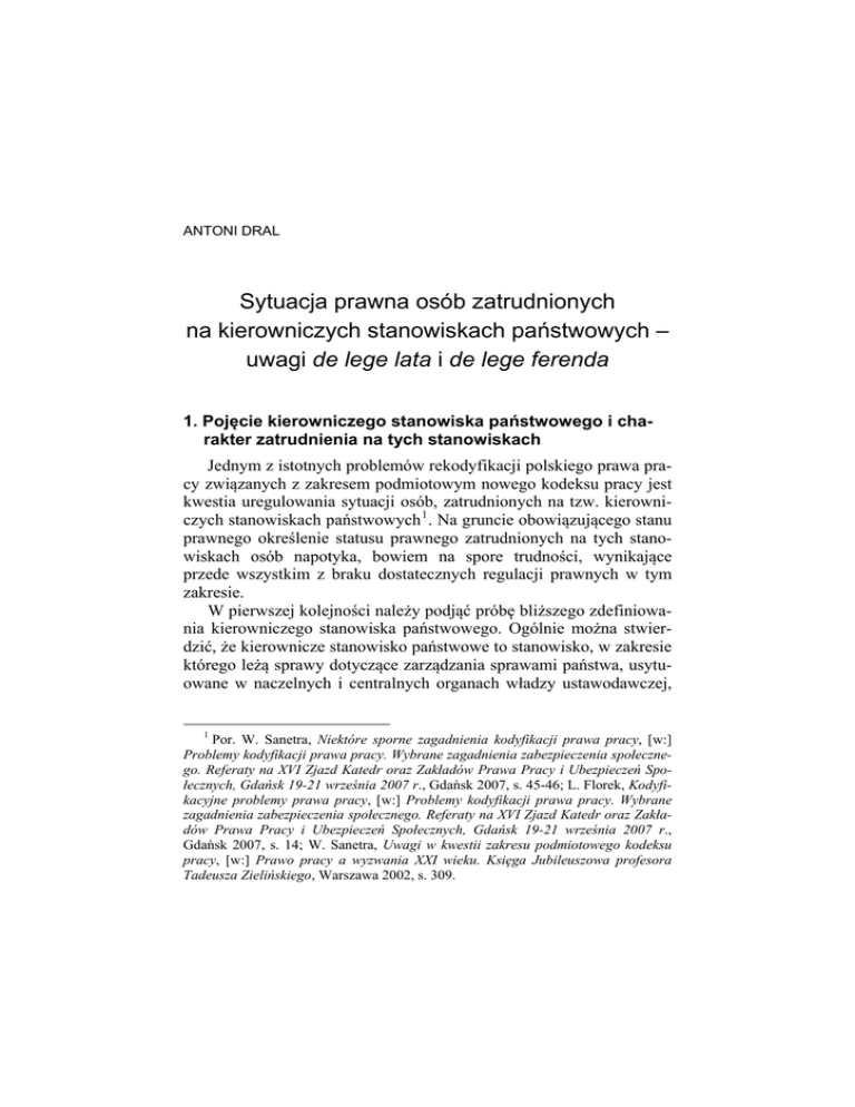 ANTONI DRAL Sytuacja prawna osób zatrudnionych na kierowniczych stanowiskach państwowych – uwagi de lege lata i de lege ferenda 1. Pojęcie kierowniczego stanowiska państwowego i charakter zatrudnienia na tych stanowiskach Jednym z istotnych problemów rekodyfikacji polskiego prawa pracy związanych z zakresem podmiotowym nowego kodeksu pracy jest kwestia uregulowania sytuacji osób, zatrudnionych na tzw. kierowniczych stanowiskach państwowych 1 . Na gruncie obowiązującego stanu prawnego określenie statusu prawnego zatrudnionych na tych stanowiskach osób napotyka, bowiem na spore trudności, wynikające przede wszystkim z braku dostatecznych regulacji prawnych w tym zakresie. W pierwszej kolejności należy podjąć próbę bliższego zdefiniowania kierowniczego stanowiska państwowego. Ogólnie można stwierdzić, że kierownicze stanowisko państwowe to stanowisko, w zakresie którego leżą sprawy dotyczące zarządzania sprawami państwa, usytuowane w naczelnych i centralnych organach władzy ustawodawczej, 1 Por. W. Sanetra, Niektóre sporne zagadnienia kodyfikacji prawa pracy, [w:] Problemy kodyfikacji prawa pracy. Wybrane zagadnienia zabezpieczenia społecznego. Referaty na XVI Zjazd Katedr oraz Zakładów Prawa Pracy i Ubezpieczeń Społecznych, Gdańsk 19-21 września 2007 r., Gdańsk 2007, s. 45-46; L. Florek, Kodyfikacyjne problemy prawa pracy, [w:] Problemy kodyfikacji prawa pracy. Wybrane zagadnienia zabezpieczenia społecznego. Referaty na XVI Zjazd Katedr oraz Zakładów Prawa Pracy i Ubezpieczeń Społecznych, Gdańsk 19-21 września 2007 r., Gdańsk 2007, s. 14; W. Sanetra, Uwagi w kwestii zakresu podmiotowego kodeksu pracy, [w:] Prawo pracy a wyzwania XXI wieku. Księga Jubileuszowa profesora Tadeusza Zielińskiego, Warszawa 2002, s. 309. Antoni Dral wykonawczej i sądowniczej 2 . Pomimo, iż Konstytucja RP z 1997 r. wymienia najwyższe stanowiska państwowe w tych organach, nie zawiera ogólnego pojęcia „kierowniczego stanowiska państwowego”, ograniczając się do wskazania najwyższych stanowisk w organach władzy ustawodawczej, wykonawczej i sądowniczej w państwie, bez bliższego określenia ich charakteru. Należą do nich takie stanowiska jak: Marszałek Sejmu i wicemarszałkowie, Marszałek Senatu i wicemarszałkowie, Prezydent, Prezes Rady Ministrów, Wiceprezesi Rady Ministrów, ministrowie, wojewoda, Pierwszy Prezes Sądu Najwyższego, Prezes Naczelnego Sądu Administracyjnego, Prezes i Wiceprezes Trybunału Konstytucyjnego, Prezes Najwyższej Izby Kontroli, Rzecznik Praw Obywatelskich, Członkowie Krajowej Rady Radiofonii i Telewizji. Wymienione w Konstytucji stanowiska państwowe mają różną naturę i charakter. Można wskazać wśród nich stanowiska kierownicze sensu stricto (np. minister) oraz stanowiska które, jak się wydaje, takiego charakteru nie mają (np. członek Rady Radiofoni i Telewizji). W literaturze wyrażony został pogląd, iż bardziej zasadne byłoby posługiwanie się dla określenia tych stanowisk terminem „wysokie stanowiska państwowe” 3 . W związku jednak z uchwaleniem ustawy z 24 sierpnia 2006 r. o państwowym zasobie kadrowym i wysokich stanowiskach państwowych 4 pogląd ten nie wydaje się obecnie przekonywujący. Termin „wysokie stanowiska państwowe” został bowiem przez ustawodawcę zarezerwowany dla najwyższych stanowisk kierowniczych określonych przez powołaną wyżej ustawę, w strukturach szeroko rozumianej administracji rządowej (art. 4 ustawy o państwowym zasobie kadrowym…). Pojęcie „kierowniczego stanowiska państwowego” występuje natomiast na gruncie ustawy z dnia 31 lipca 1981 r. o wynagrodzeniu osób zajmujących kierownicze stanowiska państwowe 5 . Przepisy po2 Szerzej na temat pojęcia stanowiska kierowniczego zob. T. Górzyńska, Stanowiska kierownicze w administracji państwowej, Ossolineum 1985, s. 39-40. 3 Por. W. Sanetra, Uwagi w kwestii zakresu podmiotowego kodeksu pracy, [w:] Prawo..., s. 309. 4 Dz. U. Nr 170, poz. 1217. 5 Dz. U. Nr 20, poz. 101 z późn. zm. 36 Sytuacja prawna osób zatrudnionych na kierowniczych stanowiskach… wołanej ustawy nie określają jednak w zasadzie żadnych szczegółowych materialnych elementów pojęcia państwowego stanowiska kierowniczego. Ustawa zawiera jedynie wyczerpujący wykaz kierowniczych stanowisk państwowych, ustalony dla celów związanych z wynagrodzeniem z tytułu zajmowanego kierowniczego stanowiska państwowego. Dla potrzeb związanych z ustalaniem wynagrodzenia ustawa wyróżnia w oparciu o kryterium hierarchii stanowisk w systemie organów władzy państwowej, cztery kategorie kierowniczych stanowisk państwowych. Zgodnie z art. 2 ustawy zamknięty katalog kierowniczych stanowisk państwowych tworzą: 1) Prezydent Rzeczypospolitej Polskiej, 2) Marszałek Sejmu, Marszałek Senatu, Prezes Rady Ministrów, wicemarszałek Sejmu, wicemarszałek Senatu, wiceprezes Rady Ministrów, Prezes Najwyższej Izby Kontroli, Prezes Trybunału Konstytucyjnego 6 , minister, Prezes Narodowego Banku Polskiego, Rzecznik Praw Obywatelskich, Rzecznik Praw Dziecka, Generalny Inspektor Ochrony Danych Osobowych, Prezes Instytutu Pamięci Narodowej – Komisji Ścigania Zbrodni przeciwko Narodowi Polskiemu, Przewodniczący Krajowej Rady Radiofonii i Telewizji, wiceprezes Trybunału Konstytucyjnego, wiceprezes Najwyższej Izby Kontroli, Szef Kancelarii Sejmu, Szef Kancelarii Senatu, zastępcy Szefa Kancelarii Sejmu, zastępcy Szef Kancelarii Senatu, Szef Kancelarii Prezesa Rady Ministrów, Szef Służby Cywilnej, Główny Inspektor Pracy, zastępcy Głównego Inspektora Pracy, Kierownik Krajowego Biura Wyborczego, 3) Minister Stanu, Szef Kancelarii Prezydenta, zastępcy Szefa Kancelarii Prezydenta, zastępcy Prokuratora Generalnego, wiceprezes Prokuratorii Generalnej Skarbu Państwa, 6 Wyłączenia Prezesa i wiceprezesa Trybunału Konstytucyjnego z systemu stanowisk objętych ustawą z dnia 31 lipca 1981 r. o wynagrodzeniu osób zajmujących 