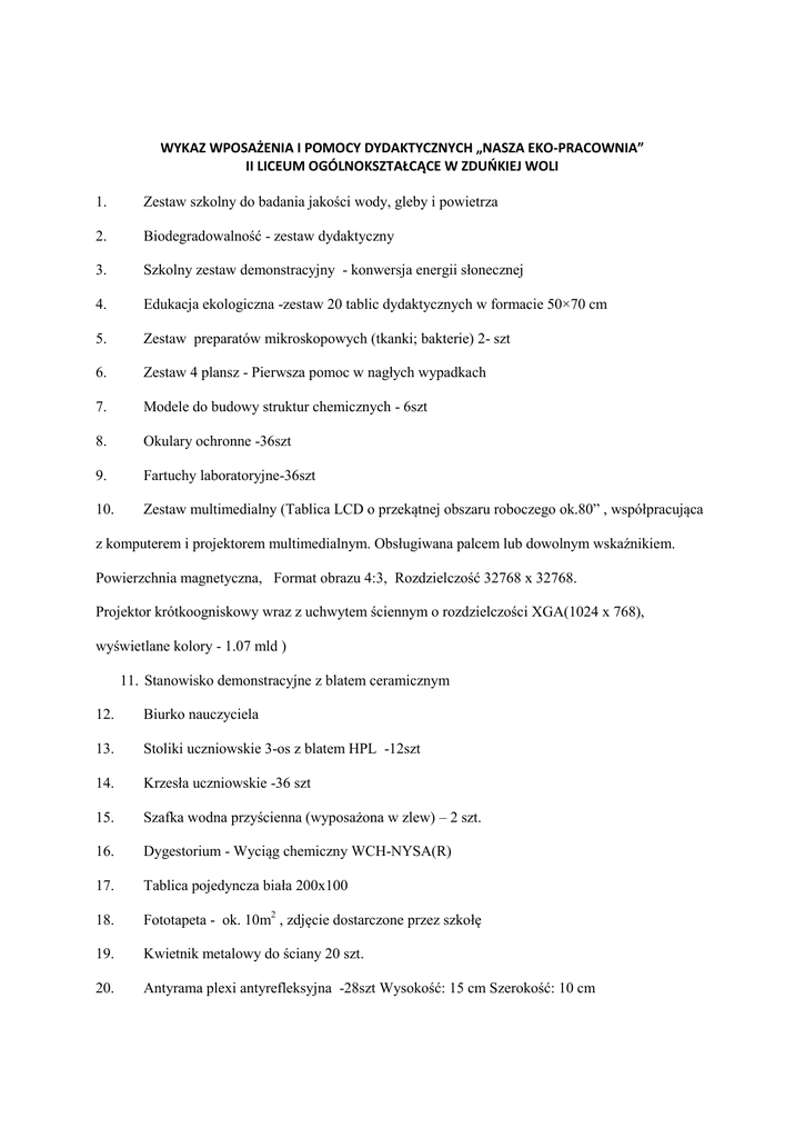 WYKAZ WPOSAŻENIA I POMOCY DYDAKTYCZNYCH „NASZA EKO-PRACOWNIA” II LICEUM OGÓLNOKSZTAŁCĄCE W ZDUŃKIEJ WOLI 1. Zestaw szkolny do badania jakości wody, gleby i powietrza 2. Biodegradowalność - zestaw dydaktyczny 3. Szkolny zestaw demonstracyjny - konwersja energii słonecznej 4. Edukacja ekologiczna -zestaw 20 tablic dydaktycznych w formacie 50×70 cm 5. Zestaw preparatów mikroskopowych (tkanki; bakterie) 2- szt 6. Zestaw 4 plansz - Pierwsza pomoc w nagłych wypadkach 7. Modele do budowy struktur chemicznych - 6szt 8. Okulary ochronne -36szt 9. Fartuchy laboratoryjne-36szt 10. Zestaw multimedialny (Tablica LCD o przekątnej obszaru roboczego ok.80” , współpracująca z komputerem i projektorem multimedialnym. Obsługiwana palcem lub dowolnym wskaźnikiem. Powierzchnia magnetyczna, Format obrazu 4:3, Rozdzielczość 32768 x 32768. Projektor krótkoogniskowy wraz z uchwytem ściennym o rozdzielczości ( 024 x 768 , wyświetlane kolory - 1.07 mld ) 11. Stanowisko demonstracyjne z blatem ceramicznym 12. Biurko nauczyciela 13. Stoliki uczniowskie 3-os z blatem HPL -12szt 14. Krzesła uczniowskie -36 szt 15. Szafka wodna przyścienna (wyposażona w zlew – 2 szt. 16. Dygestorium - Wyciąg chemiczny WCH-NYSA(R) 17. Tablica pojedyncza biała 200x 00 18. Fototapeta - ok. 10m2 , zdjęcie dostarczone przez szkołę 19. Kwietnik metalowy do ściany 20 szt. 20. Antyrama plexi antyrefleksyjna -28szt Wysokość: 5 cm Szerokość: 0 cm WYKAZ WPOSAŻENIA I POMOCY DYDAKTYCZNYCH „NASZA EKO-PRACOWNIA” II LICEUM OGÓLNOKSZTAŁCĄCE W ZDUŃKIEJ WOLI 21. Kwiaty : Kalatea różówokropkowana - 2szt Eszeweria - 2szt Grubosz szablasty - 2szt Zielistka Ocean - 2szt Portulacaria afra "Variegata" - 2szt Agawa lophabtha "Quadricolour" - 2szt Jęzorka brodawkowata - 2szt Ciemnotka okrągłolistna - 2szt Nephrolepis exaltata "Boston" - 2szt Tradescantia zebrina - 2szt Schefflera heptaphylla - 2szt Wężownica -8szt