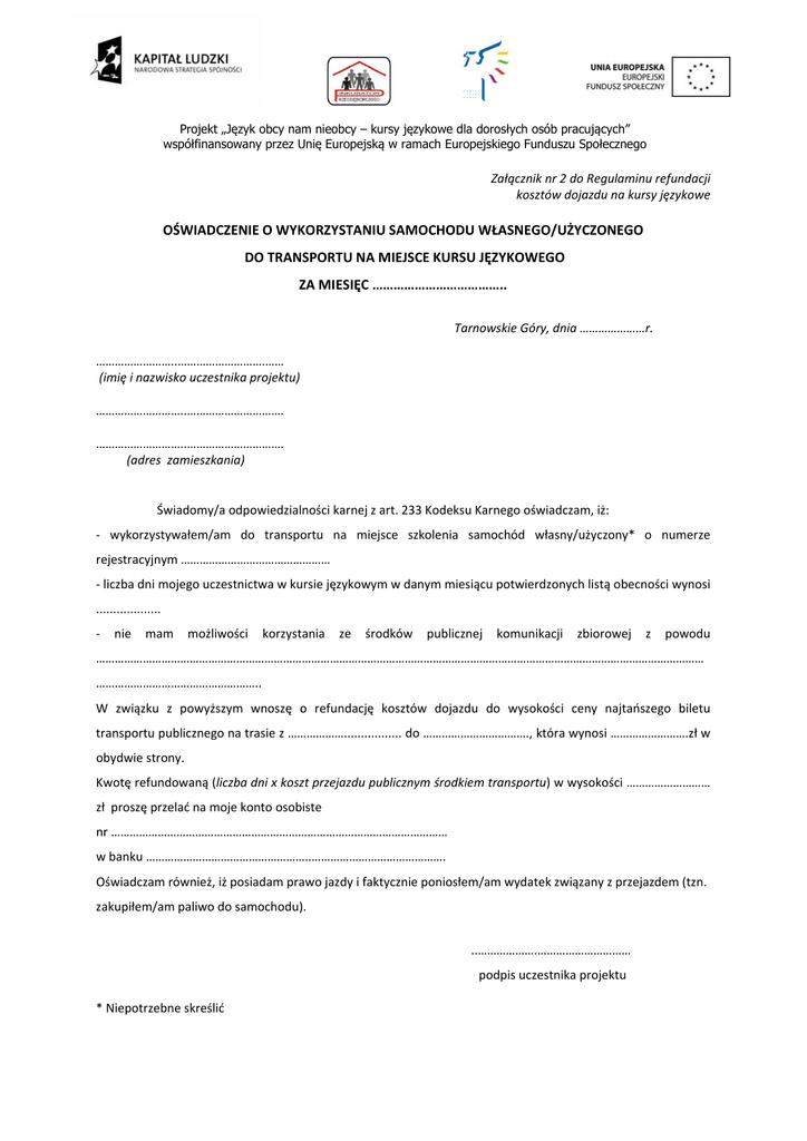 Projekt „Język obcy nam nieobcy – kursy językowe dla dorosłych osób pracujących” współfinansowany przez Unię Europejską w ramach Europejskiego Funduszu Społecznego Załącznik nr 2 do Regulaminu refundacji kosztów dojazdu na kursy językowe OŚWIADCZENIE O WYKORZYSTANIU SAMOCHODU WŁASNEGO/UŻYCZONEGO DO TRANSPORTU NA MIEJSCE KURSU JĘZYKOWEGO ZA MIESIĘC ……………………………….. Tarnowskie Góry, dnia …………………r. ……………………..……………………….…… (imię i nazwisko uczestnika projektu) ………………………..…………………………. ………………………..…………………………. (adres zamieszkania) Świadomy/a odpowiedzialności karnej z art. 233 Kodeksu Karnego oświadczam, iż: ‐ wykorzystywałem/am do transportu na miejsce szkolenia samochód własny/użyczony* o numerze rejestracyjnym ………………………………………… ‐ liczba dni mojego uczestnictwa w kursie językowym w danym miesiącu potwierdzonych listą obecności wynosi ................... ‐ nie mam możliwości korzystania ze środków publicznej komunikacji zbiorowej z powodu …………………………………………………………………………………………………………………………………………………………………………… …………………………………………….. W związku z powyższym wnoszę o refundację kosztów dojazdu do wysokości ceny najtańszego biletu transportu publicznego na trasie z ………………................. do ……………………………., która wynosi …………………….zł w obydwie strony. Kwotę refundowaną (liczba dni x koszt przejazdu publicznym środkiem transportu) w wysokości ……………………… zł proszę przelać na moje konto osobiste nr ……………………………………………………………………………………………… w banku ……………………………………………..……………………………………. Oświadczam również, iż posiadam prawo jazdy i faktycznie poniosłem/am wydatek związany z przejazdem (tzn. zakupiłem/am paliwo do samochodu). ..……………….………………………… podpis uczestnika projektu * Niepotrzebne skreślić