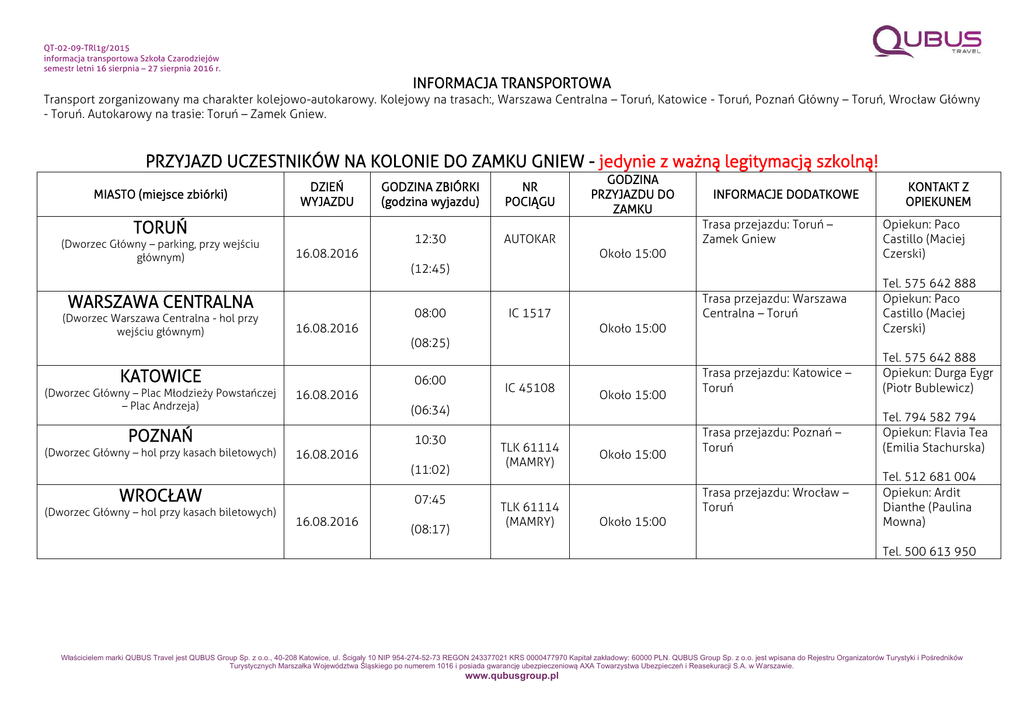 QT-02-09-TRl1g/2015 informacja transportowa Szkoła Czarodziejów semestr letni 16 sierpnia – 27 sierpnia 2016 r. INFORMACJA TRANSPORTOWA Transport zorganizowany ma charakter kolejowo-autokarowy. Kolejowy na trasach:, Warszawa Centralna – Toruń, Katowice - Toruń, Poznań Główny – Toruń, Wrocław Główny - Toruń. Autokarowy na trasie: Toruń – Zamek Gniew. PRZYJAZD UCZESTNIKÓW NA KOLONIE DO ZAMKU GNIEW - jedynie z ważną legitymacją szkolną! MIASTO (miejsce zbiórki) DZIEŃ WYJAZDU TORUŃ (Dworzec Główny – parking, przy wejściu głównym) AUTOKAR 08:00 Trasa przejazdu: Toruń – Zamek Gniew KONTAKT Z OPIEKUNEM Opiekun: Paco Castillo (Maciej Czerski) Trasa przejazdu: Warszawa Centralna – Toruń IC 1517 Około 15:00 Tel. 575 642 888 Opiekun: Paco Castillo (Maciej Czerski) (08:25) 06:00 16.08.2016 IC 45108 Około 15:00 Trasa przejazdu: Katowice – Toruń Tel. 575 642 888 Opiekun: Durga Eygr (Piotr Bublewicz) Trasa przejazdu: Poznań – Toruń Tel. 794 582 794 Opiekun: Flavia Tea (Emilia Stachurska) (06:34) 10:30 16.08.2016 (11:02) WROCŁAW (Dworzec Główny – hol przy kasach biletowych) INFORMACJE DODATKOWE Około 15:00 16.08.2016 POZNAŃ (Dworzec Główny – hol przy kasach biletowych) 12:30 GODZINA PRZYJAZDU DO ZAMKU (12:45) KATOWICE (Dworzec Główny – Plac Młodzieży Powstańczej – Plac Andrzeja) NR POCIĄGU 16.08.2016 WARSZAWA CENTRALNA (Dworzec Warszawa Centralna - hol przy wejściu głównym) GODZINA ZBIÓRKI (godzina wyjazdu) 07:45 16.08.2016 (08:17) TLK 61114 (MAMRY) TLK 61114 (MAMRY) Około 15:00 Trasa przejazdu: Wrocław – Toruń Około 15:00 Tel. 512 681 004 Opiekun: Ardit Dianthe (Paulina Mowna) Tel. 500 613 950 Właścicielem marki QUBUS Travel jest QUBUS Group Sp. z o.o., 40-208 Katowice, ul. Ścigały 10 NIP 954-274-52-73 REGON 243377021 KRS 0000477970 Kapitał zakładowy: 60000 PLN. QUBUS Group Sp. z o.o. jest wpisana do Rejestru Organizatorów Turystyki i Pośredników Turystycznych Marszałka Województwa Śląskiego po numerem 1016 i posiada gwarancję ubezpieczeniową AXA Towarzystwa Ubezpieczeń i Reasekuracji S.A. w Warszawie. www.qubusgroup.pl QT-02-09-TRl1g/2015 informacja transportowa Szkoła Czarodziejów semestr letni 16 sierpnia – 27 sierpnia 2016 r. INFORMACJA TRANSPORTOWA Transport zorganizowany ma charakter kolejowo-autokarowy. Kolejowy na trasach: Toruń – Warszawa Centralna, Toruń – Katowice, Toruń – Poznań Główny, Toruń – Wrocław Główny. Autokarowy na trasie: Zamek Gniew – Toruń. POWRÓT UCZESTNIKÓW Z KOLONII - jedynie z ważną legitymacją szkolną! MIASTO DOCELOWE (odbiór uczestnika) DZIEŃ POWROTU GODZINA PRZYJAZDU (odbiór uczestnika) NR POCIĄGU GODZINA WYJAZDU Z ZAMKU Trasa przejazdu: Zamek Gniew – Toruń 27.08.2016 12:30 Autokar 10:00 Trasa przejazdu: Toruń – Warszawa Centralna 10:00 Tel. 794 582 794 Opiekun: Paco Castillo (Maciej Czerski) Trasa przejazdu: Toruń – Katowice Tel. 575 642 888 Opiekun: Durga Eygr (Piotr Bublewicz) WARSZAWA CENTRALNA (Dworzec Warszawa Centralna - hol przy wejściu głównym) 27.08.2016 17:30 TLK 53106 KATOWICE (Dworzec Główny - przy wejściu od Placu Andrzeja; Plac Młodzieży Powstańczej) 27.08.2016 22:24 IC 54108 10:00 POZNAŃ (Dworzec Główny – hol przy kasach biletowych) 27.08.2016 17:20 TLK 16115 10:00 Trasa przejazdu: Toruń – Poznań Główny Trasa przejazdu: Toruń – Wrocław Główny WROCŁAW (Dworzec Główny – hol przy kasach biletowych) 27.08.2016 20:20 TLK 16115 KONTAKT Z OPIEKUNEM Opiekun: Durga Eygr (Piotr Bublewicz) TORUŃ (Dworzec Główny – parking, przy wejściu głównym) INFORMACJE DODATKOWE 10:00 Tel. 794 582 794 Opiekun: Lorraine Faith (Loretta Fabiś) Tel: 667 519 000 Opiekun: Ardit Dianthe (Paulina Mowna) Tel. 500 613 950 Właścicielem marki QUBUS Travel jest QUBUS Group Sp. z o.o., 40-208 Katowice, ul. Ścigały 10 NIP 954-274-52-73 REGON 243377021 KRS 0000477970 Kapitał zakładowy: 60000 PLN. QUBUS Group Sp. z o.o. jest wpisana do Rejestru Organizatorów Turystyki i Pośredników Turystycznych Marszałka Województwa Śląskiego po numerem 1016 i posiada gwarancję ubezpieczeniową AXA Towarzystwa Ubezpieczeń i Reasekuracji S.A. w Warszawie. www.qubusgroup.pl QT-02-09-TRl1g/2015 informacja transportowa Szkoła Czarodziejów semestr letni 16 sierpnia – 27 sierpnia 2016 r. INFORMACJA TRANSPORTOWA dla transportu własnego Rodzica PRZYWÓZ UCZESTNIKA NA KOLONIE DO ZAMKU 16.08.2016 od godziny 13:00 do godziny 14:00 ODBIÓR UCZESTNIKA Z KOLONII 27.08.2016 od godziny 08:30 do godziny 09:30 INFORMACJE OGÓLNE 1. Turnus rozpoczyna się obiadem 16.08.2016 r. około godziny 16:00, a kończy śniadaniem 27.08.2016 r. o godzinie 08:00. 2. Kierownikiem turnusu jest Wojciech Kułaga, nr kontaktowy 660 548 968. 3. Wychowawcami w czasie wypoczynku są: Durga Eygr (Piotr Bublewicz), Lorraine Faith (Loretta Fabiś), Flavia Tea (Emilia Stachurska), Ardit Dianthe (Paulina Mowna), Paco Castillo (Maciej Czerski), Renata Wójcik. 4. We wszelkich sprawach dot. organizacji kolonii, uczestników, zakwaterowania itp. można kontaktować się wyłącznie z kierownikiem wypoczynku, najlepiej w godzinach: 09:30 - 10:30; 13:30 - 15:00; 18:45 - 19:30. 5. Uczestnicy korzystający z transportu organizatora mają obowiązek posiadania ważnej legitymacji szkolnej. 6. Prosimy o punktualne przybycie na miejsce zbiórki w czasie transportu na kolonie w dniu 16.08.2016 r. oraz o punktualne przybycie na miejsce odebrania uczestnika w dniu 27.08.2016 r. 7. Telefony do opiekunów transportu oraz kierownika turnusu, zawarte w poniższej informacji, są aktywne od 15 sierpnia 2016 r. 8. Odpowiedzi na nurtujące Państwa pytania, prosimy odnaleźć w strefie dla rodzica na stronie www.queverton.pl lub dzwonić do biura obsługi 728 66 33 23 (pn. - pt. w godzinach 09:00 - 16:30). Właścicielem marki QUBUS Travel jest QUBUS Group Sp. z o.o., 40-208 Katowice, ul. Ścigały 10 NIP 954-274-52-73 REGON 243377021 KRS 0000477970 Kapitał zakładowy: 60000 PL