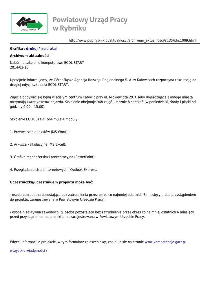 http://www.pup-rybnik.pl/aktualnosci/archiwum_aktualnosci/st:35/idn:1009.html Grafika : drukuj / nie drukuj Archiwum aktualności Nabór na szkolenie komputerowe ECDL START 2014-03-10 Uprzejmie informujemy, że Górnośląska Agencja Rozwoju Regionalnego S. A. w Katowicach rozpoczyna rekrutację do drugiej edycji szkolenia ECDL START. Zajęcia odbywać się będą w ścisłym centrum Katowic przy ul. Mickiewicza 29. Osoby dojeżdżające z innego miasta otrzymają zwrot kosztów dojazdu. Szkolenie obejmuje 96h zajęć – łącznie 8 spotkań (w poniedziałki, środy i piątki od godziny 9.00 – 15.00). Szkolenie ECDL START obejmuje 4 moduły: 1. Przetwarzanie tekstów (MS Word); 2. Arkusze kalkulacyjne (MS Excel); 3. Grafika menadżerska i prezentacyjna (PowerPoint); 4. Przeglądanie stron internetowych i Outlook Express. Uczestniczką/uczestnikiem projektu może być: - osoba bezrobotna pozostająca bez zatrudnienia przez okres co najmniej ostatnich 6 miesięcy przed przystąpieniem do projektu, zarejestrowana w Powiatowym Urzędzie Pracy; - osoba nieaktywna zawodowo, tj. osoba pozostająca bez zatrudnienia przez okres co najmniej ostatnich 6 miesięcy przed przystąpieniem do projektu, niezarejestrowana w Powiatowym Urzędzie Pracy. Więcej informacji o projekcie, w tym formularz zgłoszeniowy, znajduje się na stronie www.kompetencje.garr.pl wszystkie wiadomości ›
