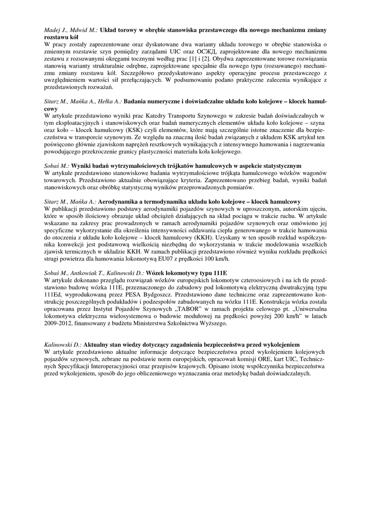 Madej J., Mdwid M.: Układ torowy w obrębie stanowiska przestawczego dla nowego mechanizmu zmiany rozstawu kół W pracy zostały zaprezentowane oraz dyskutowane dwa warianty układu torowego w obrębie stanowiska o zmiennym rozstawie szyn pomiędzy zarządami UIC oraz OCЖД, zaprojektowane dla nowego mechanizmu zestawu z rozsuwanymi okręgami tocznymi według prac [1] i [2]. Obydwa zaprezentowane torowe rozwiązania stanowią warianty strukturalnie odrębne, zaprojektowane specjalnie dla nowego typu (rozsuwanego) mechanizmu zmiany rozstawu kół. Szczegółowo przedyskutowano aspekty operacyjne procesu przestawczego z uwzględnieniem wartości sił przełączających. W podsumowaniu podano praktyczne zalecenia wynikające z przedstawionych rozważań. Sitarz M., Mańka A., Hełka A.: Badania numeryczne i doświadczalne układu koło kolejowe – klocek hamulcowy W artykule przedstawiono wyniki prac Katedry Transportu Szynowego w zakresie badań doświadczalnych w tym eksploatacyjnych i stanowiskowych oraz badań numerycznych elementów układu koło kolejowe – szyna oraz koło – klocek hamulcowy (KSK) czyli elementów, które mają szczególnie istotne znaczenie dla bezpieczeństwa w transporcie szynowym. Ze względu na znaczną ilość badań związanych z układem KSK artykuł ten poświęcono głównie zjawiskom naprężeń resztkowych wynikających z intensywnego hamowania i nagrzewania powodującego przekroczenie granicy plastyczności materiału koła kolejowego. Sobaś M.: Wyniki badań wytrzymałościowych trójkatów hamulcowych w aspekcie statystycznym W artykule przedstawiono stanowiskowe badania wytrzymałościowe trójkąta hamulcowego wózków wagonów towarowych. Przedstawiono aktualnie obowiązujące kryteria. Zaprezentowano przebieg badań, wyniki badań stanowiskowych oraz obróbkę statystyczną wyników przeprowadzonych pomiarów. Sitarz M., Mańka A.: Aerodynamika a termodynamika układu koło kolejowe – klocek hamulcowy W publikacji przedstawiono podstawy aerodynamiki pojazdów szynowych w uproszczonym, autorskim ujęciu, które w sposób ilościowy obrazuje układ obciążeń działających na skład pociągu w trakcie ruchu. W artykule wskazano na zakresy prac prowadzonych w ramach aerodynamiki pojazdów szynowych oraz omówiono jej specyficzne wykorzystanie dla określenia intensywności oddawania ciepła generowanego w trakcie hamowania do otoczenia z układu koło kolejowe – klocek hamulcowy (KKH). Uzyskany w ten sposób rozkład współczynnika konwekcji jest podstawową wielkością niezbędną do wykorzystania w trakcie modelowania wszelkich zjawisk termicznych w układzie KKH. W ramach publikacji przedstawiono również wyniku rozkładu prędkości strugi powietrza dla hamowania lokomotywą EU07 z prędkości 100 km/h. Sobaś M., Antkowiak T., Kalinowski D.: Wózek lokomotywy typu 111E W artykule dokonano przeglądu rozwiązań wózków europejskich lokomotyw czteroosiowych i na ich tle przedstawiono budowę wózka 111E, przeznaczonego do zabudowy pod lokomotywą elektryczną dwutrakcyjną typu 111Ed, wyprodukowaną przez PESA Bydgoszcz. Przedstawiono dane techniczne oraz zaprezentowano konstrukcję poszczególnych podukładów i podzespołów zabudowanych na wózku 111E. Konstrukcja wózka została opracowana przez Instytut Pojazdów Szynowych „TABOR” w ramach projektu celowego pt. „Uniwersalna lokomotywa elektryczna wielosystemowa o budowie modułowej na prędkości powyżej 200 km/h” w latach 2009-2012, finansowany z budżetu Ministerstwa Szkolnictwa Wyższego. Kalinowski D.: Aktualny stan wiedzy dotyczący zagadnienia bezpieczeństwa przed wykolejeniem W artykule przedstawiono aktualne informacje dotyczące bezpieczeństwa przed wykolejeniem kolejowych pojazdów szynowych, zebrane na podstawie norm europejskich, opracowań komisji ORE, kart UIC, Technicznych Specyfikacji Interoperacyjności oraz przepisów krajowych. Opisano istotę współczynnika bezpieczeństwa przed wykolejeniem, sposób do jego obliczeniowego wyznaczania oraz metodykę badań doświadczalnych.