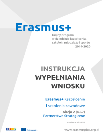 INSTRUKCJA WYPEŁNIANIA WNIOSKU Erasmus+ Kształcenie i szkolenia zawodowe Akcja 2 (KA2) Partnerstwa Strategiczne aktualizacja: 3/01/2017 Instrukcja wypełniania wniosku o Partnerstwa Strategiczne (KA2) w kształceniu i szkoleniu zawodowym - Erasmus+ Spis treści Uwagi ogólne..................................................................................................................................................................... 3 B. Informacja o projekcie (Context)................................................................................................................................... 3 B.1. Dane identyfikacyjne projektu (Project Identification) ..................................................................................... 4 B.2. Narodowa Agencja instytucji wnioskującej (National Agency of the Applicant Institution) ............................ 4 C. Priorytety (Priorities) ..................................................................................................................................................... 5 D. Organizacje uczestniczące w projekcie (Participating organisation(s))........................................................................ 8 D.1. Organizacja wnioskująca (Applicant Organisation)........................................................................................... 8 D.1.1 Profil Organizacji (Profile) ................................................................................................................................ 8 D.1.2 Cele, działania i doświadczenie instytucji (Background and Experience) ........................................................ 8 D.1.3 Przedstawiciel prawny (Legal Representative) ................................................................................................ 8 D.1.4 Osoba kontaktowa (Contact person) ............................................................................................................... 8 D.2. Organizacja partnerska (Partner Organisation) ................................................................................................. 9 E. Opis projektu (Description of the Project) ......................................................................................................... 9 G. Zarządzanie projektem i jego wdrażanie (Project Management and Implementation) .................................... 9 G.1. Rezultaty pracy intelektualnej (Intellectual Outputs) .......................................................................................... 10 G.2. Wydarzenia upowszechniające rezultaty pracy intelektualnej (Multiplier Events) ............................................. 11 G.3 (lub G.1 jeśli projekt bez RPI/IO) Działania związane z uczeniem się/nauczaniem/szkoleniami (Learning/Teaching/Training Activities)...................................................................................................................... 11 I. Budżet (Budget) ............................................................................................................................................... 13 I. 1. Zarządzanie projektem i jego wdrażanie (Project Management and Implementation) ................................. 13 I. 2. Międzynarodowe spotkania projektowe (Transnational Project Meetings) .................................................. 13 I. 3. Rezultaty pracy intelektualnej (Intellectual Outputs) ..................................................................................... 14 I. 4. Wydarzenia upowszechniające rezultaty pracy intelektualnej (Multiplier events) ............................................. 14 I.5. (lub I.3.) Działania związane z uczeniem się/nauczaniem/szkoleniami (Learning/Teaching/Training Activities) 15 I.5.1. (lub I.3.1) Podróż (Travel) ............................................................................................................................... 15 I.5.2. (lub I.3.2) Wsparcie indywidualne (Individual support) ................................................................................. 15 I.5.3. (lub I.3.3)Wsparcie językowe (Linguistic Support) ......................................................................................... 15 I.5.4. (lub I.3.4) Koszty nadzwyczajne (wysokie koszty podróży uczestników z najbardziej oddalonych regionów oraz krajów i terytoriów zamorskich) (Exceptional Costs (Overseas Countries and Territories Travel Costs) ........ 15 I. 6. (lub I.4) Wsparcie związane ze specjalnymi potrzebami (Special Needs) ............................................................ 15 I. 7.(lub I.5) Koszty nadzwyczajne (Exceptional costs)................................................................................................. 16 J. Streszczenie projektu (Project summary) ........................................................................................................ 16 J.1 Zestawienie uczestniczących organizacji (Summary of participating organisations), ........................................... 16 2 Instrukcja wypełniania wniosku o Partnerstwa Strategiczne (KA2) w kształceniu i szkoleniu zawodowym - Erasmus+ J.2 Podsumowanie budżetu (Budget Summary) ......................................................................................................... 16 K. Lista kontrolna (Checklist), M. Oświadczenie (Declaration of Honour)....................................................................... 16 N. Załączniki (Annexes) .................................................................................................................................................... 17 O. Złożenie wniosku (Submission) ................................................................................................................................... 17 Uwagi ogólne Przed rozpoczęciem wypełniania wniosku należy go zapisać na swoim komputerze i dopiero wówczas rozpocząć jego wypełnianie. Nie ma możliwości otwarcia i wypełnienia