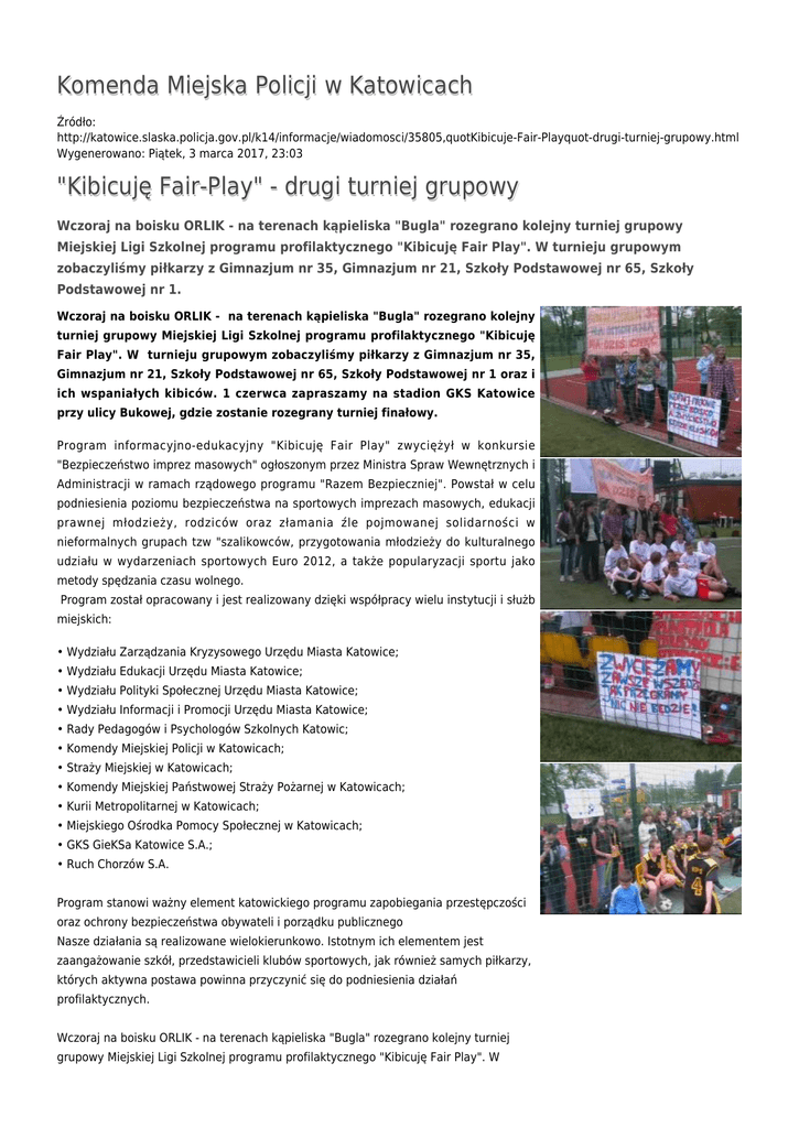 Komenda Miejska Policji w Katowicach Źródło: http://katowice.slaska.policja.gov.pl/k14/informacje/wiadomosci/35805,quotKibicuje-Fair-Playquot-drugi-turniej-grupowy.html Wygenerowano: Piątek, 3 marca 2017, 23:03 "Kibicuję Fair-Play" - drugi turniej grupowy Wczoraj na boisku ORLIK - na terenach kąpieliska "Bugla" rozegrano kolejny turniej grupowy Miejskiej Ligi Szkolnej programu profilaktycznego "Kibicuję Fair Play". W turnieju grupowym zobaczyliśmy piłkarzy z Gimnazjum nr 35, Gimnazjum nr 21, Szkoły Podstawowej nr 65, Szkoły Podstawowej nr 1. Wczoraj na boisku ORLIK - na terenach kąpieliska "Bugla" rozegrano kolejny turniej grupowy Miejskiej Ligi Szkolnej programu profilaktycznego "Kibicuję Fair Play". W turnieju grupowym zobaczyliśmy piłkarzy z Gimnazjum nr 35, Gimnazjum nr 21, Szkoły Podstawowej nr 65, Szkoły Podstawowej nr 1 oraz i ich wspaniałych kibiców. 1 czerwca zapraszamy na stadion GKS Katowice przy ulicy Bukowej, gdzie zostanie rozegrany turniej finałowy. Program informacyjno-edukacyjny "Kibicuję Fair Play" zwyciężył w konkursie "Bezpieczeństwo imprez masowych" ogłoszonym przez Ministra Spraw Wewnętrznych i Administracji w ramach rządowego programu "Razem Bezpieczniej". Powstał w celu podniesienia poziomu bezpieczeństwa na sportowych imprezach masowych, edukacji prawnej młodzieży, rodziców oraz złamania źle pojmowanej solidarności w nieformalnych grupach tzw "szalikowców, przygotowania młodzieży do kulturalnego udziału w wydarzeniach sportowych Euro 2012, a także popularyzacji sportu jako metody spędzania czasu wolnego. Program został opracowany i jest realizowany dzięki współpracy wielu instytucji i służb miejskich: • Wydziału Zarządzania Kryzysowego Urzędu Miasta Katowice; • Wydziału Edukacji Urzędu Miasta Katowice; • Wydziału Polityki Społecznej Urzędu Miasta Katowice; • Wydziału Informacji i Promocji Urzędu Miasta Katowice; • Rady Pedagogów i Psychologów Szkolnych Katowic; • Komendy Miejskiej Policji w Katowicach; • Straży Miejskiej w Katowicach; • Komendy Miejskiej Państwowej Straży Pożarnej w Katowicach; • Kurii Metropolitarnej w Katowicach; • Miejskiego Ośrodka Pomocy Społecznej w Katowicach; • GKS GieKSa Katowice S.A.; • Ruch Chorzów S.A. Program stanowi ważny element katowickiego programu zapobiegania przestępczości oraz ochrony bezpieczeństwa obywateli i porządku publicznego Nasze działania są realizowane wielokierunkowo. Istotnym ich elementem jest zaangażowanie szkół, przedstawicieli klubów sportowych, jak również samych piłkarzy, których aktywna postawa powinna przyczynić się do podniesienia działań profilaktycznych. Wczoraj na boisku ORLIK - na terenach kąpieliska "Bugla" rozegrano kolejny turniej grupowy Miejskiej Ligi Szkolnej programu profilaktycznego "Kibicuję Fair Play". W turnieju grupowym zobaczyliśmy piłkarzy z Gimnazjum nr 35, Gimnazjum nr 21, Szkoły Podstawowej nr 65, Szkoły Podstawowej nr 1 oraz ich wspaniałych kibiców. W turnieju piłakarskim zwyciężyła drużyna Gimnazjum nr 35. Najlepszymi kibicami okazali się uczniowie ze Szkoły Podstawowej nr 65. 1 czerwca zapraszamy na stadion GKS Katowice przy ulicy Bukowej, gdzie zostanie rozegrany turniej finałowy. Zainstaluj wtyczkę Flash, aby zobaczyć odtwarzacz. pobierz film - 4.59 MB Ocena: 0/5 (0) Tweetnij