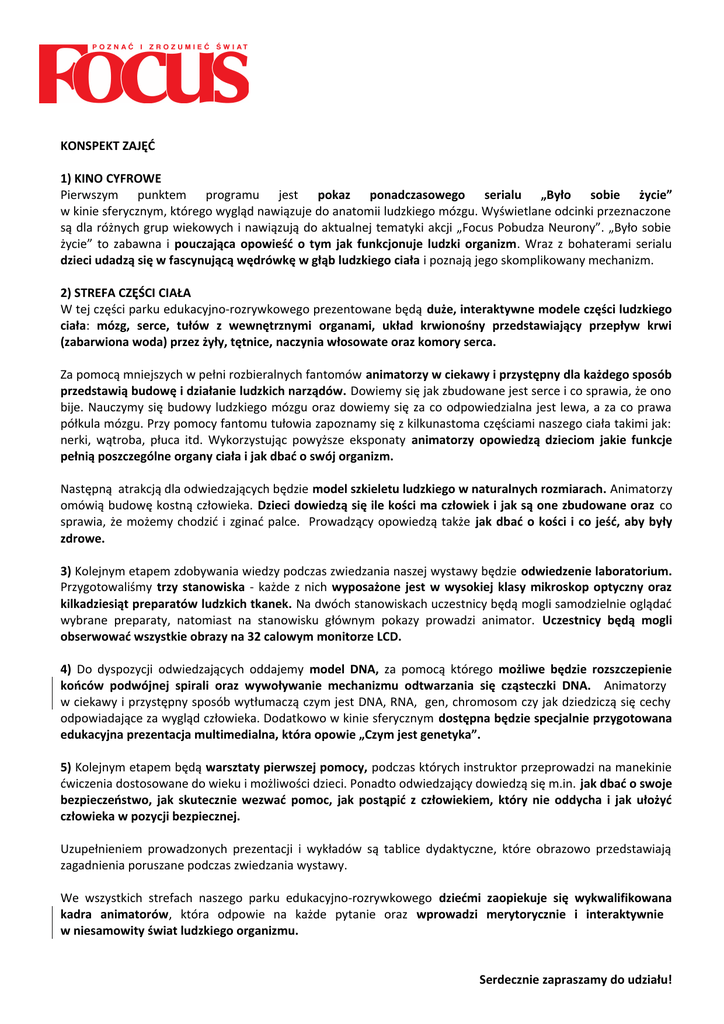 KONSPEKT ZAJĘĆ 1) KINO CYFROWE Pierwszym punktem programu jest pokaz ponadczasowego serialu „Było sobie życie” w kinie sferycznym, którego wygląd nawiązuje do anatomii ludzkiego mózgu. Wyświetlane odcinki przeznaczone są dla różnych grup wiekowych i nawiązują do aktualnej tematyki akcji „Focus Pobudza Neurony”. „Było sobie życie” to zabawna i pouczająca opowieść o tym jak funkcjonuje ludzki organizm. Wraz z bohaterami serialu dzieci udadzą się w fascynującą wędrówkę w głąb ludzkiego ciała i poznają jego skomplikowany mechanizm. 2) STREFA CZĘŚCI CIAŁA W tej części parku edukacyjno-rozrywkowego prezentowane będą duże, interaktywne modele części ludzkiego ciała: mózg, serce, tułów z wewnętrznymi organami, układ krwionośny przedstawiający przepływ krwi (zabarwiona woda) przez żyły, tętnice, naczynia włosowate oraz komory serca. Za pomocą mniejszych w pełni rozbieralnych fantomów animatorzy w ciekawy i przystępny dla każdego sposób przedstawią budowę i działanie ludzkich narządów. Dowiemy się jak zbudowane jest serce i co sprawia, że ono bije. Nauczymy się budowy ludzkiego mózgu oraz dowiemy się za co odpowiedzialna jest lewa, a za co prawa półkula mózgu. Przy pomocy fantomu tułowia zapoznamy się z kilkunastoma częściami naszego ciała takimi jak: nerki, wątroba, płuca itd. Wykorzystując powyższe eksponaty animatorzy opowiedzą dzieciom jakie funkcje pełnią poszczególne organy ciała i jak dbać o swój organizm. Następną atrakcją dla odwiedzających będzie model szkieletu ludzkiego w naturalnych rozmiarach. Animatorzy omówią budowę kostną człowieka. Dzieci dowiedzą się ile kości ma człowiek i jak są one zbudowane oraz co sprawia, że możemy chodzić i zginać palce. Prowadzący opowiedzą także jak dbać o kości i co jeść, aby były zdrowe. 3) Kolejnym etapem zdobywania wiedzy podczas zwiedzania naszej wystawy będzie odwiedzenie laboratorium. Przygotowaliśmy trzy stanowiska - każde z nich wyposażone jest w wysokiej klasy mikroskop optyczny oraz kilkadziesiąt preparatów ludzkich tkanek. Na dwóch stanowiskach uczestnicy będą mogli samodzielnie oglądać wybrane preparaty, natomiast na stanowisku głównym pokazy prowadzi animator. Uczestnicy będą mogli obserwować wszystkie obrazy na 32 calowym monitorze LCD. 4) Do dyspozycji odwiedzających oddajemy model DNA, za pomocą którego możliwe będzie rozszczepienie końców podwójnej spirali oraz wywoływanie mechanizmu odtwarzania się cząsteczki DNA. Animatorzy w ciekawy i przystępny sposób wytłumaczą czym jest DNA, RNA, gen, chromosom czy jak dziedziczą się cechy odpowiadające za wygląd człowieka. Dodatkowo w kinie sferycznym dostępna będzie specjalnie przygotowana edukacyjna prezentacja multimedialna, która opowie „Czym jest genetyka”. 5) Kolejnym etapem będą warsztaty pierwszej pomocy, podczas których instruktor przeprowadzi na manekinie ćwiczenia dostosowane do wieku i możliwości dzieci. Ponadto odwiedzający dowiedzą się m.in. jak dbać o swoje bezpieczeństwo, jak skutecznie wezwać pomoc, jak postąpić z człowiekiem, który nie oddycha i jak ułożyć człowieka w pozycji bezpiecznej. Uzupełnieniem prowadzonych prezentacji i wykładów są tablice dydaktyczne, które obrazowo przedstawiają zagadnienia poruszane podczas zwiedzania wystawy. We wszystkich strefach naszego parku edukacyjno-rozrywkowego dziećmi zaopiekuje się wykwalifikowana kadra animatorów, która odpowie na każde pytanie oraz wprowadzi merytorycznie i interaktywnie w niesamowity świat ludzkiego organizmu. Serdecznie zapraszamy do udziału!
