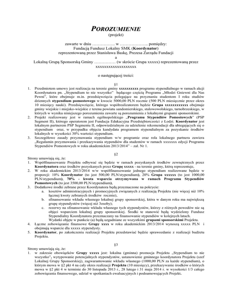 POROZUMIENIE (projekt) zawarte w dniu ……………. w ……………….. pomiędzy: Fundacją Fundusz Lokalny SMK (Koordynator) reprezentowaną przez Stanisława Baskę, Prezesa Zarządu Fundacji a Lokalną Grupą Sponsorską Gminy …………… (w skrócie Grupa xxxxx) reprezentowaną przez xxxxxxxxxxxxxxxxxxx o następującej treści: 1. 2. 3. §1 Przedmiotem umowy jest realizacja na terenie gminy xxxxxxxxxx programu stypendialnego w ramach akcji Koordynatora pn. „Stypendium to nie wszystko” będącego częścią Programu „Młodzi Gniewni dla Nas Pewni”, które obejmuje m.in. przedsięwzięcia polegające na przyznaniu studentom I roku studiów dziennych stypendium pomostowego w kwocie 5000,00 PLN rocznie (500 PLN miesięcznie przez okres 10 miesięcy nauki). Przedsięwzięcie, którego współrealizatorem będzie Grupa xxxxxxxxxxxx obejmuje gminy wiejskie i miejsko-wiejskie z terenu powiatu sandomierskiego, stalowowolskiego, tarnobrzeskiego, w których w wyniku niniejszego porozumienia zawarte są porozumienia z lokalnymi grupami sponsorskimi. Projekt realizowany jest w ramach ogólnopolskiego „Programu Stypendiów Pomostowych” (PSP Segment II), którego operatorem jest Fundacja Edukacyjna Przedsiębiorczości z Łodzi. Koordynator jest lokalnym partnerem PSP Segmentu II, odpowiedzialnym za udzielenie rekomendacji dla ubiegających się o stypendium oraz, w przypadku objęcia kandydata programem stypendialnym za pozyskanie środków lokalnych w wysokości 30% wartości stypendium. Szczegółowe zasady przyznawania stypendium w/w programie oraz rola lokalnego partnera zawiera „Regulamin przyznawania i przekazywania stypendiów dla studentów w ramach xxxxxxx edycji Programu Stypendiów Pomostowych w roku akademickim 2013/2014” – zał. Nr 1. §2 Strony umawiają się, że: 1. Współfinansowanie Projektu odbywać się będzie w ramach pozyskanych środków zewnętrznych przez Koordynatora oraz środków pozyskanych przez Grupę xxxxx - na terenie gminy, którą reprezentuje, 2. W roku akademickim 2013/2014 w/w współfinansowanie jednego stypendium realizowane będzie w proporcji: 10% Koordynator (to jest 500,00 PLN/stypendium), 20% Grupa xxxxxx (to jest 1000,00 PLN/stypendium), 70% - kwota wsparcia otrzymywana w ramach Programu Stypendiów Pomostowych (to jest 3500,00 PLN/stypendium), 3. Dodatkowe środki zebrane przez Koordynatora będą przeznaczone na pokrycie: a. kosztów administracyjnych i promocyjnych związanych z realizacją Projektu (nie więcej niż 10% łącznej kwoty zebranych środków rocznie), b. sfinansowanie wkładu własnego lokalnej grupy sponsorskiej, która w danym roku ma największą grupę stypendystów (więcej niż 3osoby); c. rezerwy na sfinansowanie wkładu własnego tych stypendystów, którzy z różnych powodów nie są objęci wsparciem lokalnej grupy sponsorskiej. Środki te stanowić będą wydzielony Fundusz Stypendialny Koordynatora przeznaczany na finansowanie stypendiów w kolejnych latach. Wydatki objęte w punkcie (a) będą uzgadniane ze wszystkimi grupami sponsorskimi Projektu. 4. Łączne zobowiązanie finansowe Grupy xxxx w roku akademickim 2013/2014 wynoszą xxxxx PLN i obejmują wsparcie dla xxxxx stypendysty. 5. Koordynator, po zakończeniu realizacji Projektu przedstawiać będzie sprawozdanie z realizacji budżetu Projektu. §3 Strony umawiają się, że: 1. w zakresie obowiązków Grupy xxxxx jest: lokalna (gminna) promocja Projektu „Stypendium to nie wszystko”, wytypowanie potencjalnych stypendystów, ustanowienie gminnego koordynatora Projektu (szef Lokalnej Grupy Sponsorskiej), zagwarantowanie wkładu własnego (1000,00 PLN za każde stypendium), o którym mowa w §2 pkt 4 na cały okres realizacji Projektu (10 miesięcy), przekazywanie środków o których mowa w §2 pkt 4 w terminie do 30 listopada 2013 r., 28 lutego i 31 maja 2014 r. w wysokości 1/3 całego zobowiązania finansowego, udział w spotkaniach ewaluacyjnych i podsumowujących Projekt. 2. 3. 4. 1. 2. 3. 4. 5. w zakresie obowiązków Koordynatora jest: zarządzanie Projektem, a w szczególności: zabieganie o pozyskiwanie środków zewnętrznych na wdrożenie Projektu, ustanowienie koordynatora Projektu, promocja i reprezentowanie Projektu oraz Darczyńców, udzielenie rekomendacji ubiegającym się o stypendium kandydatom w oparciu o formularz wniosku o rekomendację (Zał. Nr 3), przeprowadzenie oceny wniosków i wybór stypendystów spełniających najlepiej warunki Projektu, prowadzenie spotkań, współpraca z zewnętrznymi instytucjami, które współfinansują Projektu szczególnie z Fundacją Edukacyjną Przedsiębiorczości, krajowego operatora „Programu Stypendiów Pomostowych” i inne zadania niezbędne do należytej realizacji Projektu. Koordynator Projektu zastrzega sobie, w przypadku nie wywiązywania się Grupy xxxxx z systematycznych wpłat wkładu własnego, prawo wystąpienia do Fundacji Edukacyjnej Przedsiębiorczości o wstrzymanie wypłat stypendiów z obszaru działania Grupy xxxx i/lub rozwiązania z trybem natychmiastowym niniejszego Porozumienia. Ewentualne skutki zaistniałej sytuacji obciążają Grupę xxxx Ramowy harmonogram współpracy zawiera Załącznik nr 2 do niniejszego Porozumienia. §4 Zmiana postanowień niniejszego Porozumienia wymaga zachowania formy pisemnego aneksu. W przypadku zmiany zasad finansowania Programu Stypendiów Pomostowych przez FEP Łódź strony zobowiązują się dokonać zmian Porozumienia. Koordynator Projektu opracowuje stosowny aneks do niniejszego Porozumienia. Grupy sponsorskie mogą współpracować w oparciu o zasady przedstawione w załączniku nr 4, W sprawach spornych w zakresie interpretacji np. zasad Projektu punktem odniesienia będą regulacje i doświadczenia wynikające z realizacji Programu Stypendiów Pomostowych prowadzonego przez Polsko - Amerykańską Fundację Wolności, w ramach którego Koordynator jest lokalnym partnerem, w szczególności Regulaminu kon