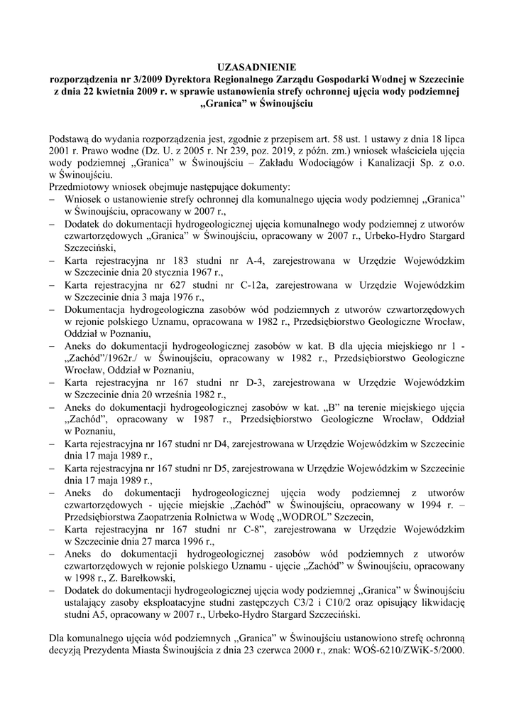 UZASADNIENIE rozporządzenia nr 3/2009 Dyrektora Regionalnego Zarządu Gospodarki Wodnej w Szczecinie z dnia 22 kwietnia 2009 r. w sprawie ustanowienia strefy ochronnej ujęcia wody podziemnej ,,Granica” w Świnoujściu Podstawą do wydania rozporządzenia jest, zgodnie z przepisem art. 58 ust. 1 ustawy z dnia 18 lipca 2001 r. Prawo wodne (Dz. U. z 2005 r. Nr 239, poz. 2019, z późn. zm.) wniosek właściciela ujęcia wody podziemnej ,,Granica” w Świnoujściu – Zakładu Wodociągów i Kanalizacji Sp. z o.o. w Świnoujściu. Przedmiotowy wniosek obejmuje następujące dokumenty: − Wniosek o ustanowienie strefy ochronnej dla komunalnego ujęcia wody podziemnej ,,Granica” w Świnoujściu, opracowany w 2007 r., − Dodatek do dokumentacji hydrogeologicznej ujęcia komunalnego wody podziemnej z utworów czwartorzędowych „Granica” w Świnoujściu, opracowany w 2007 r., Urbeko-Hydro Stargard Szczeciński, − Karta rejestracyjna nr 183 studni nr A-4, zarejestrowana w Urzędzie Wojewódzkim w Szczecinie dnia 20 stycznia 1967 r., − Karta rejestracyjna nr 627 studni nr C-12a, zarejestrowana w Urzędzie Wojewódzkim w Szczecinie dnia 3 maja 1976 r., − Dokumentacja hydrogeologiczna zasobów wód podziemnych z utworów czwartorzędowych w rejonie polskiego Uznamu, opracowana w 1982 r., Przedsiębiorstwo Geologiczne Wrocław, Oddział w Poznaniu, − Aneks do dokumentacji hydrogeologicznej zasobów w kat. B dla ujęcia miejskiego nr 1 „Zachód”/1962r./ w Świnoujściu, opracowany w 1982 r., Przedsiębiorstwo Geologiczne Wrocław, Oddział w Poznaniu, − Karta rejestracyjna nr 167 studni nr D-3, zarejestrowana w Urzędzie Wojewódzkim w Szczecinie dnia 20 września 1982 r., − Aneks do dokumentacji hydrogeologicznej zasobów w kat. „B” na terenie miejskiego ujęcia ,,Zachód”, opracowany w 1987 r., Przedsiębiorstwo Geologiczne Wrocław, Oddział w Poznaniu, − Karta rejestracyjna nr 167 studni nr D4, zarejestrowana w Urzędzie Wojewódzkim w Szczecinie dnia 17 maja 1989 r., − Karta rejestracyjna nr 167 studni nr D5, zarejestrowana w Urzędzie Wojewódzkim w Szczecinie dnia 17 maja 1989 r., − Aneks do dokumentacji hydrogeologicznej ujęcia wody podziemnej z utworów czwartorzędowych - ujęcie miejskie „Zachód” w Świnoujściu, opracowany w 1994 r. – Przedsiębiorstwa Zaopatrzenia Rolnictwa w Wodę „WODROL” Szczecin, − Karta rejestracyjna nr 167 studni nr C-8”, zarejestrowana w Urzędzie Wojewódzkim w Szczecinie dnia 27 marca 1996 r., − Aneks do dokumentacji hydrogeologicznej zasobów wód podziemnych z utworów czwartorzędowych w rejonie polskiego Uznamu - ujęcie „Zachód” w Świnoujściu, opracowany w 1998 r., Z. Barełkowski, − Dodatek do dokumentacji hydrogeologicznej ujęcia wody podziemnej ,,Granica” w Świnoujściu ustalający zasoby eksploatacyjne studni zastępczych C3/2 i C10/2 oraz opisujący likwidację studni A5, opracowany w 2007 r., Urbeko-Hydro Stargard Szczeciński. Dla komunalnego ujęcia wód podziemnych ,,Granica” w Świnoujściu ustanowiono strefę ochronną decyzją Prezydenta Miasta Świnoujścia z dnia 23 czerwca 2000 r., znak: WOŚ-6210/ZWiK-5/2000. Prezydent Miasta Świnoujścia postanowieniem z dnia 20 października 2000 r., znak: WOŚ/6226/12/2000 zmienił znak wymienionej decyzji z ,,WOŚ-6210/ZWiK-5/2000” na ,,WOŚ/6226/1/2000”. W strefie ochronnej ww. strefy wydzielono strefę ochrony pośredniej, bez wydzielania strefy ochrony bezpośredniej. Wyżej wymienioną decyzją w strefie ochronnej ujęcia wprowadzono zakazy i ograniczenia w użytkowaniu terenu. Przedmiotowa strefa ochronna była przekształcana przez przepisy przejściowe dwukrotnie 1) . Najpierw z dniem 1 października 2001 r. stała się strefą ochronną ujęcia wody w rozumieniu przepisów ustawy – Prawo wodne z 1974 r. w brzmieniu nadanym przez ustawę z dnia 27 lipca 2001 r. o wprowadzeniu ustawy - Prawo ochrony środowiska, ustawy o odpadach oraz o zmianie niektórych ustaw (tj. strefą ochronną ustanawianą przez wojewodę w drodze rozporządzenia); aby następnie z dniem 30 grudnia 2003 r. stać się ostatecznie strefą ochronną ujęcia wody w rozumieniu przepisów ustawy z dnia 18 lipca 2001 r. – Prawo wodne (Dz. U. Nr 115, poz. 1229), to jest strefą ochronną, która jest ustanawiana przez dyrektora regionalnego zarządu gospodarki wodnej w drodze rozporządzenia będącego aktem prawa miejscowego. W konsekwencji Dyrektor Regionalnego Zarządu Gospodarki Wodnej w Szczecinie uzyskał formalno-prawną podstawę do dokonywania zmian w przedmiotowej strefie ochronnej oraz do jej zniesienia, w drodze rozporządzenia, będącego aktem prawa miejscowego. W związku z nowymi badaniami geologicznymi przedstawionymi w opracowanym w 2007 r. ,,Dodatku do dokumentacji hydrogeologicznej ujęcia komunalnego wody podziemnej z utworów czwartorzędowych ,,Granica” w Świnoujściu określającym zasięg strefy ochronnej ujęcia”, przyjętym bez zastrzeżeń przez Marszałka Zachodniopomorskiego zawiadomieniem z dnia 10.04.2007 r., znak: DOŚ.III.ZN-7521/5/2007, wyznaczono nowy, dokładniejszy od poprzedniego, zasięg terenu ochrony pośredniej ujęcia. Ze względu na to, że zasięg strefy ochrony pośredniej obowiązującej strefy ochronnej różni się od zasięgu wyznaczonego w ww. dodatku, w złożonym wniosku granice terenu ochrony pośredniej ujęcia dostosowano do granic wyznaczonych w przedmiotowej dokumentacji. Jednocześnie uwzględniając obowiązujące przepisy dotyczące stanowienia stref ochronnych ujęć wód podziemnych, dla zapewnienia odpowiedniej jakości wody ujmowanej, a także ze względu na ochronę zasobów wodnych, zaproponowano zakazy uniemożliwiające wykonywanie robót oraz innych czynności powodujących zmniejszenie przydatności ujmowanej wody i wydajności ujęcia. Wobec powyższego uzasadnione jest zniesienie obecnie istniejącej strefy ochronnej i ustanowienie nowej strefy ochronnej dla ujęcia wody pod