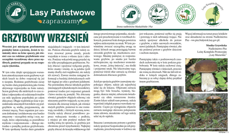 Strona nadleśnictw Maskulińskie i Pisz GRZYBOWY WRZESIEŃ Wrzesień jest miesiącem przełomowym pomiędzy latem a jesienią. Jesień to wyśmienity okres na leśne spacery, jak również czas na rodzinne grzybobranie oraz szczególnie wyczekiwany okres przez myśliwych, ponieważ przypada on na rozpoczęcie rykowiska. W tym roku dzięki sprzyjającym warunkom atmosferycznym sezon grzybowy w piskich lasach na dobre rozpoczął się już w sierpniu. Rodzinne grzybobranie cieszy się bardzo dużą popularnością jako forma aktywnego wypoczynku na łonie natury. Sezon grzybowy dla niektórych to czas relaksu i odpoczynku od codziennych trudów czy mile spędzone popołudnie po całym dniu pracy. Długie wędrówki po lesie w poszukiwaniu smacznych borowików czy podgrzybków są wielką przyjemnością, ale również męczą. Nasz organizm jest zarazem dotleniony i zrelaksowany oraz bardzo zmęczony – szczególnie mózg i oczy, narządy, które odpowiadają za prawidłowe myślenie i rozpoznawanie – dlatego nietrudno o pomyłkę podczas grzybobrania. W lesie spotkamy bardzo dużo gatunków niejadalnych i trujących – w tym śmiertelnie. Podczas zbierania grzybów należy zawsze stosować pewne zasady, przede wszystkim w trosce o własne życie i zdrowie. Poniższe wskazówki mogą przydać się nie tylko początkującym grzybiarzom. Należy zbierać i spożywać wyłącznie grzyby, które znamy i wiemy, że są jadalne (jeśli mamy choćby cień wątpliwości, nie należy ich zrywać). Zawsze można zasięgnąć informacji u bardziej doświadczonych osób lub sięgnąć po atlas z grzybami jadalnymi. Nie powinniśmy zbierać młodych grzybów (niemających wykształconych owocników), ponieważ trudno jest rozpoznać gatunek i łatwo można się pomylić. Nie zbieramy również gatunków objętych ochroną i nie niszczymy grzybów trujących, są one pożywieniem dla zwierząt leśnych, jak również starych grzybów, ponieważ to one rozsiewają zarodniki, z których wyrosną nowe. Grzyby należy zbierać prawidłowo: poprzez wykręcanie trzonka z podłoża, a miejsce po nim przykryć mchem lub ściółką leśną (to sprawia, że grzybnia jest chroniona przed wysychaniem). Najlepiej grzyby zbierać do koszyka wiklinowego lub innego przewiewnego pojemnika, niezalecane jest przechowywanie w torebkach foliowych, ponieważ brak dostępu powietrza wpływa niekorzystnie na smak. W lesie powinniśmy zwracać szczególną uwagę na dzieci, których uwagę przyciągają barwne owocniki grzybów np. muchomora czerwonego. Musimy pamiętać, że rozpoznawanie grzybów, po smaku jest bardzo niebezpieczne, np. muchomor sromotnikowy, zwany „leśną śmiercią”, ma słodki i przyjemny smak. Nie lekceważmy tego, ponieważ wśród ofiar zatrucia są również doświadczeni zbieracze grzybów. Jeżeli po spożyciu grzybów zauważymy niepokojące objawy, należy jak najszybciej udać się do lekarza. Objawami zatrucia mogą być: bóle brzucha, wymioty, biegunka, skurcze mięśni, zaburzenia świadomości czy silnie rozszerzone źrenice. Zanim lekarz udzieli nam pomocy, należy wypróżnić żołądek poprzez wywołanie wymiotów. Często po wystąpieniu objawów zatrucia następuje okresowe polepszenie stanu zdrowia, niezależnie od tego należy udać się do szpitala. Smaczne i aromatyczne potrawy z grzybów należy spożywać bezpośrednio po ich przyrządzeniu, przechowywanie w lodówce nie jest wskazane, ponieważ szybko się psują i powstają w nich substancje trujące. Nie należy spożywać alkoholu do potraw z grzybów, a także surowych owocników, nawet jadalnych. Pamiętajmy również, aby nie podawać potraw z grzybów dzieciom i osobom starszym. Więcej informacji na temat pracy leśników oraz aktualności na stronie Nadleśnictwa Pisz – ww.pisz.bialystok.lasy.gov.pl/. Monika Grzywińska Nadleśnictwo Pisz Leśny Kompleks Promocyjny „Lasy Mazurskie” Pamiętajmy także o podstawowych zasadach zachowania się w lesie podczas grzybobrania. W lesie należy zachować ciszę. Pamiętajmy również o śmieciach, przecież nie rosną na drzewach. Nikt nie lubi ich widoku w leśnych ostępach, dlatego zabierzmy je ze sobą i dajmy dobry przykład innym grzybiarzom. Fotografie – archiwum Nadleśnictwa Pisz 40516piwp-a -O