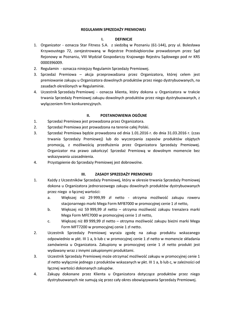 REGULAMIN SPRZEDAŻY PREMIOWEJ 1. 2. 3. 4. 1. 2. 3. 4. 1. 2. 3. 4. I. DEFINICJE Organizator - oznacza Star Fitness S.A. z siedzibą w Poznaniu (61-144), przy ul. Bolesława Krzywoustego 72, zarejestrowaną w Rejestrze Przedsiębiorców prowadzonym przez Sąd Rejonowy w Poznaniu, VIII Wydział Gospodarczy Krajowego Rejestru Sądowego pod nr KRS 0000396009. Regulamin - oznacza niniejszy Regulamin Sprzedaży Premiowej. Sprzedaż Premiowa – akcja przeprowadzana przez Organizatora, której celem jest premiowanie zakupu u Organizatora dowolnych produktów przez niego dystrybuowanych, na zasadach określonych w Regulaminie. Uczestnik Sprzedaży Premiowej - oznacza klienta, który dokona u Organizatora w trakcie trwania Sprzedaży Premiowej zakupu dowolnych produktów przez niego dystrybuowanych, z wyłączeniem firm konkurencyjnych. II. POSTANOWIENIA OGÓLNE Sprzedaż Premiowa jest prowadzona przez Organizatora. Sprzedaż Premiowa jest prowadzona na terenie całej Polski. Sprzedaż Premiowa będzie prowadzona od dnia 1.01.2016 r. do dnia 31.03.2016 r. (czas trwania Sprzedaży Premiowej) lub do wyczerpania zapasów produktów objętych promocją, z możliwością przedłużenia przez Organizatora Sprzedaży Premiowej. Organizator ma prawo zakończyć Sprzedaż Premiową w dowolnym momencie bez wskazywania uzasadnienia. Przystąpienie do Sprzedaży Premiowej jest dobrowolne. III. ZASADY SPRZEDAŻY PREMIOWEJ Każdy z Uczestników Sprzedaży Premiowej, który w okresie trwania Sprzedaży Premiowej dokona u Organizatora jednorazowego zakupu dowolnych produktów dystrybuowanych przez niego o łącznej wartości: a. Większej niż 29 999,99 zł netto - otrzyma możliwość zakupu roweru stacjonarnego marki Mega Form MFB7000 w promocyjnej cenie 1 zł netto, b. Większej niż 59 999,99 zł netto – otrzyma możliwość zakupu trenażera marki Mega Form MFE7000 w promocyjnej cenie 1 zł netto, c. Większej niż 89 999,99 zł netto – otrzyma możliwość zakupu bieżni marki Mega Form MFT7200 w promocyjnej cenie 1 zł netto. Uczestnik Sprzedaży Premiowej wyraża zgodę na zakup produktu wskazanego odpowiednio w pkt. III 1 a, b lub c w promocyjnej cenie 1 zł netto w momencie składania zamówienia u Organizatora. Zakupiony w promocyjnej cenie 1 zł netto produkt jest wydawany wraz z innymi zakupionymi produktami. Uczestnik Sprzedaży Premiowej może otrzymać możliwość zakupu w promocyjnej cenie 1 zł netto wyłącznie jednego z produktów wskazanych w pkt. III 1 a, b lub c, w zależności od łącznej wartości dokonanych zakupów. Zakupy dokonane przez Klienta u Organizatora dotyczące produktów przez niego dystrybuowanych nie sumują się przez cały okres obowiązywania Sprzedaży Premiowej. 5. 6. 7. 8. 9. W czasie trwania Sprzedaży Premiowej Uczestnik Sprzedaży Premiowej może skorzystać wielokrotnie z możliwości dokonania zakupu produktu w promocyjnej cenie 1 zł netto. Uczestnikowi Sprzedaży Premiowej nie przysługuje prawo żądania wymiany produktu zakupionego w promocyjnej cenie 1 zł netto na ekwiwalent pieniężny. Nieterminowe płatności za zakup produktów dystrybuowanych przez Organizatora, a który to zakup uprawnia do otrzymania możliwości zakupu produktu w promocyjnej cenie 1 zł netto lub przeterminowane należności wobec Organizatora Sprzedaży Premiowej, powodują wykluczenie Uczestnika Sprzedaży Premiowej z udziału w Sprzedaży Premiowej. W Programie Sprzedaży Premiowej nie mogą uczestniczyć pracownicy Organizatora oraz członkowie ich najbliższej rodziny. Przez członków najbliższej rodziny rozumie się: wstępnych, zstępnych, rodzeństwo, małżonków, rodziców małżonków oraz osoby pozostające z nimi w stosunku przysposobienia. Jakiekolwiek uprawniania wynikające z Programu Sprzedaży Premiowej nie mogą być przeniesione przez Uczestnika na osobę trzecią, bez zgody Organizatora. IV. REKLAMACJE 1. Reklamacje związane z uczestnictwem w Sprzedaży Premiowej Uczestnik powinien składać korespondencyjnie na adres Organizatora z dopiskiem „Reklamacja Sprzedaży Premiowej”. 2. Reklamacja powinna być sporządzona na piśmie i zawierać podstawowe dane Uczestnika jak również dokładny opis przyczyny reklamacji. 3. O wyniku postępowania reklamacyjnego Uczestnik Sprzedaży Premiowej i zostanie powiadomiony pisemnie nie później niż w terminie do 30 dni od daty doręczenia reklamacji. 4. Decyzja Organizatora w przedmiocie rozpatrywanej reklamacji jest ostateczna i wiążąca. V. POSTANOWIENIA KOŃCOWE 1. Organizator nie ponosi odpowiedzialności za zdarzenia od niego niezależne. Odpowiedzialność Organizatora wobec Uczestnika Sprzedaży Premiowej z tytułu Sprzedaży Premiowej, w żadnym przypadku nie przekroczy wartości produktu zakupionego w promocyjnej cenie 1 zł netto, określonego w Regulaminie. 2. Regulamin jest jedynym dokumentem określającym zasady Sprzedaży Premiowej. Treści zawarte w materiałach reklamowo-promocyjnych mają charakter wyłącznie informacyjny. 3. Treść Regulaminu dostępna jest w siedzibie Organizatora oraz na stronie internetowej www.star-fitness.pl 4. Organizator zastrzega sobie prawo do dokonywania zmian w Regulaminie. Wszelkie zmiany w Regulaminie będą ogłaszane z 7 dniowym wyprzedzeniem na stronie internetowej www.star-fitness.pl oraz w siedzibie Organizatora. 5. W kwestiach nieuregulowanych w Regulaminie znajdują zastosowanie przepisy kodeksu cywilnego. Regulamin wchodzi w życie w dniu 1.01.2016 r.