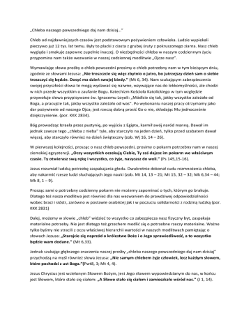 „Chlebanaszegopowszedniegodajnamdzisiaj…” Chlebodnajdawniejszychczasówjestpodstawowympożywieniemczłowieka.Ludziewypiekali pieczywojuż12tys.lattemu.Byłytoplackizciastazgrubejśrutyzpokruszonegoziarna.Naszchleb wyglądaismakujezapewnezupełnieinaczej.Oniezbędnościchlebawnaszymcodziennymżyciu przypominanamtakżewezwaniewnaszejcodziennejmodlitwie„Ojczenasz”. Wymawiającsłowaprośbyochlebpowszedniprosimyochlebpotrzebnynamwtymbieżącymdniu, zgodniezesłowamiJezusa:„Nietroszczciesięwięczbytnioojutro,bojutrzejszydzieńsamosiebie troszczyćsiębędzie.Dosyćmadzieńswojejbiedy.”(Mt6,34).Namszukającymzabezpieczenia swojejprzyszłościsłowatemogąwydawaćsięnaiwne,wzywającenasdolekkomyślności,alechodzi wnichprzedewszystkimozaufanieBogu.KatechizmKościołaKatolickiegowtymwzględzie przywołujesłowaprzypisywaneśw.IgnacemuLoyoli:„Módlciesiętak,jakbywszystkozależałood Boga,apracujcietak,jakbywszystkozależałoodwas”.Powykonaniunaszejpracyotrzymamyjako darpożywienieodnaszegoOjca;jestrzecządobrąprosićGoonie,składającMujednocześnie dziękczynienie.(por.KKK2834). BógprowadzącIzraelaprzezpustynię,powyjściuzEgiptu,karmiłswójnaródmanną.Dawałim jednakzawszetego„chlebaznieba”tyle,abystarczyłonajedendzień,tylkoprzedszabatemdawał więcej,abystarczyłorównieżnadzieńświąteczny(zob.Wj16,14–26). Wpierwszejkolejności,prosząconaszchlebpowszedni,prosimyopokarmpotrzebnynamwnaszej ziemskiejegzystencji.„OczywszystkichoczekująCiebie,Tyzaśdajeszimpokarmwewłaściwym czasie.Tyotwieraszswąrękęiwszystko,cożyje,nasycaszdowoli.”(Ps145,15-16). Jezusrozumiałludzkąpotrzebęzaspakajaniagłodu.Dwukrotniedokonałcudurozmnożeniachleba, abynakarmićrzeszeludzisłuchającychJegonauki(zob.Mt14,13–21;Mt15,32–32;Mk6,34–44; Mk8,1–9). Proszącsamiopotrzebnycodziennypokarmniemożemyzapominaćotych,którymgobrakuje. Dlategoteżnaszamodlitwajestrównieżdlanaswezwaniemdoprawdziwejodpowiedzialności wobecbraciisióstr,zarównowpostawieosobistejjakiwpoczuciusolidarnościzrodzinąludzką(por. KKK2831) Dalej,możemywsłowie„chleb”widziećtowszystkocozabezpieczanaszfizycznybyt,zaspakaja materialnepotrzeby.Niejestdlategoteżgrzechemmodlićsięopotrzebnerzeczymaterialne.Ważne tylkobyśmyniestracilizoczuwłaściwejhierarchiiwartościwnaszychmodlitwachpamiętająco słowachJezusa:„StarajciesięnaprzódokrólestwoBożeioJegosprawiedliwość,atowszystko będziewamdodane.”(Mt6,33). Jednakszukającgłębszegoznaczenianaszejprośby„chlebanaszegopowszedniegodajnamdzisiaj” przychodząnamyślrównieżsłowaJezusa:„Niesamymchlebemżyjeczłowiek,leczkażdymsłowem, którepochodzizustBoga.”(Pwt8,3;Mt4,4). JezusChrystusjestwcielonymSłowemBożym,jestJegosłowemwypowiedzianymdonas,wkońcu jestSłowem,którestałosięciałem:„ASłowostałosięciałemizamieszkałowśródnas.”(J1,14). Modlącsięonaszchlebpowszedniprosimyteżo„pokarm”dlanaszejduszy.Pokarm,którypozwala namrozwijaćsięiwzrastaćduchowoprzezzjednoczeniesięzTym,któryzstąpiłznieba,aw konsekwencjipozwolinamosiągnąćżyciewieczne.PokarmemtymjestEucharystia–prawdziweciało Chrystusa.„OdpowiedziałimJezus:"Jamjestchlebżycia.KtodoMnieprzychodzi,niebędzie łaknął;aktoweMniewierzy,nigdypragnąćniebędzie.”(J6,35).„Jamjestchlebżycia.Ojcowie wasijedlimannęnapustyniipomarli.Tojestchleb,któryzniebazstępuje:ktogospożywa,nie umrze.”(J6,48–50). „ChlebemżyciajestChrystus.NiejestOnchlebemwszystkich,ale„naszym”chlebem.Itakjak mówimy:„naszOjcze”,ponieważjestOnOjcemdlatych,którzyGoznająiwNiegowierzą,podobnie prosimyo„naszchleb”,ponieważChrystusjestchlebemdlatych,którzydotykająJegociała.My, którzyżyjemywChrystusie,przyjmująccodziennieJegoEucharystięjakopokarmzbawienia,prosimy ostałeotrzymywanietegochleba,abyśmyzpowodujakiegościężkiegoprzewinienianiezostali pozbawieniprawadoKomunii,atracącją,niezostalioddzieleniodciałaChrystusa.Onsamnaucza mówiąc:„Jajestemchlebemżywym,któryzstąpiłznieba.Jeśliktospożywatenchleb,będzieżył nawieki.Chlebem,któryJadam,jestmojeciałozażycieświata"(J6,51).”(św.Cyprian)