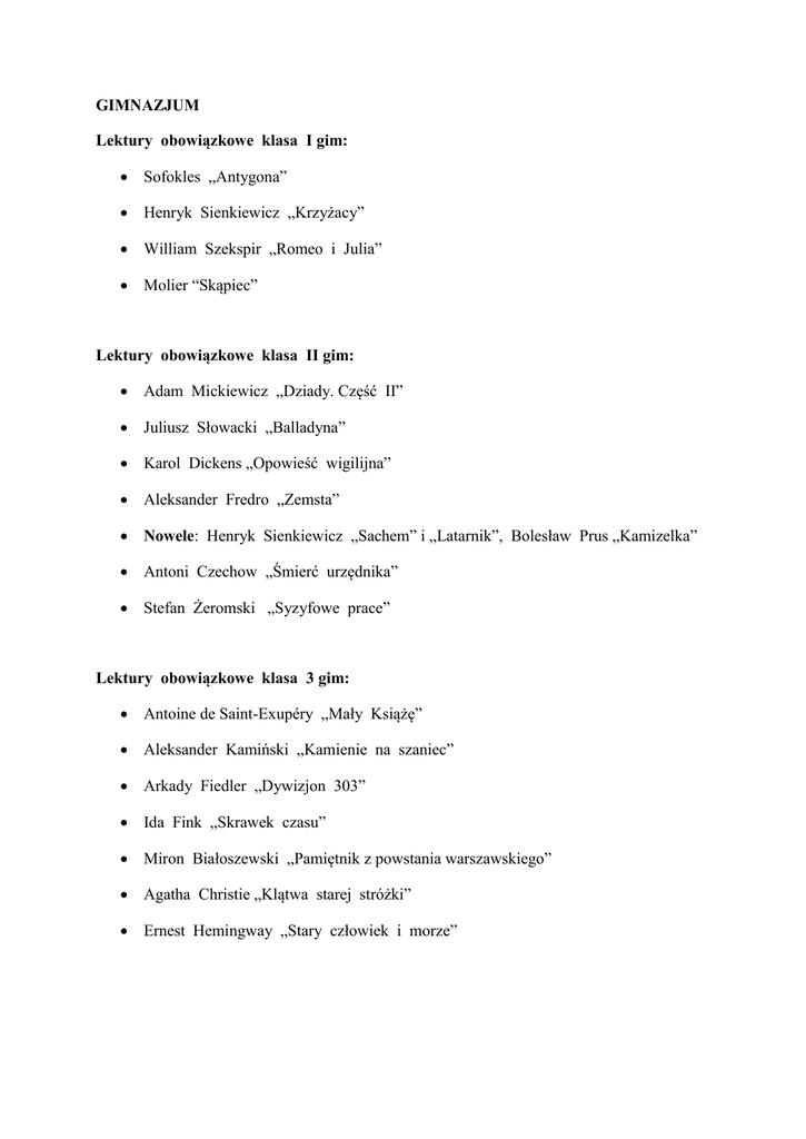 GIMNAZJUM Lektury obowiązkowe klasa I gim: Sofokles „Antygona” Henryk Sienkiewicz „Krzyżacy” William Szekspir „Romeo i Julia” Molier “Skąpiec” Lektury obowiązkowe klasa II gim: Adam Mickiewicz „Dziady. Część II” Juliusz Słowacki „Balladyna” Karol Dickens „Opowieść wigilijna” Aleksander Fredro „Zemsta” Nowele: Henryk Sienkiewicz „Sachem” i „Latarnik”, Bolesław Prus „Kamizelka” Antoni Czechow „Śmierć urzędnika” Stefan Żeromski „Syzyfowe prace” Lektury obowiązkowe klasa 3 gim: Antoine de Saint-Exupéry „Mały Książę” Aleksander Kamiński „Kamienie na szaniec” Arkady Fiedler „Dywizjon 303” Ida Fink „Skrawek czasu” Miron Białoszewski „Pamiętnik z powstania warszawskiego” Agatha Christie „Klątwa starej stróżki” Ernest Hemingway „Stary człowiek i morze”
