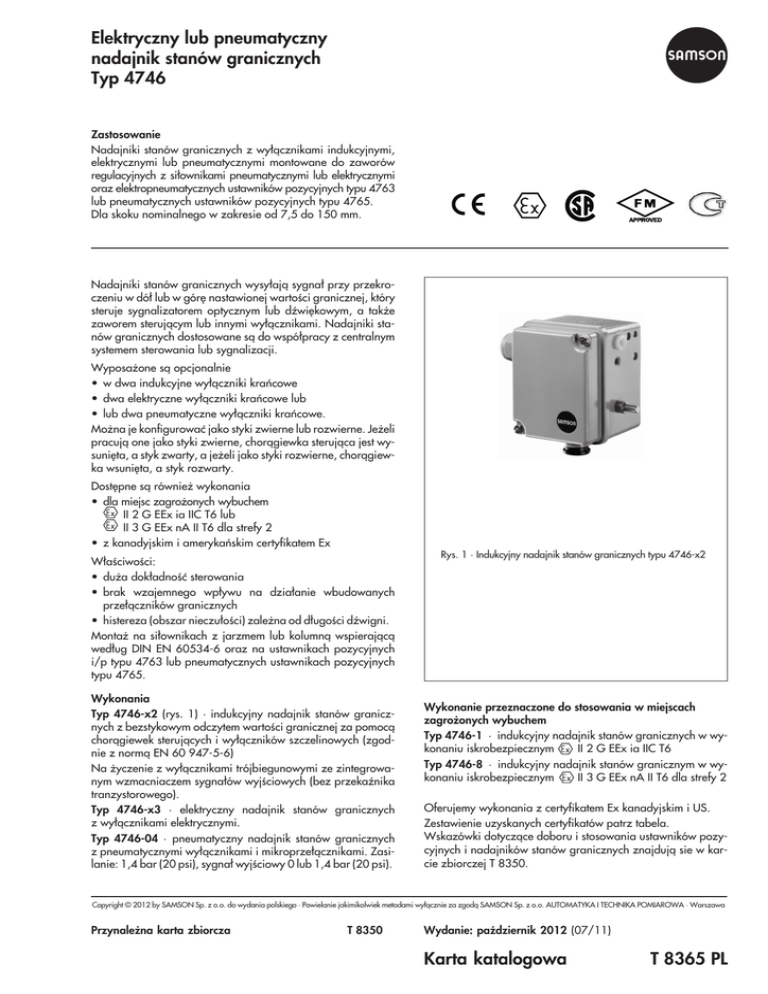 Elektryczny lub pneumatyczny nadajnik stanów granicznych Typ 4746 Zastosowanie Nadajniki stanów granicznych z wy³¹cznikami indukcyjnymi, elektrycznymi lub pneumatycznymi montowane do zaworów regulacyjnych z si³ownikami pneumatycznymi lub elektrycznymi oraz elektropneumatycznych ustawników pozycyjnych typu 4763 lub pneumatycznych ustawników pozycyjnych typu 4765. Dla skoku nominalnego w zakresie od 7,5 do 150 mm. Nadajniki stanów granicznych wysy³aj¹ sygna³ przy przekroczeniu w dó³ lub w górê nastawionej wartoœci granicznej, który steruje sygnalizatorem optycznym lub dŸwiêkowym, a tak¿e zaworem steruj¹cym lub innymi wy³¹cznikami. Nadajniki stanów granicznych dostosowane s¹ do wspó³pracy z centralnym systemem sterowania lub sygnalizacji. Wyposa¿one s¹ opcjonalnie • w dwa indukcyjne wy³¹czniki krañcowe • dwa elektryczne wy³¹czniki krañcowe lub • lub dwa pneumatyczne wy³¹czniki krañcowe. Mo¿na je konfigurowaæ jako styki zwierne lub rozwierne. Je¿eli pracuj¹ one jako styki zwierne, chor¹giewka steruj¹ca jest wysuniêta, a styk zwarty, a je¿eli jako styki rozwierne, chor¹giewka wsuniêta, a styk rozwarty. Dostêpne s¹ równie¿ wykonania • dla miejsc zagro¿onych wybuchem II 2 G EEx ia IIC T6 lub II 3 G EEx nA II T6 dla strefy 2 • z kanadyjskim i amerykañskim certyfikatem Ex W³aœciwoœci: • du¿a dok³adnoœæ sterowania • brak wzajemnego wp³ywu na dzia³anie wbudowanych prze³¹czników granicznych • histereza (obszar nieczu³oœci) zale¿na od d³ugoœci dŸwigni. Monta¿ na si³ownikach z jarzmem lub kolumn¹ wspieraj¹c¹ wed³ug DIN EN 60534-6 oraz na ustawnikach pozycyjnych i/p typu 4763 lub pneumatycznych ustawnikach pozycyjnych typu 4765. Wykonania Typ 4746-x2 (rys. 1) · indukcyjny nadajnik stanów granicznych z bezstykowym odczytem wartoœci granicznej za pomoc¹ chor¹giewek steruj¹cych i wy³¹czników szczelinowych (zgodnie z norm¹ EN 60 947-5-6) Na ¿yczenie z wy³¹cznikami trójbiegunowymi ze zintegrowanym wzmacniaczem sygna³ów wyjœciowych (bez przekaŸnika tranzystorowego). Typ 4746-x3 · elektryczny nadajnik stanów granicznych z wy³¹cznikami elektrycznymi. Typ 4746-04 · pneumatyczny nadajnik stanów granicznych z pneumatycznymi wy³¹cznikami i mikroprze³¹cznikami. Zasilanie: 1,4 bar (20 psi), sygna³ wyjœciowy 0 lub 1,4 bar (20 psi). Rys. 1 · Indukcyjny nadajnik stanów granicznych typu 4746-x2 Wykonanie przeznaczone do stosowania w miejscach zagro¿onych wybuchem Typ 4746-1 · indukcyjny nadajnik stanów granicznych w wykonaniu iskrobezpiecznym II 2 G EEx ia IIC T6 Typ 4746-8 · indukcyjny nadajnik stanów granicznym w wykonaniu iskrobezpiecznym II 3 G EEx nA II T6 dla strefy 2 Oferujemy wykonania z certyfikatem Ex kanadyjskim i US. Zestawienie uzyskanych certyfikatów patrz tabela. Wskazówki dotycz¹ce doboru i stosowania ustawników pozycyjnych i nadajników stanów granicznych znajduj¹ sie w karcie zbiorczej T 8350. Copyright © 2012 by SAMSON Sp. z o.o. do wydania polskiego · Powielanie jakimikolwiek metodami wy³¹cznie za zgod¹ SAMSON Sp. z o.o. AUTOMATYKA I TECHNIKA POMIAROWA · Warszawa Przynale¿na karta zbiorcza T 8350 Wydanie: paŸdziernik 2012 (07/11) Karta katalogowa T 8365 PL Sposób dzia³ania (rys. 2 do 4) Skok grzyba zaworu przenoszony jest bezpoœrednio przez p³ytê (20) na trzpieñ (1.1) i dŸwigniê (1) nadajnika stanów granicznych lub, po zamontowaniu na ustawniku pozycyjnym, poprzez trzpieñ sprzêg³a. Wywo³any ruch posuwisty przekszta³cany jest przez wa³ek (2) na ruch obrotowy. Wszystkie nadajniki stanów granicznych maj¹ ma³¹ histerezê zale¿n¹ od d³ugoœci dŸwigni L (patrz dane techniczne). Eliminuje to niepotrzebne prze³¹czanie styku nawet wtedy, gdy zawór znajduje sie w po³o¿eniu bliskim krañcowego i u³atwia przetwarzanie sygna³u. Indukcyjny nadajnik stanów granicznych typu 4746-x2 (rys. 2) W tych urz¹dzeniach na wa³ku (2) zamocowane s¹ dwa wy³¹czniki (3) wyposa¿one w regulowane chor¹giewki steruj¹ce (4.1) s³u¿¹ce do bezstykowego uruchamiania zamontowanych wy³¹czników szczelinowych (5). Je¿eli chor¹giewka znajduje siê w polu wy³¹cznika szczelinowego, staje siê on w³¹cznikiem wysokorezystancyjnym, a gdy opuszcza to pole niskorezystancyjnym. Sygna³ z wy³¹cznika przekazywany jest do przekaŸnika tranzystorowego. Za pomoc¹ œruby (3.1) mo¿na dokonywaå p³ynnej nastawy punktu za³¹czania. W przypadku wykonañ standardowych (dwu¿y³owych wed³ug EN 60 947-5-6) nale¿y w³¹czyæ w obwody pr¹dowe sygna³ów wyjœciowych przekaŸniki tranzystorowe. Wykonanie trój¿y³owe z wy³¹cznikiem szczelinowym typu SB 3,5-E2 posiada wbudowany na wyjœciu wzmacniacz i nie wymaga stosowania przekaŸnika tranzystorowego. skok Rys. 2 · Schemat dzia³ania indukcyjnego nadajnika stanów granicznych skok Rys. 3 · Schemat dzia³ania elektrycznego nadajnika stanów granicznych Elektryczny nadajnik stanów granicznych typu 4746-x3 (rys. 3) Zamocowane na wa³ku (2) dwa wy³¹czniki (3) wyposa¿one w krzywki (4.2) wyzwalaj¹ wy³¹czniki (7) za poœrednictwem rolki (6.1) przymocowanej do dŸwigni (6). Za pomoc¹ œruby (3.1) mo¿na dokonywaæ p³ynnej nastawy punktu za³¹czania. Pneumatyczny nadajnik stanów granicznych typu 4746-04 (rys. 4) Zamontowane na wa³ku (2) dwa wy³¹czniki (3) wyposa¿one w krzywki (4.2) wyzwalaj¹ w prze³¹czniku (8) system przys³on i dysz, którego ciœnienie kaskadowe (pk1 wzglêdnie pk2) steruje pneumatycznym mikroprze³¹cznikiem (9). Je¿eli krzywka tarczowa (4.2) uruchomi poprzez rolkê (6.1) dŸwigniê za³¹czaj¹c¹ (6), otwiera siê dysza wy³¹cznika doprowadzaj¹c ciœnienie powietrza pz za poœrednictwem mikroprze³¹cznika na wyjœcie A1 lub A2, tzn. wejœcie 5 po³¹czone zostanie z wejœciem 3, a pa1 = pz wzglêdnie pa2 = pz. Dopiero wtedy, gdy krzywka zwolni dŸwigniê (6) odciêty zostanie dop³yw powietrza, a na wyjœciu A1 lub A2 nie wystêpuje ciœnienie, tzn. pa1 = 0 lub pa2 = 0. Za po
