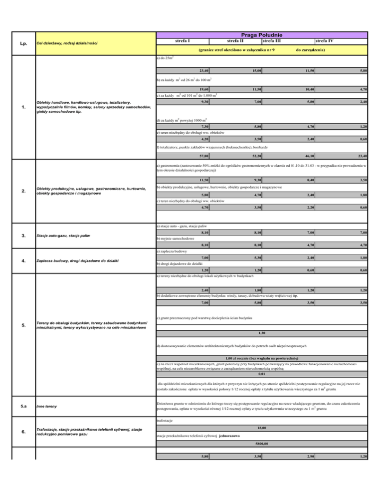 Praga Południe Lp. strefa I Cel dzierżawy, rodzaj działalności strefa II strefa III (granice stref określono w załączniku nr 9 strefa IV do zarządzenia) 2 a) do 25m 23,40 2 2 15,00 11,50 5,80 11,50 10,40 4,70 7,00 5,80 2,40 5,80 4,70 1,20 3,50 2,40 0,60 46,10 23,40 2 b) za każdy m od 26 m do 100 m 19,60 c) za każdy m2 od 101 m2 do 1.000 m2 1. 9,30 Obiekty handlowe, handlowo-usługowe, totalizatory, wypożyczalnie filmów, komisy, salony sprzedaży samochodów, giełdy samochodowe itp. d) za każdy m2 powyżej 1000 m2 7,30 e) teren niezbędny do obsługi ww. obiektów 4,20 f) totalizatory, punkty zakładów wzajemnych (bukmacherskie), lombardy 57,80 52,20 a) gastronomia (zastosowanie 50% zniżki do ogródków gastronomicznych w okresie od 01.10 do 31.03 - w przypadku nie prowadzenia w tym okresie działalności gospodarczej) 11,50 2. Obiekty produkcyjne, usługowe, gastronomiczne, hurtownie, obiekty gospodarcze i magazynowe 9,30 8,40 3,50 4,70 2,40 1,80 3,50 2,20 0,60 8,10 8,10 7,00 7,00 8,10 8,10 4,70 4,70 7,00 5,30 2,40 1,80 1,20 0,60 0,60 1,80 1,20 1,20 3,50 3,50 b) obiekty produkcyjne, usługowe, hurtownie, obiekty gospodarcze i magazynowe 5,80 c) teren niezbędny do obsługi ww. obiektów 4,70 a) stacje auto - gazu, stacje paliw 3. Stacje auto-gazu, stacje paliw b) myjnie samochodowe a) zaplecza budowy 4. Zaplecza budowy, drogi dojazdowe do działki b) drogi dojazdowe do działki 1,20 a) tereny niezbędne do obsługi lokali użytkowych w budynkach 2,40 b) dodatkowe zewnętrzne elementy budynku: windy, tarasy, dobudowa wiaty wejściowej itp. 7,00 5,80 c) grunt przeznaczony pod warstwę docieplenia ścian budynku 5. Tereny do obsługi budynków, tereny zabudowane budynkami mieszkalnymi, tereny wykorzystywane na cele mieszkaniowe 1,20 d) dostosowywanie elementów architektonicznych budynków do potrzeb osób niepełnosprawnych 1,00 zł rocznie (bez względu na powierzchnię) e) na rzecz wspólnot mieszkaniowych, grunt położony przy budynkach pozwalający na prawidłowe funkcjonowanie nieruchomości wspólnej, na cele niezarobkowe związane z zarządzaniem nieruchomością wspólną 0,01 dla spółdzielni mieszkaniowych dla których z przyczyn nie leżących po stronie spółdzielni postępowanie regulacyjne na jej rzecz nie zostało zakończone opłata w wysokości połowy 1/12 rocznej opłaty z tytułu użytkowania wieczystego za 1 m2 gruntu 5.a Inne tereny 6. Trafostacje, stacje przekaźnikowe telefonii cyfrowej, stacje redukcyjno pomiarowe gazu Dzierżawa gruntu w odniesieniu do którego toczy się postępowanie regulacyjne na rzecz władającego gruntem, do czasu zakończenia postępowania, opłata w wysokości równej 1/12 rocznej opłaty z tytułu użytkowania wieczystego za 1 m2 gruntu trafostacje 18,00 stacje przekaźnikowe telefonii cyfrowej jednorazowo 5800,00 5,80 3,50 2,90 1,20 7. Punkty handlowo-usługowe dla ludności, np. krawiectwo, szewstwo itp. Punkty edukacyjno -promocyjne a) targowiska 11,50 5,80 3,50 2,40 b) targowiska (ograniczone ulicami – Mińska-Gocławska-Grochowska) 3,00 8. Targowiska, handel obwoźny i sezonowy c) handel sezonowy za 1m2/dzień 5,20 d) sprzedaż choinek za 1m2/dzień 7,00 c) handel okolicznościowy za 1m2/dzień 10,00 a) społeczne i pojedyncze miejsca postojowe 1,80 b) komercyjne 9. 3,50 3,20 2,40 1,80 c) rejon byłego Stadionu Narodowego (teren ograniczony ulicami Waszyngtona, Wybrzeże Szczecińskie, Sokoła, Targowa, Zamoyskiego, Zieleniecka) 5,80 Parkingi d) parkingi przy targowiskach (ograniczone ulicami Mińska-Gocławska-Grochowska) 1,50 e) parkingi prowadzone przez spółdzielnie mieszkaniowe 2,20 teren pod garaż 10. 4,20 Garaże 3,30 3,30 3,30 teren manewrowy do obsługi garaży 1,11 a) tereny rolnicze, uprawy kwiatów, warzyw, ziół, tereny zieleni, parki, klomby itp. (tereny do 1000 m2) 11. Tereny rolnicze, uprawy kwiatów, warzyw, ziół, tereny zieleni, parki, klomby itp. 0,30 0,30 b) tereny rolnicze, uprawy kwiatów, warzyw, ziół, tereny zieleni, parki, klomby itp. 2 1000 m ) 0,2 0,2 0,20 0,10 (tereny powyżej 0,10 0,05 0,20 0,05 1,00 0,70 c) ogródki przydomowe indywidualne 0,70 d) lustro wodne z linią brzegową 1,10 0,55 sport, rekreacja, kluby sportowe i działalność sportowa, place zabaw 1,30 12. Sport i rekreacja, kluby sportowe i działalność sportowa 13. Działalność fundacji, stowarzyszeń – niedochodowa 1,20 (zastosowanie 50% zniżki w okresie 01.10-01.04 – w przypadku nie prowadzenia działalności gospodarczej) 0,70 za 1m2 powierzchni reklamowej 14. Nośniki reklam (za 1 m 2 powierzchni) 70,00 + opłata za zajęty grunt 11,50 15. Obsługa cmentarza 16. Dzierżawa nieruchomości zabudowanych na cele kulturalnooświatowe 1,30 1,30 0,70 0,70 Festyny i wystawy organizowane przez stowarzyszenia oraz organizacje społeczne nie prowadzące działalności gospodarczej, jednostki organizacyjne m.st. Warszawy - w przypadkach gdy uczestnictwo w imprezach jest bezpłatne zryczałtowana stawka dzienna 12,00 stawka roczna 17. 0,50 Ogródki działkowe z wyłączeniem obszaru Koziej Górki, dla którego obowiązuje stawka roczna 0,40 Cyrk, wesołe miasteczko, festyny komercyjne itp. do 3.000 m² 460,00 / dzień 3001-10.000m² 920,00 / dzień relizacja zdjęć filmowych i reklamowych dzień zdjęciowy 18. 1.500,00 Wynikające ze specyfiki dzielnicy Nieruchomości, zajmowane przez b. właścicieli lub ich następców prawnych i wydzierżawiane na ich rzecz, w tym objęte dekretem z dn. 26.10.1945r. o własności i użytkowaniu gruntów na obszarze m. st. Warszawy 0,05 Dla nieruchomości zabudowanych (domami mieszkalnymi, garażami i budynkami gospodarczymi) wykorzystywanych dla zaspokojenia potrzeb mieszkaniowych dzierżawcy i jego rodziny, zajmowanych przez osoby fizyczne nie będące poprzednimi właścicielami lub ich następcami prawnymi 18. Wynikające ze specyfiki dzielnicy 0,06 19. Odpady surowcowe, śmieci, kontenery, altany śmieciowe 0,10