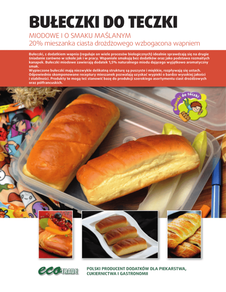 BUŁECZKI DO TECZKI miodowe i o smaku maślanym 20% mieszanka ciasta drożdżowego wzbogacona wapniem Bułeczki, z dodatkiem wapnia (reguluje on wiele procesów biologicznych) idealnie sprawdzają się na drugie śniadanie zarówno w szkole jak i w pracy. Wspaniale smakują bez dodatków oraz jako podstawa rozmaitych kanapek. Bułeczki miodowe zawierają dodatek 1,5% naturalnego miodu dającego wyjątkowo aromatyczny smak. Wypieczone bułeczki mają niezwykle delikatną strukturę są puszyste i miękkie, rozpływają się ustach. Odpowiednio skomponowane receptury mieszanek pozwalają uzyskać wypieki o bardzo wysokiej jakości i stabilności. Produkty te mogą też stanowić bazę do produkcji szerokiego asortymentu ciast drożdżowych oraz półfrancuskich. POLSKI PRODUCENT DODATKÓW DLA PIEKARSTWA, CUKIERNICTWA I GASTRONOMII BUŁECZKI DO TECZKI miodowe i o smaku maślanym 20% mieszanka ciasta drożdżowego wzbogacona wapniem BUŁECZKI DO TECZKI receptura podstawowa Bułeczki do teczki 1000 g Margaryna lub masło 600–800 g Mąka pszenna 400 g Jaja 400 g Drożdże 200 g Woda 1800-2000 g Sposób wykonania: Z wszystkich składników (oprócz tłuszczu) sporządzić ciasto. Pod koniec miesienia dodać płynny tłuszcz. Zwiększyć obroty i miesić ok. 6 min. Pozostawić do fermentacji wstępnej, a następnie podzielić na presy (1,2 kg). Uformować podłużne bułki i układać w foremkach silikonowych. Pozostawić do fermentacji na ok 25- 35 min. Piec w temp. ok. 190–200°C. Z receptury podstawowej można wypiec 200–210 szt. bułeczek (formy silikonowe dostępne u nas w sprzedaży). Ciasto półfrancuskie receptura podstawowa Bułeczki do teczki Mąka schłodzona 500 g 2000 g Margaryna Puff Pastry (do przewałkowania) 700 g Drożdże 100 g Woda schłodzona 900-1000 g Sposób wykonania: Z wszystkich składników (oprócz tłuszczu) sporządzić ciasto. Pod koniec miesienia dodać płynny tłuszcz. Zwiększyć obroty i miesić ok. 6 min. pozostawić do fermentacji wstępnej. Ciasto wałkować na grubość ok. 10 mm. Na ⅔ ciasta kładziemy margarynę Puff Pastry, składamy ciasto na 3, wałkujemy – ten proces powtarzamy trzykrotnie. Między jednym a drugim wałkowaniem ciasto powinno odpoczywać (w chłodni przez ok. 10 min.). Z tak przygotowanego ciasta można formować wszelkiego rodzaju rogaliki, drożdżówki i ciasteczka. Ostateczna fermentacja w garowni przez ok. 30-40 min. Eco Trade Sp. z o.o. ul. Okrężna 8, 44-100 Gliwice, tel./fax +48 32 231 20 87–88, www.ecotrade.pl, e‑mail [email protected] www.facebook.com/Ecotrade.gliwice