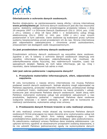 Oświadczenie o ochronie danych osobowych. Bardzo dziękujemy za zainteresowanie naszą ofertą i stroną internetową www.printsystems.pl. Ochrona danych osobowych jest dla nas niezwykle ważna. Jesteśmy zobligowani do przestrzegania przepisów Ustawy z dnia 29 sierpnia 1997 r.o Ochronie Danych Osobowych (Dz.U. 2014, poz. 1182 z zm.), Ustawy z dnia 18 lipca 2002 r. o świadczeniu usług drogą elektroniczną (Dz.U. 2002 nr 144, poz. 1204 z zm.) oraz innych postanowień w tym zakresie. Dane osobowe są kodowane przez cyfrowe systemy bezpieczeństwa przed przesłaniem ich do nas. Strona internetowa jest odpowiednio zabezpieczona i chroniona przed uszkodzeniem, zniszczeniem lub dostępem osób nieupoważnionych. Co jest przedmiotem ochrony danych osobowych? Przedmiotem ochrony danych osobowych są wszystkie dane osobowe. Zgodnie z art. 6 Ustawy o ochronie danych osobowych obejmują one wszelkie informacje dotyczące zidentyfikowanej lub możliwej do zidentyfikowania osoby fizycznej, bez nadmiernych kosztów, czasu lub specjalnych działań. Należą do nich takie informacje, jak np. imię i nazwisko, dane teleadresowe lub adres e-mail. Jaki jest zakres pobierania i zapisywania danych? 1. Przesyłanie materiałów informacyjnych, ofert, odpowiedzi na zapytania. W celu korzystania z naszej strony internetowej nie muszą Państwo podawać swoich danych osobowych. Jednak abyśmy mogli odpowiadać na Państwa zapytania, przesyłać materiały informacyjne, przekazywać dostęp do unikalnych treści, realizować zamówienia na nasze produkty i usługi, konieczne jest otrzymanie Państwa danych osobowych. Jeżeli zlecą nam Państwo wykonanie wybranej usługi lub przesłanie zakupionych u nas produktów, będziemy pobierać i zapisywać Państwa dane osobowe wyłącznie wówczas i w takim zakresie, w jakim jest to konieczne do realizacji zamówienia, wykonania usługi oraz umowy. 2. Przekazanie danych firmom trzecim w celu realizacji umowy. W celu realizacji umowy może okazać się konieczne Państwa danych osobowych firmie pracującej na nasze zlecenie przy wykonywaniu usług lub realizacji umowy. Do takich firm należą współpracujące z nami przedsiębiorstwa spedycyjne lub usługowe działające jako podwykonawcy. Po zakończeniu realizacji umowy Państwa dane zostaną zablokowane i po upływie terminu zgodnie ze stosowanymi przepisami zostaną skasowane, o ile nie udzielili Państwo jednoznacznej zgody na wykorzystanie danych www.printsystems.pl Print Systems - oświadczenie o ochronie danych osobowych. osobowych wykraczające poza ten zakres. Jeżeli w ramach umowy i współpracy realizowane są cykliczne zlecenia, to dane osobowe są przechowywane na czas trwania umowy, w celu zabezpieczenia i realizacji zobowiązań. 3. Wysyłka newslettera. Jeżeli podali Państwo swój adres e-mail w celu przesyłania przez nas newslettera, będziemy wykorzystywać go również dla celów marketingowych, wybiegających poza dystrybucję newslettera, do momentu żądania przez Państwa usunięcia danych z listy subskrypcyjnej. Mogą Państwo w każdej chwili wypisać się z listy subskrypcyjnej zaznaczając odpowiedni tekst w polu otrzymanej wiadomości email. 4. Rekrutacja pracowników. Jeżeli staracie się Państwo o pracę naszej firmie za pośrednictwem naszego serwisu www, wykorzystujemy dane osobowe z CV w celu osobistego kontaktu, przeprowadzenia rekrutacji praz zawarcia umowy o pracę. W tym celu konieczne jest udzielenie zgody na wykorzystanie Państwa danych osobowych i zaakceptowania oświadczenia o ochronie danych. Jeżeli Państwa aplikacja nie zostanie rozpatrzona pozytywnie, rejestrujemy ją wraz z dokumentami przesłanymi w procesie rekrutacji na dane stanowisko oraz z danymi przekazanymi przez stronę internetową w naszej bazie danych kandydatów i przechowujemy przez minimum 12 miesięcy - przez ten czas mają Państwo do nich dostęp. Muszą Państwo jednoznacznie wyrazić zgodę na taki sposób wykorzystania swoich danych osobowych przy składaniu aplikacji na wybrane stanowisko. Zgodę na zapis danych zawartych w dokumentach aplikacyjnych mogą Państwo w każdym momencie odwołać. 5. Zgłoszenia uczestnictwa w szkoleniach i webinarach. Rejestracja uczestnictwa w wydarzeniu wymaga podania danych osobowych, które będą wykorzystywane w celu komunikacji bezpośredniej z uczestnikiem, przesłaniu potwierdzenia uczestnictwa, materiałów informacyjnych, agendy spotkania, dostępu do szkolenia online oraz przypomnienia o zbliżającym się terminie wydarzenia. Dane te będziemy wykorzystywać również w celu przekazywania informacji o nadchodzących wydarzeniach oraz innych reklamowych. Mogą Państwo w każdej chwili wypisać się z listy odbiorców powiadomień zaznaczając odpowiedni tekst w polu otrzymanej wiadomości. www.printsystems.pl Print Systems - oświadczenie o ochronie danych osobowych. Jak są zbierane i wykorzystywane dane użytkowników naszego serwisu www? W celu optymalizacji naszej strony internetowej zbieramy i zapisujemy dane, takie jak np. data wejścia na stronę, strona przekierowująca, z której przeszli Państwo do naszej strony i zbliżone informacje, o ile nie odmówią Państwo zgody na ten rodzaj pobierania i zapisywania danych. Dane te są pobierane anonimowo, bez identyfikowania każdego użytkownika strony. Tworzone są wyłącznie segmenty/ profile użytkowników. Nie ma miejsca łączenia osoby fizycznej oznaczonej danym profilu z zebranymi danymi użytkowymi. W celu gromadzenia i zapisu danych o wykorzystywaniu naszego serwisu www wykorzystujemy pliki cookie. To małe pliki tekstowe zapisywane na Państwa komputerze i służące do zapamiętywania informacji statystycznych, takich jak system operacyjny, przeglądarka internetowa, adres IP, poprzednio oglądana strona internetowa oraz czas wizyty na stronie internetowej. Dane te zbieramy wyłącznie do celów statystycznych i optymalizacyjnych naszej strony www oraz aby uatrakcyjnić naszą o