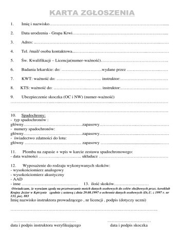 KARTA ZGŁOSZENIA 1. Imię i nazwisko……………………………………………………………………...... 2. Data urodzenia - Grupa Krwi…………...……………………………………….….... 3. Adres: ..…………………………………………………………………………..…… 4. Tel. /mail/ osoba kontaktowa...………...………………………………...…………… 5. Św. Kwalifikacji – Licencja(numer-ważność)……………………………………….. 6. Badania lekarskie: do: ……………………….wydane przez …………………..…… 7. KWT: ważność do: …………………...…….. instruktor:…………………………… 8. KTS: ważność do: …………………...………. instruktor:…………………………… 9. Ubezpieczenie skoczka (OC i NW) (numer-ważność) ………………………...…...……………………………...………………………………… ………………………………………………………………………………………………. 10. Spadochrony: - typ spadochronów : główny……………………….……….…zapasowy……………………..…………..……… - numery spadochronów: główny…………………………….….…zapasowy…………….………...………………… - świadectwo zdatności do lotu: główny …………………….……….….. zapasowy ……...............................................…… 11. Plomba na zapasie + wpis w karcie zestawu spadochronowego: - data ważności …………..….……..….. układacz ………………………………………… 12. Wyposażenie do rodzaju wykonywanych skoków: - wysokościomierz analogowy - wysokościomierz akustyczny - AAD - inne ………………………………… 13. ilość skoków…………………… Oświadczam, że wyrażam zgodę na przetwarzanie moich danych osobowych do celów służbowych przez Aeroklub Krajny Jezior w Kętrzynie zgodnie z ustawą z dnia 29.08.1997 o ochronie danych osobowych (Dz.U. z 1997 r. nr 133, poz. 883 Imię nazwisko instruktora prowadzącego , nr licencji , podpis (dotyczy uczni) ………………………………………………………………….…………………….. .…………………………………… data i podpis instruktora weryfikującego ………………………… data i podpis skoczka DEKLARACJA Ja niżej podpisany(a) (Imię i Nazwisko) Urodzony(a) (data i miejsce) wykonujący(a) skoki w AEROKLUBIE KRAINY JEZIOR w KĘTRZYNIE Podlegający(a) kontroli lotniczo-lekarskiej ( komisja lotniczo-lekarska, orzecznik) Oświadczam, że znana mi jest treść § 35 Rozporządzenia Ministra Komunikacji z dnia 10 września 1986 r. w sprawie personelu lotniczego i zobowiązuję się go ściśle przestrzegać oraz że zapoznałem się z treścią uchwały Zarządu Aeroklubu Polskiego nr 61/11/XV/02 z dnia 30.06.2002 r . Ponadto zobowiązuję się powiadomić pisemnie kierownictwo jednostki, w której będę wykonywał loty lub skoki, o każdej chorobie powodującej niezdolność do pracy (zajęć) ponad 15 dni oraz o każdym leczeniu szpitalnym i przedłożyć na tę okoliczność odpowiednie zaświadczenie lekarskie. Jednocześnie wyrażam zgodę na poddawanie badaniom lekarskim wynikającym z treści uchwały Zarządu Aeroklubu Polskiego nr 61/11/XV/02 z dnia 30.06.2002 r Oświadczam, że wyrażam zgodę na zbieranie, przetwarzanie i wykorzystanie moich danych osobowych, w myśl art. 23 pkt. 1 i pkt. 2 Ustawy o ochronie danych osobowych z dn. 19.08.97 r. (Dz. U. z 1997 r. Nr 133, poz. 833), Swoje dane podaję dobrowolnie, jednocześnie oświadczam, że zostałem(-am) poinformowany(a) o przysługującym mi prawie do wglądu oraz poprawiania swoich danych osobowych dnia (podpis) Stwierdzam, że Pan / Pani Zapoznał(a) się z treścią § 35 Rozporządzenia Ministra Komunikacji w sprawie personelu lotniczego i podpisał(a) niniejszą deklarację w mojej obecności. dnia (podpis ROZPORZĄDZENIE MINISTRA KOMUNIKACJI (wyciąg) Z dnia 10 września 1986 r. w sprawie personelu lotniczego § 35 (Dz. U. poz. 199 nr 41 z dnia 18 listopada 1986 r.). § 35. 1. Zabrania się członkowi personelu lotniczego wykonywania czynności lotniczych przewidzianych w posiadanej przez niego licencji: 1) w stanie nietrzeźwości lub w stanie wskazującym na użycie alkoholu lub podobnie działającego środka, 2) w stanie, w którym odczuwa jakąkolwiek dolegliwość fizyczną lub psychiczną mogącą spowodować niewykonanie lub nieprawidłowe wykonanie tych czynności. 2. członek personelu lotniczego obowiązany jest wstrzymać się od wykonywania czynności przewidzianych w posiadanej przez niego licencji w czasie całego okresu, w którym odczuwa jakąkolwiek dolegliwość fizyczną lub psychiczną mogącą zmniejszyć bezpieczeństwo wykonywania tych czynności. 3. Organ państwowego nadzoru lotniczego nad lotnictwem cywilnym oraz zwierzchnik członka personelu lotniczego są obowiązani niedopuścić posiadacza licencji do wykonywania przewidzianych w niej czynności, jeżeli w czasie ich wykonywania mogłaby powstać u niego dolegliwość fizyczna lub psychiczna mogąca spowodować niebezpieczeństwo dla zdrowia lub życia lub innych osób albo dla mienia. 4. Organ państwowego nadzoru lotniczego nad lotnictwem cywilnym oraz zwierzchnik członka personelu lotniczego w razie stwierdzenia okoliczności określonej w ust. 1 obowiązani są postąpić zgodnie z § 25 ust. 3., a ponadto w razie okoliczności określonej w ust. 1 pkt. 1 skierować członka personelu lotniczego na odpowiednie badania lekarskie. UCHWAŁA ZARZĄDU AEROKLUBU POLSKIEGO NR 61/11/XV/02 z dnia 30.08.2002 r. W sprawie przeciwdziałania używaniu alkoholu i środków odurzających przez kandydatów i członków personelu lotniczego w czasie działalności lotniczej. Podstawa prawna: ustawa z dnia 31.05.1962 r. Pra