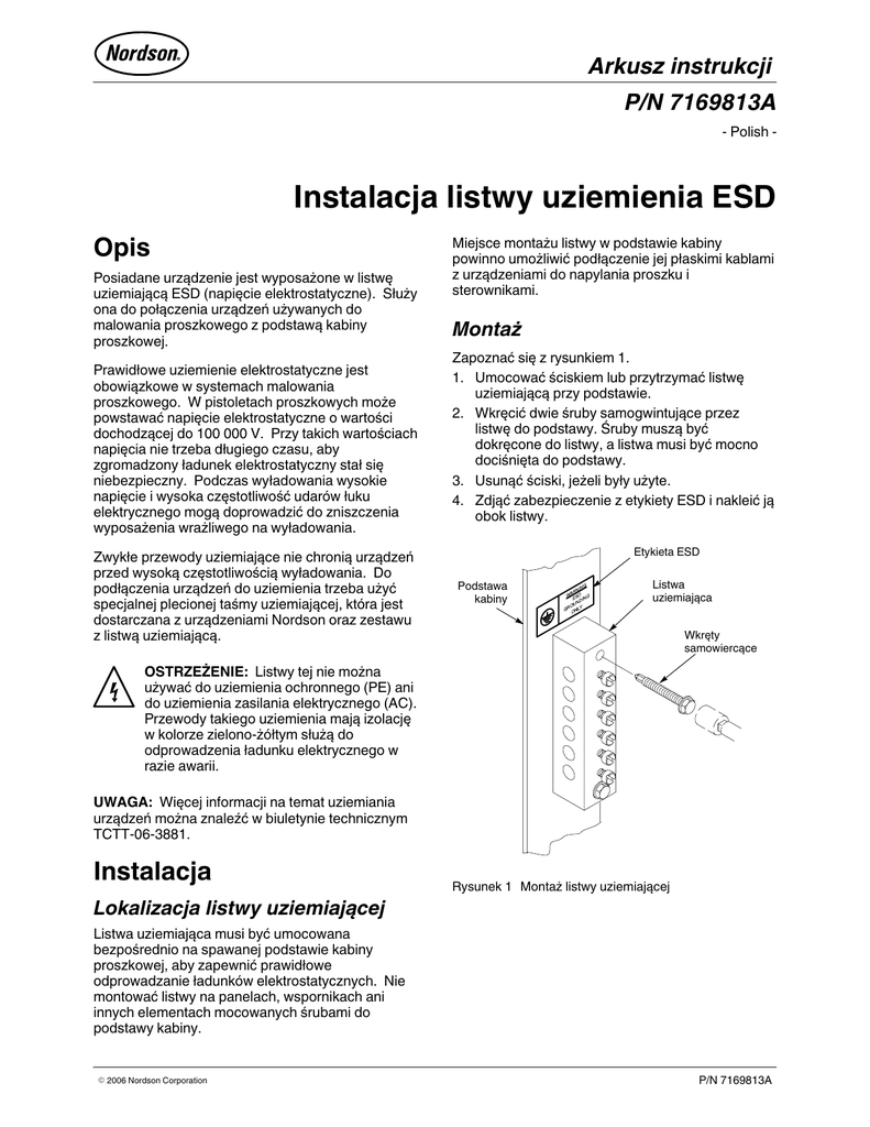 Arkusz instrukcji P/N 7169813A - Polish - Instalacja listwy uziemienia ESD Opis Posiadane urządzenie jest wyposażone w listwę uziemiającą ESD (napięcie elektrostatyczne). Służy ona do połączenia urządzeń używanych do malowania proszkowego z podstawą kabiny proszkowej. Prawidłowe uziemienie elektrostatyczne jest obowiązkowe w systemach malowania proszkowego. W pistoletach proszkowych może powstawać napięcie elektrostatyczne o wartości dochodzącej do 100 000 V. Przy takich wartościach napięcia nie trzeba długiego czasu, aby zgromadzony ładunek elektrostatyczny stał się niebezpieczny. Podczas wyładowania wysokie napięcie i wysoka częstotliwość udarów łuku elektrycznego mogą doprowadzić do zniszczenia wyposażenia wrażliwego na wyładowania. Zwykłe przewody uziemiające nie chronią urządzeń przed wysoką częstotliwością wyładowania. Do podłączenia urządzeń do uziemienia trzeba użyć specjalnej plecionej taśmy uziemiającej, która jest dostarczana z urządzeniami Nordson oraz zestawu z listwą uziemiającą. Miejsce montażu listwy w podstawie kabiny powinno umożliwić podłączenie jej płaskimi kablami z urządzeniami do napylania proszku i sterownikami. Montaż Zapoznać się z rysunkiem 1. 1. Umocować ściskiem lub przytrzymać listwę uziemiającą przy podstawie. 2. Wkręcić dwie śruby samogwintujące przez listwę do podstawy. Śruby muszą być dokręcone do listwy, a listwa musi być mocno dociśnięta do podstawy. 3. Usunąć ściski, jeżeli były użyte. 4. Zdjąć zabezpieczenie z etykiety ESD i nakleić ją obok listwy. Etykieta ESD Podstawa kabiny Listwa uziemiająca Wkręty samowiercące OSTRZEŻENIE: Listwy tej nie można używać do uziemienia ochronnego (PE) ani do uziemienia zasilania elektrycznego (AC). Przewody takiego uziemienia mają izolację w kolorze zielono-żółtym służą do odprowadzenia ładunku elektrycznego w razie awarii. UWAGA: Więcej informacji na temat uziemiania urządzeń można znaleźć w biuletynie technicznym TCTT-06-3881. Instalacja Rysunek 1 Montaż listwy uziemiającej Lokalizacja listwy uziemiającej Listwa uziemiająca musi być umocowana bezpośrednio na spawanej podstawie kabiny proszkowej, aby zapewnić prawidłowe odprowadzanie ładunków elektrostatycznych. Nie montować listwy na panelach, wspornikach ani innych elementach mocowanych śrubami do podstawy kabiny. E 2006 Nordson Corporation P/N 7169813A 2 Instalacja listwy uziemienia ESD Podłączenia kabla uziemiającego Zapoznać się z rysunkiem 2. UWAGA: Do listwy można podłączyć wszystkie składniki systemu proszkowego, takie jak zbiorniki podające, sita, moduły zmiany koloru, wózki, stojaki na pistolety czy manipulatory pistoletów. Do uziemienia ESD trzeba zawsze stosować pleciony płaski kabel (taśmę) dostarczany z wyposażeniem. Płaski pleciony kabel Śruby listwy zaciskowej 1. Zdjąć osłony z końców taśmy. Jej końce są cynowane. 2. Wykręcić nieznacznie sześć śrub w listwie. 3. Włożyć końce taśmy do otworów pod śrubami. Do jednego otworu powinny zmieścić się 3 lub 4 kable. 4. Dokręcić śruby, aby umocować kable w listwie. Rysunek 2 Podłączanie kabli uziemiających do listwy Części W celu uzyskania pomocy technicznej i zamówienia części zamiennych należy skontaktować się z Centrum Obsługi Klienta firmy Nordson pod numerem telefonu (800) 433-9319 lub z lokalnym przedstawicielem firmy Nordson. P/N Opis 1067694 — — 306727 939110 — UWAGA Niniejszy arkusz instrukcji jest dostarczany razem z zestawem uziemienia ESD. W razie konieczności należy zamówić dodatkowe zestawy, aby prawidłowo uziemić wyposażenie wrażliwe na wyładowania elektrostatyczne. W zestawie znajduje się listwa uziemiająca i 15 m (50 stóp) płaskiego kabla. Liczba szt. 6-pozycyjna listwa uziemienia ESD z osprzętem S Listwa uziemiająca ze śrubami M5 z łbem płaskim 1 2 S Śruba samowiercąca heksagonalna ze stali nierdzewnej z podkładką, 10-16 x 1,5" S Elastyczny pleciony kabel płaski S Zakończenie oczkowe, 12-10, 10 4 15 m (50 stóp) 2 2 Uwaga A S Etykieta z ostrzeżeniem „Tylko uziemienie ESD” A: Dodatkową długość przewodu można zamawiać jako wielokrotność jednej stopy. Data wydania 3/06 © 2006. Nordson i logo Nordson są zastrzeżonymi znakami towarowymi Nordson Corporation. P/N 7169813A E 2006 Nordson Corporation