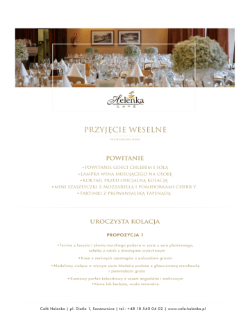 PRZYJĘCIE WESELNE PRZYKŁADOWE MENU POWITANIE •POWITANIE GOŚCI CHLEBEM I SOLĄ •LAMPKA WINA MUSUJĄCEGO NA OSOBĘ •KOKTAJL PRZED OFICJALNĄ KOLACJĄ •MINI SZASZŁYCZKI Z MOZZARELLĄ I POMIDORKAMI CHERR Y •TARTINKI Z PROWANSALSKĄ TAPENADĄ UROCZYSTA KOLACJA PROPOZYCJA 1 •Terrina z łososia i okonia morskiego podana w sosie z sera pleśniowego, sałatką z rukoli z dresingiem orzechowym •Krem z zielonych szparagów z paluszkiem grissini •Medaliony cielęce w winnym sosie Madeira podane z glazurowaną marchewką i ziemniakami gratin •Kremowy parfait kolendrowy z sosem angielskim i malinowym •Kawa lub herbata, woda mineralna Café Helenka | pl. Dietla 1, Szczawnica | tel.: +48 18 540 04 02 | www.cafe-helenka.pl PROPOZYCJA 2 •Rolada z wędzonego łososia faszerowana aromatyzowanym serem kremowym w towarzystwie rzeżuchy i jajek przepiórczych, udekorowana czerwonym kawiorem •Aksamitny krem z leśnych grzybówv aromatyzowany olejem truflowym z ciastem ptysiowym •Polędwiczki wieprzowe w delikatnym sosie z zielonego pieprzu z ziemniakami gratin, zielonymi szparagami i pomidorkami cherry •Markiza z musem czekoladowym i sosem malinowym •Kawa lub herbata, woda mineralna PROPOZYCJA 3 •Carpaccio ze świeżego łososia z cytrynowym pesto, sałata z rukoli z winegretem oliwnym •Tradycyjny żurek serwowany z jajkiem i kiełbasą •Pieczone medaliony z dziczyzny w sosie z wina Porto, serwowane ze strudlem ziemniaczanym i musem warzywnym •Panna Cotta z pomarańczą i sosem truskawkowym •Kawa lub herbata, woda mineralna BUFET BUFET PRZEKĄSEK (DO WYBORU) •Maki sushi z łososiem i ogórkiem •Łosoś wędzony prezentowany w całości z sosem majonezowym •Wybór zimnych mięs pieczonych i domowych pasztetów •Pomidory faszerowane sałatką jarzynową •Galantyna z kurczaka w maladze •Sałatka amerykańska z kurczaka, ananasa i ryżu •Sałatka ziemniaczana z jajkiem •Sałatka z brokułów z sosem aioli i płatkami migdałowymi •Wybór warzyw marynowanych •Filety śledziowe w trzech smakach •Wybór świeżo wypiekanego pieczywa Café Helenka | pl. Dietla 1, Szczawnica | tel.: +48 18 540 04 02 | www.cafe-helenka.pl BUFET DESERÓW (DO WYBORU) •Pudding ryżowy aromatyzowany kokosem i wanilią •Tiramisu •Karmelizowane mini tarty morelowe •Roladki bankietowe z bitą śmietaną, makiem, musem truskawkowym i czekoladowym •Kompozycja owoców sezonowych NAPOJE •Nielimitowane spożycie •Kawa i herbata, woda mineralna, soki owocowe •Napoje gazowane (Coca Cola, Fanta, Sprite) DANIA SERWOWANE W TRAKCIE WIECZORU [DO WYBORU] •Boeuf Strogonoff z polędwicy wołowej •Cordon Bleu – kotlet z drobiu faszerowany szynką i serem •Szaszłyk z karczku z frytkami i surówką z pora •Bigos staropolski •Barszczyk czerwony z krokietem lub pasztecikiem •Kwaśnica z żeberkiem i ziemniakami MENU DOSTĘPNYCH ALKOHOLI WÓDKA BUTELKA 0,5L: Wyborowa, Sobieski, Bols, Żołądkowa czysta DeLuxe, Żubrówka Biała WINO BUTELKA 0,75L.: Hiszpania - Sendas Del Rey Bianco, Tinto Chile - Ventisquero Chardonnay, Cabernet Sauvignon WINO MUSUJĄCE BUTELKA 0,75L.: Francja - F. Chopin, dry, semi dry SZAMPAN BUTELKA 0,75L.: Francja – Nicolas Feuillatte Grand Reserve Brut PIWO PORCJA 0,5L: Tyskie WHISKEY BUTELKA 0,5L. : Grands, Ballantines, J.Walker Red Café Helenka | pl. Dietla 1, Szczawnica | tel.: +48 18 540 04 02 | www.cafe-helenka.pl