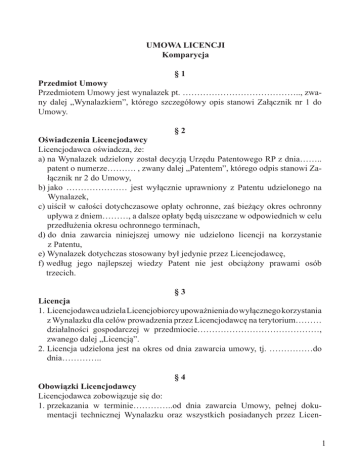 UMOWA LICENCJI Komparycja §1 Przedmiot Umowy Przedmiotem Umowy jest wynalazek pt. ………………………………….., zwany dalej „Wynalazkiem”, którego szczegółowy opis stanowi Załącznik nr 1 do Umowy. §2 Oświadczenia Licencjodawcy Licencjodawca oświadcza, że: a) n a Wynalazek udzielony został decyzją Urzędu Patentowego RP z dnia…….. patent o numerze………. , zwany dalej „Patentem”, którego odpis stanowi Załącznik nr 2 do Umowy, b) jako ………………… jest wyłącznie uprawniony z Patentu udzielonego na Wynalazek, c) u iścił w całości dotychczasowe opłaty ochronne, zaś bieżący okres ochronny upływa z dniem………, a dalsze opłaty będą uiszczane w odpowiednich w celu przedłużenia okresu ochronnego terminach, d) do dnia zawarcia niniejszej umowy nie udzielono licencji na korzystanie z Patentu, e) Wynalazek dotychczas stosowany był jedynie przez Licencjodawcę, f) według jego najlepszej wiedzy Patent nie jest obciążony prawami osób trzecich. §3 Licencja 1. Licencjodawca udziela Licencjobiorcy upoważnienia do wyłącznego korzystania z Wynalazku dla celów prowadzenia przez Licencjodawcę na terytorium……… działalności gospodarczej w przedmiocie……………………………………, zwanego dalej „Licencją”. 2. Licencja udzielona jest na okres od dnia zawarcia umowy, tj. ……………do dnia………….. §4 Obowiązki Licencjodawcy Licencjodawca zobowiązuje się do: 1. przekazania w terminie…………..od dnia zawarcia Umowy, pełnej dokumentacji technicznej Wynalazku oraz wszystkich posiadanych przez Licen cjodawcę informacji i doświadczeń technicznych niezbędnych do korzystania z Wynalazku, 2. przeprowadzenia nie więcej niż ………godzin konsultacji w sprawach związanych z korzystaniem z Wynalazku, 3. przeprowadzenie szkolenia, którego przedmiotem będzie korzystanie z Wynalazku, trwającego ………..godzin, dla uprzednio wskazanych pisemnie pod rygorem nieważności przez Licencjobiorcę ……. osób fizycznych, 4. wykonywania wszelkich czynności niezbędnych do utrzymania Patentu oraz powstrzymywania się od czynności, których wykonywanie mogłoby skutkować wygaśnięciem Patentu, 5. ponoszenia opłat okresowych wymaganych aktualnymi w danej chwili przepisami prawa za kolejne okresy ochrony Wynalazku. §5 Obowiązki i uprawnienia Licencjobiorcy 1. Licencjobiorca zobowiązuje się do: a) rozpoczęcia stosowania Wynalazku nie później niż w terminie …….....................……od dnia zawarcia umowy, w ten sposób, że: ……… …………………………………................…………………………, b) dołożenia należytej staranności, by Wynalazek produkowany przez Licencjobiorcę na podstawie Licencji spełniał wszystkie parametry wyszczególnione w Załączniku nr 3 do umowy, c) zachowania w ścisłej tajemnicy, zarówno w okresie obowiązywania umowy, jak i w okresie…………. po jej wygaśnięciu, wszelkich informacji dotyczących istoty Wynalazku, d) niepodejmowania w okresie obowiązywania niniejszej umowy, a także po jej wygaśnięciu, jakichkolwiek działań o charakterze konkurencyjnym wobec Licencjodawcy w zakresie związanym z Wynalazkiem, e) niezwłocznego informowania Licencjodawcy, na piśmie pod rygorem nieważności, o wszelkich znanych Licencjobiorcy przypadkach naruszenia lub próbach naruszenia Patentu. 2. Licencjobiorca uprawniony jest do złożenia wniosku o wpis Umowy do rejestru patentowego prowadzonego przez Urząd Patentowy RP. §6 Gwarancja 1. Licencjodawca oświadcza, że gwarantuje w okresie……………..od dnia zawarcia umowy i pod warunkiem przestrzegania reżimu technologicznego opisanego w Załączniku nr 3 do Umowy, że rozwiązanie według Wynalazku spełniać będzie parametry opisane w Załączniku nr 4 do umowy. 2. Licencjodawca upoważniony jest do dokonywania w każdym czasie w okresie obowiązywania niniejszej umowy kontroli przestrzegania przez Licencjodawcę reżimu technologicznego, o którym mowa w ust. 1 par. 6 niniejszej umowy. §7 Opłaty licencyjne 1. Licencjobiorca za udzielenie Licencji zapłaci Licencjodawcy: a) jednorazową opłatę w kwocie……........................................................….. (słownie:…………........................……….……………….), płatną w terminie………………od dnia zawarcia umowy, b) opłatę okresową w kwocie……………................................................. (słownie:…………………………………), płatną z dołu za każdy kwartał okresu obowiązywania umowy, w terminie do ostatniego dnia miesiąca kalendarzowego następującego po danym kwartale. 2. Strony zgodnie postanawiają, iż w przypadku, gdy umowy wygaśnie przed upływem kwartału stanowiącego okres rozliczeniowy opłaty okresowej, o której mowa w ust. 1 pkt b), Licencjodawcy przysługuje przedmiotowa opłata okresowa w pełnym wymiarze. §8 Sublicencje 1. Licencjobiorca może udzielić dalszej licencji na korzystanie z Wynalazku wyłącznie za uprzednią, pisemną pod rygorem nieważności, zgodą Licencjodawcy i w zakresie wynikającym z udzielonej Licencji. 2. Licencjodawca nie jest zobowiązany do udzielenia zgody, o której mowa w ust. 1 par. 8 niniejszej umowy. §9 Ulepszenia Wynalazku 1. W przypadku, gdy którakolwiek ze Stron dokona samodzielnie ulepszenia Wynalazku, niezwłocznie poinformuje o tym, pisemnie pod rygorem nieważności, Stronę przeciwną i na żądanie tej Strony udzieli jej nieodpłatnej licencji niewyłącznej na korzystanie z tego ulepszenia. 2. Strony zgodnie postanawiają, iż przed przystąpieniem do wzajemnej współpracy przy udoskonaleniu Wynalazku, na podstawie odrębnego pisemnego porozumienia, określą zasady i warunki tej współpracy oraz podział przysługujących im praw majątkowych do uzyskanych w wyniku tej współpracy rezultatów. § 10 Wygaśnięcie Umowy Umowa wygasa wraz z upływem okresu, na k