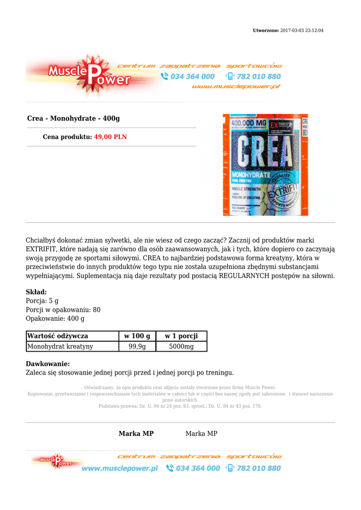 Utworzono: 2017-03-03 23:12:04 Crea - Monohydrate - 400g Cena produktu: 49,00 PLN Chciałbyś dokonać zmian sylwetki, ale nie wiesz od czego zacząć? Zacznij od produktów marki EXTRIFIT, które nadają się zarówno dla osób zaawansowanych, jak i tych, które dopiero co zaczynają swoją przygodę ze sportami siłowymi. CREA to najbardziej podstawowa forma kreatyny, która w przeciwieństwie do innych produktów tego typu nie została uzupełniona zbędnymi substancjami wypełniającymi. Suplementacja nią daje rezultaty pod postacią REGULARNYCH postępów na siłowni. Skład: Porcja: 5 g Porcji w opakowaniu: 80 Opakowanie: 400 g Wartość odżywcza Monohydrat kreatyny w 100 g w 1 porcji 99,9g 5000mg Dawkowanie: Zaleca się stosowanie jednej porcji przed i jednej porcji po treningu. Oświadczamy, że opis produktu oraz zdjęcia zostały stworzone przez firmę Muscle Power. Kopiowanie, przetwarzanie i rozpowszechnianie tych materiałów w całości lub w części bez naszej zgody jest zabronione i stanowi naruszenie praw autorskich. Podstawa prawna: Dz. U. 94 nr 24 poz. 83, sprost.: Dz. U. 94 nr 43 poz. 170. Marka MP Marka MP Adres: http://www.muscle.trustnet.pl/ Telefon: 34 36 43 000, 782 010 880 Email: [email protected]