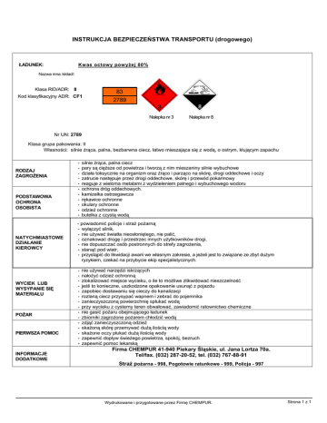 INSTRUKCJA BEZPIECZEŃSTWA TRANSPORTU (drogowego) ŁADUNEK: Kwas octowy powyżej 80% Nazwa inna /skład/: Klasa RID/ADR: 8 Kod klasyfikacyjny ADR: CF1 83 2789 Nalepka nr 3 Nalepka nr 8 Nr UN: 2789 Klasa grupa pakowania: II Własności: silnie żrąca, palna, bezbarwna ciecz, łatwo mieszająca się z wodą, o ostrym, kłującym zapachu RODZAJ ZAGROŻENIA PODSTAWOWA OCHRONA OSOBISTA NATYCHMIASTOWE DZIAŁANIE KIEROWCY WYCIEK LUB WYSYPANIE SIĘ MATERIAŁU POŻAR PIERWSZA POMOC INFORMACJE DODATKOWE - silnie żrąca, palna ciecz pary są cięższe od powietrza i tworzą z nim mieszaniny silnie wybuchowe działa toksycznie na organizm oraz żrąco i parząco na skórę, drogi oddechowe i oczy zatrucie następuje przez drogi oddechowe, skórę i przewód pokarmowy reaguje z wieloma metalami z wydzieleniem palnego i wybuchowego wodoru ochrona dróg oddechowych. kamizelka ostrzegawcza rękawice ochronne okulary ochronne odzież ochronna butelka z czystą wodą - powiadomić policje i straż pożarną - wyłączyć silnik, - nie używać światła nieosłoniętego, nie palić, - oznakować drogę i przestrzec innych użytkowników drogi, - nie dopuszczać osób postronnych do strefy zagrożenia, - stanąć pod wiatr, - przystąpić do likwidacji awarii we własnym zakresie, a jeżeli jest to związane ze zbyt dużym ryzykiem, czekać na przybycie ekip specjalistycznych. - nie używać narzędzi iskrzących nałożyć odzież ochronną zlokalizować miejsce wycieku, o ile to możliwe zlikwidować nieszczelność jeśli to konieczne, uszkodzone opakowanie usunąć z pojazdu zapobiec dostawaniu się cieczy do kanalizacji rozlaną ciecz przysypać wapnem i zebrać do pojemnika zanieczyszczoną powierzchnię spłukać wodą przy wycieku z cysterny teren obwałować, zawiadomić ratownictwo chemiczne nie gasić pożaru obejmującego ładunek zbiorniki zagrożone pożarem chłodzić wodą zdjąć zanieczyszczoną odzież skażoną skórę przemywać dużą ilością wody skażone oczy płukać dużą ilością wody zapewnić dopływ świeżego powietrza, spokój, bezruch - zapewnić pomoc lekarską Firma CHEMPUR 41-940 Piekary Śląskie, ul. Jana Lortza 70a. Tel/fax. (032) 287-20-52, tel. (032) 767-88-91 Straż pożarna - 998, Pogotowie ratunkowe - 999, Policja - 997 Wydrukowane i przygotowane przez Firmę CHEMPUR. Strona 1 z 1