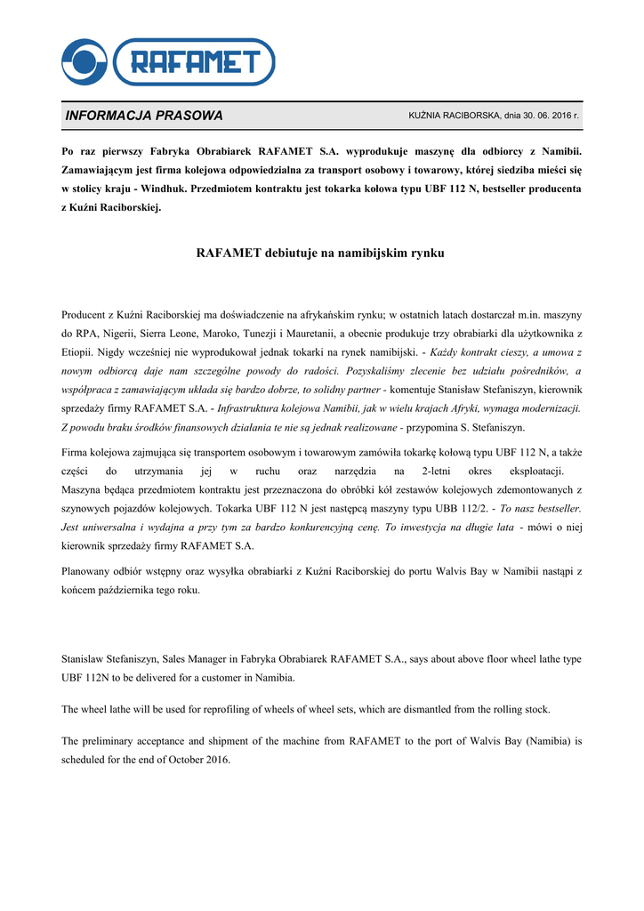INFORMACJA PRASOWA KUŹNIA RACIBORSKA, dnia 30. 06. 2016 r. Po raz pierwszy Fabryka Obrabiarek RAFAMET S.A. wyprodukuje maszynę dla odbiorcy z Namibii. Zamawiającym jest firma kolejowa odpowiedzialna za transport osobowy i towarowy, której siedziba mieści się w stolicy kraju - Windhuk. Przedmiotem kontraktu jest tokarka kołowa typu UBF 112 N, bestseller producenta z Kuźni Raciborskiej. RAFAMET debiutuje na namibijskim rynku Producent z Kuźni Raciborskiej ma doświadczenie na afrykańskim rynku; w ostatnich latach dostarczał m.in. maszyny do RPA, Nigerii, Sierra Leone, Maroko, Tunezji i Mauretanii, a obecnie produkuje trzy obrabiarki dla użytkownika z Etiopii. Nigdy wcześniej nie wyprodukował jednak tokarki na rynek namibijski. - Każdy kontrakt cieszy, a umowa z nowym odbiorcą daje nam szczególne powody do radości. Pozyskaliśmy zlecenie bez udziału pośredników, a współpraca z zamawiającym układa się bardzo dobrze, to solidny partner - komentuje Stanisław Stefaniszyn, kierownik sprzedaży firmy RAFAMET S.A. - Infrastruktura kolejowa Namibii, jak w wielu krajach Afryki, wymaga modernizacji. Z powodu braku środków finansowych działania te nie są jednak realizowane - przypomina S. Stefaniszyn. Firma kolejowa zajmująca się transportem osobowym i towarowym zamówiła tokarkę kołową typu UBF 112 N, a także części do utrzymania jej w ruchu oraz narzędzia na 2-letni okres eksploatacji. Maszyna będąca przedmiotem kontraktu jest przeznaczona do obróbki kół zestawów kolejowych zdemontowanych z szynowych pojazdów kolejowych. Tokarka UBF 112 N jest następcą maszyny typu UBB 112/2. - To nasz bestseller. Jest uniwersalna i wydajna a przy tym za bardzo konkurencyjną cenę. To inwestycja na długie lata - mówi o niej kierownik sprzedaży firmy RAFAMET S.A. Planowany odbiór wstępny oraz wysyłka obrabiarki z Kuźni Raciborskiej do portu Walvis Bay w Namibii nastąpi z końcem października tego roku. Stanislaw Stefaniszyn, Sales Manager in Fabryka Obrabiarek RAFAMET S.A., says about above floor wheel lathe type UBF 112N to be delivered for a customer in Namibia. The wheel lathe will be used for reprofiling of wheels of wheel sets, which are dismantled from the rolling stock. The preliminary acceptance and shipment of the machine from RAFAMET to the port of Walvis Bay (Namibia) is scheduled for the end of October 2016. INFORMACJA PRASOWA KUŹNIA RACIBORSKA, dnia 30. 06. 2016 r. *** RAFAMET S.A. Fabryka Obrabiarek RAFAMET S.A. z Kuźni Raciborskiej jest jednym z kilku na świecie producentów obrabiarek specjalnych do obróbki zestawów kołowych pojazdów szynowych (kolej, metro, tramwaje). Wykonuje również, na jednostkowe zamówienia, wielkogabarytowe obrabiarki specjalistyczne dla odbiorców w sektorach: energetycznym, maszynowym, stoczniowym, hutniczym oraz zbrojeniowym. Udział eksportu w sprzedaży to około 70-80 proc. Kapitał zakładowy wynosi 43.187.010,00 zł.