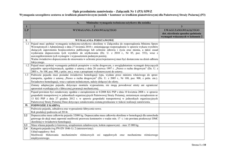 Opis przedmiotu zamówienia – Załącznik Nr 1 (P3) SIWZ Wymagania szczegółowe zestawu ze środkiem pianotwórczym (nośnik + kontener ze środkiem pianotwórczym) dla Państwowej Straży Pożarnej (P3) A. 1 L.P . Minimalne wymagania techniczno-użytkowe dla nośnika 2 WYMAGANIA ZAMAWIAJĄCEGO 3 UWAGI ZAMAWIAJĄCEGO dot. określenia sposobu spełniania wymagań wskazanych w kolumnie 2 I. WYMAGANIA PODSTAWOWE 1.1 Pojazd musi spełniać wymagania techniczno-użytkowe określone w Załączniku do rozporządzenia Ministra Spraw Wewnętrznych i Administracji z dnia 27 kwietnia 2010 r. zmieniającego rozporządzenie w sprawie wykazu wyrobów służących zapewnieniu bezpieczeństwa publicznego lub ochronie zdrowia i życia oraz mienia, a także zasad wydawania dopuszczenia tych wyrobów do użytkowania (Dz. U. z 2010 r., Nr 85, poz. 553), wraz z uszczegółowieniem tych wymogów i wyposażeniem podanym poniżej. Ważne świadectwo dopuszczenia do stosowania w ochronie przeciwpożarowej musi być dostarczone na dzień odbioru faktycznego. 1.2 Pojazd musi spełniać wymagania polskich przepisów o ruchu drogowym, z uwzględnieniem wymagań dotyczących pojazdów uprzywilejowanych, zgodnie z ustawą z dnia 20 czerwca 1997 r. „Prawo o ruchu drogowym” (Dz. U. z 2005 r., Nr 108, poz. 908, z późn. zm.), wraz z przepisami wykonawczymi do ustawy. 1.3 Podwozie pojazdu musi posiadać świadectwo homologacji typu, wydane przez ministra właściwego do spraw transportu, zgodnie z ustawą „Prawo o ruchu drogowym” (Dz. U. z 2005 r., Nr 108, poz. 908, z późn. zm.). Świadectwo homologacji, wraz z opisem technicznym, należy dołączyć do oferty. Zmiany adaptacyjne pojazdu, dotyczące montażu wyposażenia, nie mogą powodować utraty ani ograniczać uprawnień wynikających z fabrycznej gwarancji mechanicznej. Pojazd powinien być oznakowany zgodnie z zarządzeniem nr 8/2008 KG PSP z dnia 10 kwietnia 2008 r. w sprawie gospodarki transportowej w jednostkach organizacyjnych Państwowej Straży Pożarnej, zmienionym zarządzeniem nr 13 KG PSP z dnia 27 grudnia 2012 r. w sprawie gospodarki transportowej w jednostkach organizacyjnych Państwowej Straży Pożarnej Dane dotyczące oznakowania zostaną przekazane w trakcie realizacji zamówienia. II. PODWOZIE Z KABINĄ Podwozie pojazdu, zabudowa oraz wyposażenie fabrycznie nowe. Rok produkcji podwozia od 2014r. 2.2 Dopuszczalna masa całkowita pojazdu 32000 kg. Dopuszczalna masa całkowita określona w homologacji dla samochodu gotowego do akcji musi zapewnić możliwość przewozu kontenerów o wadze min. 17 t. i nie powinna przekroczyć DMC określonej w świadectwie homologacji. 2.3 Masa własna pojazdu (z kierowcą, urządzeniem załadowczym, kołem zapasowym) – max 15 000 kg. 2.4 Kategoria pojazdu (wg PN-EN 1846-1): 2 (uterenowiony). Układ napędowy: 8x4. Możliwość blokowania mechanizmów różnicowych osi napędowych oraz mechanizmu różnicowego międzyosiowego. Strona 1 z 10 Opis przedmiotu zamówienia – Załącznik Nr 1 (P3) SIWZ Wymagania szczegółowe zestawu ze środkiem pianotwórczym (nośnik + kontener ze środkiem pianotwórczym) dla Państwowej Straży Pożarnej (P3) 2.5 2.6 2.7 2.8 2.9 2.10 2.11 2.12 2.13 Podwozie pojazdu o wzmocnionym zawieszeniu w związku ze stałym obciążeniem pojazdu masą kontenera. Stabilizatory przechyłów bocznych, zamontowane przy osiach przednich i tylnych. Osie tylne z kołami bliźniaczymi. Ogumienie uniwersalne (szosowo-terenowe), z bieżnikiem dostosowanym do różnych warunków atmosferycznych. Pełnowymiarowe koło zapasowe z miejscem do stałego przewożenia i łatwego zdejmowania oraz zakładania przez jedną osobę (bieżnik jak dla opon kół przednich). Silnik z zapłonem samoczynnym, spełniający normy czystości spalin min EURO 6 lub EURO 5 pod warunkiem Podać markę, typ i moc silnika w kW możliwości rejestracji w 2015r., przystosowany do spalania biopaliw ciekłych zgodnie z uchwałą nr 134/2007 Rady oraz rodzaj zastosowanej skrzyni Ministrów z dnia 24 lipca 2007 r. w sprawie „Wieloletniego programu promocji biopaliw lub innych paliw biegów. odnawialnych w latach 2008-2014” (M. P. z 2007 r. Nr 53, poz. 607). W instrukcji użytkowania samochodu muszą znaleźć się zapisy o warunkach technicznych oraz czynnościach obsługowych koniecznych przy zasilaniu silnika biopaliwami lub paliwami z biokomponentami. Gwarancja na pojazd nie może wyłączać stosowania w/w paliwa. Maksymalna moc silnika: min 300 kW. Skrzynia biegów automatyczna lub zautomatyzowana. Pojemność zbiornika paliwa powinna zapewnić pokonanie dystansu min 400 km jazdy drogowej, bez konieczności Podać pojemność zbiornika paliwa uzupełniania zbiornika. Wylot spalin powinien być wyprowadzony na lewą stronę pojazdu i przystosowany do współpracy z odciągiem spalin. Konkretny typ urządzenia oddymiającego zostanie podany w trakcie realizacji zamówienia. Układ hamulcowy z systemem przeciwblokującym ABS. Pojazd wyposażony w hak holowniczy paszczowy, typ 40 wg PN-S-48023, przystosowany do ciągnięcia przyczepy o dopuszczalnej masie całkowitej min 16 000 kg. Z tyłu pojazdu zainstalowane przyłącza układu elektrycznego i pneumatycznego dwuobwodowego systemu hamulcowego do połączenia instalacji przyczepy. Dodatkowe gniazdo elektryczne 7-pinowe, 24 V zamontowane z tyłu pojazdu. Pojazd wyposażony w zaczep holowniczy z przodu. Pojazd wyposażony w cztery szekle do mocowania lin do wyciągania pojazdu, zamontowane po dwie z przodu i tyłu pojazdu. Szekle wytrzymujące obciążenie min 100 kN każda. Kolor pojazdu: - błotniki i zderzaki - kolor biały RAL 9010, - kabina i zabudowa pożarnicza - kolor czerwony RAL 3000. Pojazd wyposażony w integralny układ prostowniczy do ładowania akumulatorów z zewnętrznego źródła zasilania o napięciu 230 V. Zintegrowane złącze prądu elektrycznego o napięciu 230 V oraz sprężonego powietrza do uzupełniania układu pneumatycznego samochodu z s