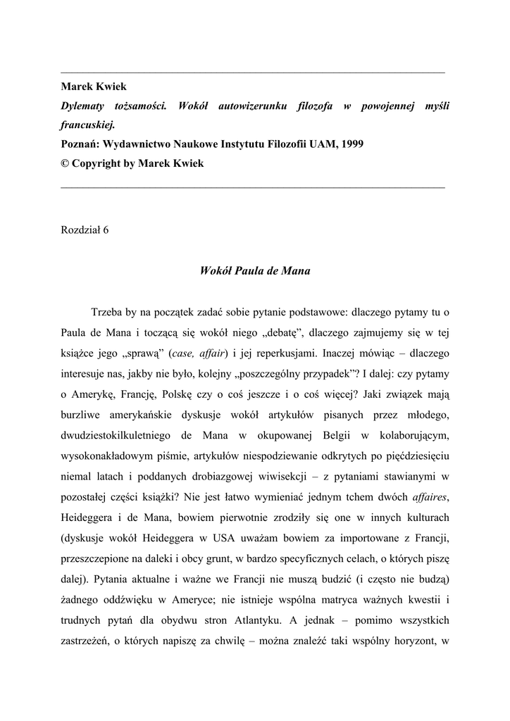 _____________________________________________________________________ Marek Kwiek Dylematy tożsamości. Wokół autowizerunku filozofa w powojennej myśli francuskiej. Poznań: Wydawnictwo Naukowe Instytutu Filozofii UAM, 1999 © Copyright by Marek Kwiek _____________________________________________________________________ Rozdział 6 Wokół Paula de Mana Trzeba by na początek zadać sobie pytanie podstawowe: dlaczego pytamy tu o Paula de Mana i toczącą się wokół niego „debatę”, dlaczego zajmujemy się w tej książce jego „sprawą” (case, affair) i jej reperkusjami. Inaczej mówiąc – dlaczego interesuje nas, jakby nie było, kolejny „poszczególny przypadek”? I dalej: czy pytamy o Amerykę, Francję, Polskę czy o coś jeszcze i o coś więcej? Jaki związek mają burzliwe amerykańskie dyskusje wokół artykułów pisanych przez młodego, dwudziestokilkuletniego de Mana w okupowanej Belgii w kolaborującym, wysokonakładowym piśmie, artykułów niespodziewanie odkrytych po pięćdziesięciu niemal latach i poddanych drobiazgowej wiwisekcji – z pytaniami stawianymi w pozostałej części książki? Nie jest łatwo wymieniać jednym tchem dwóch affaires, Heideggera i de Mana, bowiem pierwotnie zrodziły się one w innych kulturach (dyskusje wokół Heideggera w USA uważam bowiem za importowane z Francji, przeszczepione na daleki i obcy grunt, w bardzo specyficznych celach, o których piszę dalej). Pytania aktualne i ważne we Francji nie muszą budzić (i często nie budzą) żadnego oddźwięku w Ameryce; nie istnieje wspólna matryca ważnych kwestii i trudnych pytań dla obydwu stron Atlantyku. A jednak – pomimo wszystkich zastrzeżeń, o których napiszę za chwilę – można znaleźć taki wspólny horyzont, w Wokół Paula de Mana 237 którym obie dyskusje można traktować poniekąd zbiorczo, w którym obie dyskusje wzajemnie się oświetlają i prezentują się jako spory o autowizerunek filozofa w kulturze. Z moje perspektywy dotyczą one dokładnie tych samych problemów. Oczywiście toczą się one w odmiennym słowniku, wśród innych kwestii, korzystając z innych strategii i w innych celach. Gdyby trzymać się tradycyjnych podziałów dyscyplinarnych, to przecież toczą się one w zupełnie (tradycyjnie) innych dziedzinach – w teorii literatury (prawda, że podszytej filozofią) i w filozofii samej. A jednak mamy nadzieję, że w trakcie prezentowanych tu refleksji ujawni się daleko idąca zbieżność obydwu „spraw”. Można by wstępnie powiedzieć tak: zupełnie inne były lokalne potrzeby we Francji i w USA pod koniec lat osiemdziesiątych, kiedy obie sprawy przybierały najbardziej dramatyczny obrót, inni byli zmagający się ze sobą przeciwnicy, inny był kontekst zmagań. A jednak chodziło o to samo. W obydwu przypadkach byliśmy świadkami krótkiego spięcia, wybuchu refleksji o wielkiej intensywności i w bardzo wysokim, emocjonalnym rejestrze, który spolaryzował dużą część przedstawicieli obydwu dyscyplin. Pisaliśmy już o tym, kto i dlaczego brał udział w gorącej debacie wokół Heideggera i nie ma potrzeby przywoływać tu plejady nazwisk jej uczestników. Podobnie do pewnego stopnia było z debatą wokół Paula de Mana w Ameryce, a ponadto, co dla nas tu istotne, znalazła ona oddźwięk również wśród filozofów francuskich.1 Jak przyznają jej liczni uczestnicy, niemal cała profesja teoretyków literatury poczuła się w obowiązku ustosunkować się do rewelacji – co do których „szokujące” był najczęściej stosowanym przymiotnikiem – że oto największy autorytet teorii literatury mniej więcej od końca lat siedemdziesiątych (gdy wyszły równocześnie w 1979 roku jego Allegories of Reading i zbiorowe, będące niemal manifestem Deconstruction and Criticism2), guru wydziałów literatury angielskiej i 1 Zdecydowanie najciekawszy tekst wyszedł spod pióra Jean-Luc Nancy’ego (Our History, “diacritics”, Fall 1990), który w optyce zbliżonej do mojej wspomina o “mnożeniu się” dzisiaj indywidualnych przypadków (Heidegger, de Man, Blanchot, Bataille, “rewizjonizm” Roberta Faurissona) po to, aby pytanie o poznanie tytułowej “naszej historii” stało się pytaniem kluczowym. 2 Paul de Man, Allegories of Reading. Figural Language in Rousseau, Nietzsche, Rilke and Proust, New Haven: Yale UP, 1979 (z perspektywy tego rozdziału najważniejsze wydają się rozważania o Wokół Paula de Mana 238 porównawczej już nie tylko na Uniwersytetach Yale, Cornell i Johns Hopkins, ale w całych Stanach Zjednoczonych, pisał w czasie wojny teksty ewidentnie pronazistowskie, nacjonalistyczne, profaszystowskie, a bywało, że i antysemickie, o których (niemal) nikt nie wiedział. I to nie kilka, a sto siedemdziesiąt dla samego belgijskiego „Le Soir”. Powiada się, że jedynie dominujące miejsce de Mana i jego wersji dekonstrukcji w amerykańskiej akademii może tłumaczyć wpływ, jaki rewelacje owe wywarły zarówno na jego przeciwników jak i zwolenników (osobiście wydaje mi się, i w takim duchu prowadzę tu swoje rozważania, iż to właśnie dominujące miejsce pewnych pytań, o których piszę w całej książce u kresu wieku powoduje, że niespodziewanie zajęto się tak szeroko de Manem pod zupełnie innym kątem). Przez amerykańskie czasopisma kulturalne, literackie – a i przez prasę codzienną, o czym trzeba cały czas pamiętać – przelała się fala artykułów. Jak pisze Catherine Gallagher w monstrualnej wielkości tomie Responses. On Paul de Man's Wartime Journalism, do którego przyjdzie nam tu się jeszcze nie raz odwołać, poniekąd w imieniu całej profesji: Wiadomość ta nie wydawała się doniosła dla wielu z nas, kiedy po raz pierwszy ją usłyszeliśmy. Jednakże z wolna zestaw walczących i neutralizujących narracji o de Manie, teorii literatury i stanie humanistyki zaczął zdobywać zainteresowanie nawet najbardziej obojętnych spośród nas