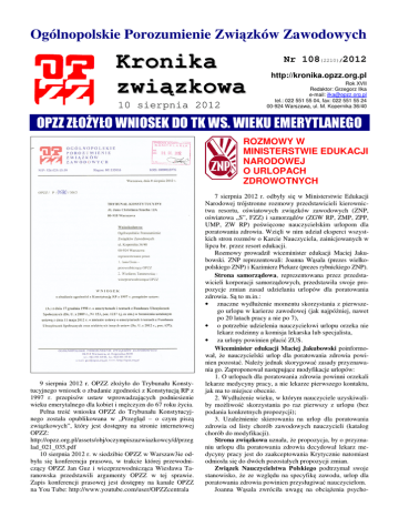 Ogólnopolskie Porozumienie Związków Zawodowych Kronika związkowa 10 sierpnia 2012 Nr 108(2210)/2012 http://kronika.opzz.org.pl Rok XVII Redaktor: Grzegorz Ilka e-mail: [email protected] tel.: 022 551 55 04, fax: 022 551 55 24 00-924 Warszawa, ul. M. Kopernika 36/40 OPZZ ZŁOŻYŁO WNIOSEK DO TK WS. WIEKU EMERYTLANEGO ROZMOWY W MINISTERSTWIE EDUKACJI NARODOWEJ O URLOPACH ZDROWOTNYCH 9 sierpnia 2012 r. OPZZ złożyło do Trybunału Konstytucyjnego wniosek o zbadanie zgodności z Konstytucją RP z 1997 r. przepisów ustaw wprowadzających podniesienie wieku emerytalnego dla kobiet i mężczyzn do 67 roku życia. Pełna treść wniosku OPZZ do Trybunału Konstytucyjnego została opublikowana w „Przegląd – o czym piszą związkowych”, który jest dostępny na stronie internetowej OPZZ: http://opzz.org.pl/assets/obj/oczympiszazwiazkowcy/d/przeg lad_021_035.pdf 10 sierpnia 2012 r. w siedzibie OPZZ w Warszaw3ie odbyła się konferencja prasowa, w trakcie której przewodniczący OPZZ Jan Guz i wiceprzewodnicząca Wiesława Taranowska przedstawili argumenty OPZZ w tej sprawie. Zapis konferencji prasowej jest dostępny na kanale OPZZ na You Tube: http://www.youtube.com/user/OPZZcentrala 7 sierpnia 2012 r. odbyły się w Ministerstwie Edukacji Narodowej trójstronne rozmowy przedstawicieli kierownictwa resortu, oświatowych związków zawodowych (ZNP, oświatowa „S”, FZZ) i samorządów (ZGW RP, ZMP, ZPP, UMP, ZW RP) poświęcone nauczycielskim urlopom dla poratowania zdrowia. Wzięli w nim udział eksperci wszystkich stron rozmów o Karcie Nauczyciela, zainicjowanych w lipcu br. przez resort edukacji. Rozmowy prowadził wiceminister edukacji Maciej Jakubowski. ZNP reprezentowali: Joanna Wąsala (prezes wielkopolskiego ZNP) i Kazimierz Piekarz (prezes rybnickiego ZNP). Strona samorządowa, reprezentowana przez przedstawicieli korporacji samorządowych, przedstawiła swoje propozycje zmian zasad udzielania urlopów dla poratowania zdrowia. Są to m.in.: • znaczne wydłużenie momentu skorzystania z pierwszego urlopu w karierze zawodowej (jak najpóźniej, nawet po 20 latach pracy a nie po 7), • o potrzebie udzielenia nauczycielowi urlopu orzeka nie lekarz rodzinny a komisja lekarska lub specjalista, • za urlopy powinien płacić ZUS. Wiceminister edukacji Maciej Jakubowski poinformował, że nauczycielski urlop dla poratowania zdrowia powinien pozostać. Należy jednak skorygować zasady przyznawania go. Zaproponował następujące modyfikacje urlopów: 1. O urlopach dla poratowania zdrowia powinni orzekali lekarze medycyny pracy, a nie lekarze pierwszego kontaktu, jak ma to miejsce obecnie. 2. Wydłużenie wieku, w którym nauczyciele uzyskiwaliby możliwość skorzystania po raz pierwszy z urlopu (bez podania konkretnych propozycji); 3. Uzależnienie skierowania na urlop dla poratowania zdrowia od listy chorób zawodowych nauczycieli (katalog chorób do modyfikacji). Strona związkowa uznała, że propozycja, by o przyznaniu urlopu dla poratowania zdrowia decydował lekarz medycyny pracy jest do zaakceptowania Krytycznie natomiast odniosła się do dwóch pozostałych propozycji zmian. Związek Nauczycielstwa Polskiego podtrzymał swoje stanowisko, że ze względu na specyfikę zawodu, urlop dla poratowania zdrowia powinien przysługiwać nauczycielom. Joanna Wąsala zwróciła uwagę na obciążenia psycho- Kronika związkowa nr 108(2210)/2012 – strona 2 fizyczne w zawodzie nauczyciela i ich wpływ na zdrowie, co przekłada się ujemnie na jakość ich życia oraz jakość świadczonej przez nich pracy. A także na ograniczony dostęp nauczycieli do leczenia foniatrycznego i sanatoryjnego. Podkreśliła, że propozycja kierowania na urlop tylko w przypadku chorób zawodowych znacznie ograniczy możliwość skorzystania z niego. – Dziś za chorobę zawodową nauczycieli uznaje się schorzenia narządów głosu, a co z wypaleniem zawodowym, co z kontuzjami nauczycieli wychowania fizycznego – mówiła. Dodała, że propozycja, by o przyznaniu urlopu dla poratowania zdrowia decydował lekarz medycyny pracy jest do rozważenia, jednak ostateczną decyzję w tej sprawie podejmą ciała statutowe ZNP. Kazimierz Piekarz zaapelował, aby w dyskusji o zasadach przyznawania urlopów zdrowotnych, brać pod uwagę badania ekspertów, m.in. z Instytutu Medycyny Pracy. Powołał się na publikację autorstwa Jacka Pyżalskiego i Doroty Merecz „Psychospołeczne warunki pracy polskich nauczycieli. Pomiędzy wypaleniem zawodowym a zaangażowaniem” (Kraków 2010), która opisuje czynniki psychospołeczne występujące w środowisku pracy nauczyciela i analizuje ich wpływ m.in. na relację nauczyciel – uczeń. Następne spotkanie w sprawie ustawy Karta Nauczyciela zaplanowano na koniec sierpnia. Ma ono dotyczyć nauczycielskich wynagrodzeń. ________________________________________________ APEL DO ORGANIZACJI ZWIĄZKOWYCH W POLSCE Już po raz drugi w ostatnim czasie (w dniu 25 czerwca 2012 r. i 6 sierpnia 2012 r.) przedstawiciele Organizacji Związkowych obejmujących zakresem podmiotowego działania Spółki Grupy Kapitałowej CIECH spotkali się w ramach Komisji Trójstronnej branży chemicznej w zespole konsultacyjnym ds. tej grupy. Głównym tematem spotkań jest sytuacja ekonomiczno finansowa Spółki matki i obecne oddziaływanie jej na Spółki córki. Pomysły nowo wybranego Zarządu CIECH są według związkowców próbą reanimacji „denata” kosztem Spółek Córek. Do obecnego stanu, stanu tragicznego, balansującego według przekazywanych nam informacji na granicy upadłości CIECH, doprowadzili w okresie kilku ostatnich lat decydenci Ciechu. Obecny Zarząd Spółki CIECH próbuje wmówić związkowcom, że tylko poprzez drastyczne oszczędności w spółkach córkach, (zwalnianie pracowników, wypowiadanie ZUZP, obniżanie wynagrodzeń itp.) może być powstrzymany upadek całej Grupy Kapitałowej CIECH. Z poprzedniego spotkania posiadamy sprawozdanie. a z ostatniego 
